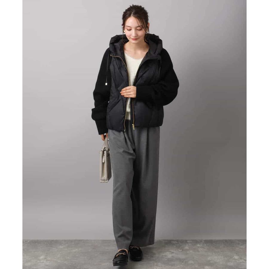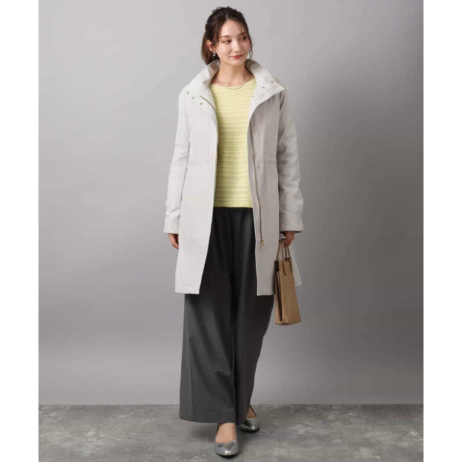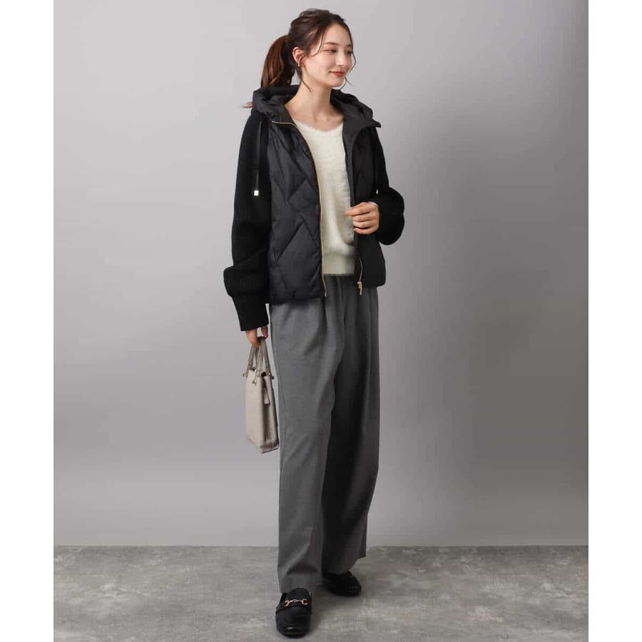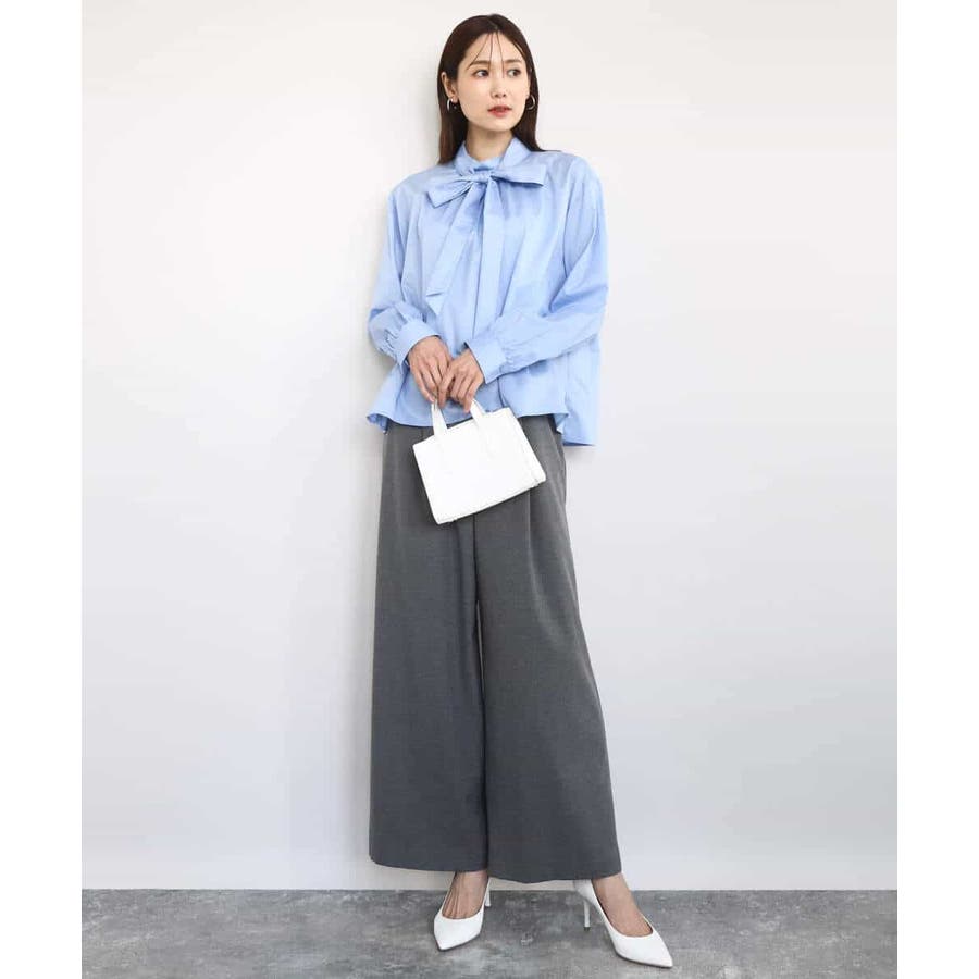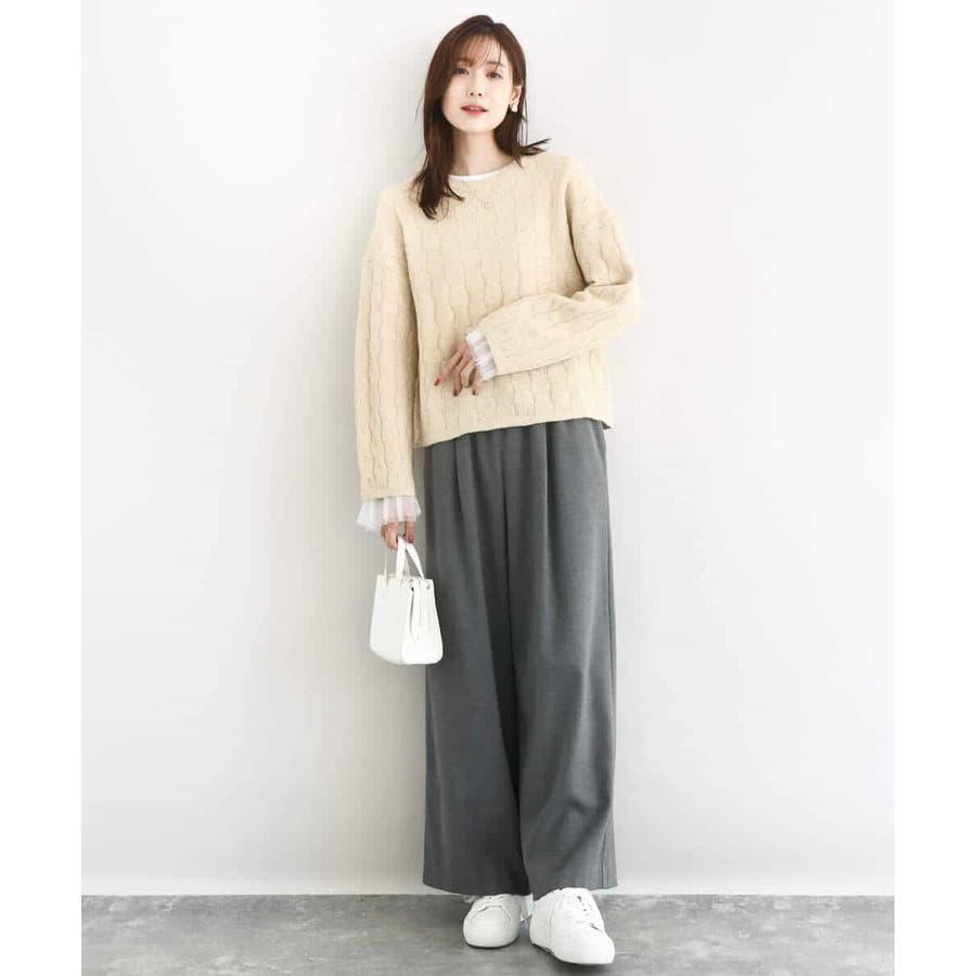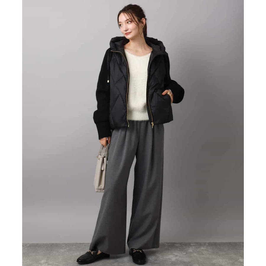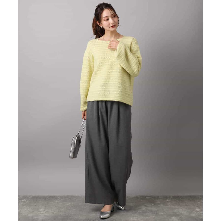 紐でウエストを調節できるタイプのプルオンパンツは、トップスをアウトで着こなすときれいめシーンにも対応可能。フルレングスのワイドパンツはショートブーツともバランスよく決まります。