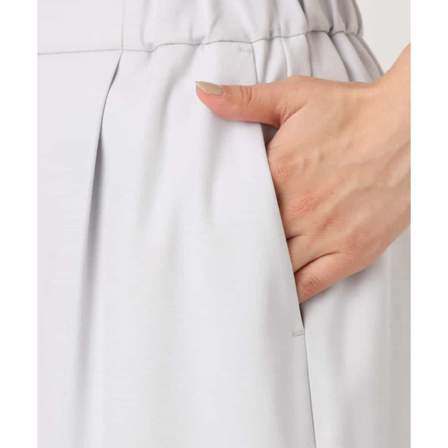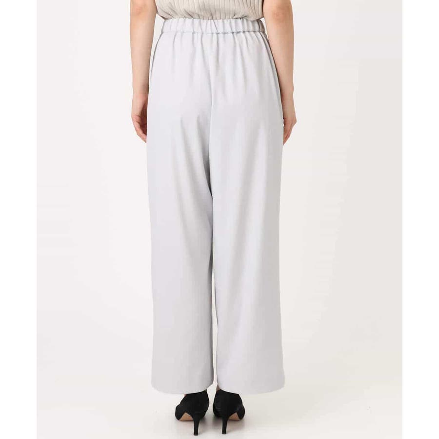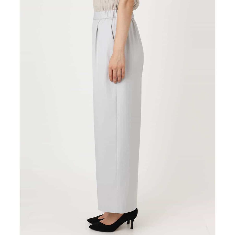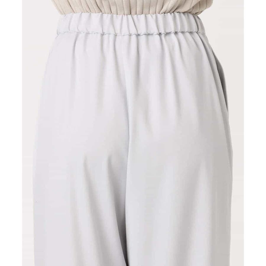 プルオンタイプでラクな履き心地ながらきれいなシルエットが特徴のワイドパンツ。ウエストベルトのフロント部分はゴムギャザーの寄らない仕様で、トップスをインしたときにきれいめに着こなせます。
