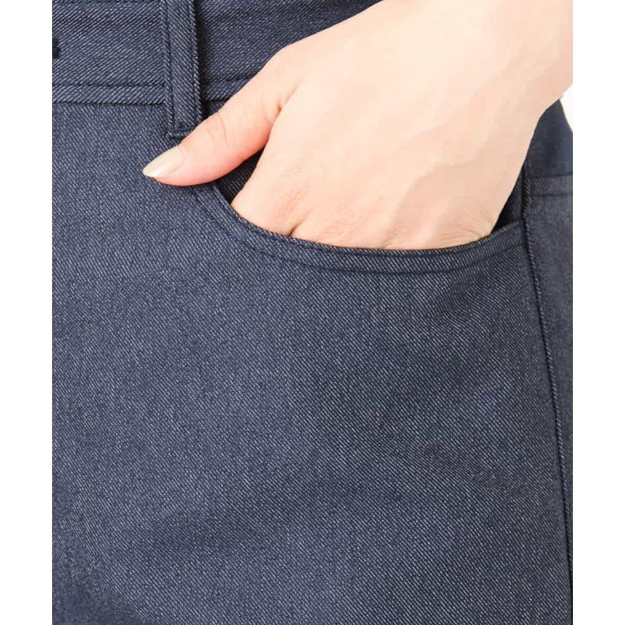 デニムのようなルックスのポリエステル素材を使用。しなやかで程よいハリ・コシ感と、適度なストレッチ性が特徴。本物のデニムのように色落ちすることなく、着用ジワやピリングも起こりにくい素材です。
