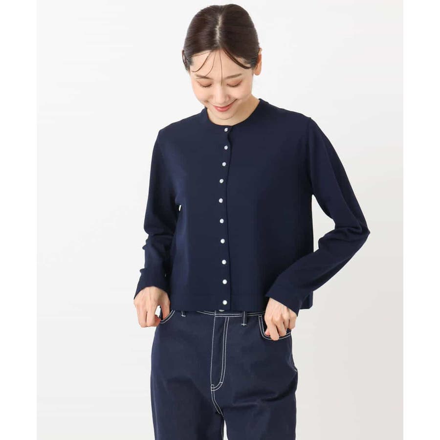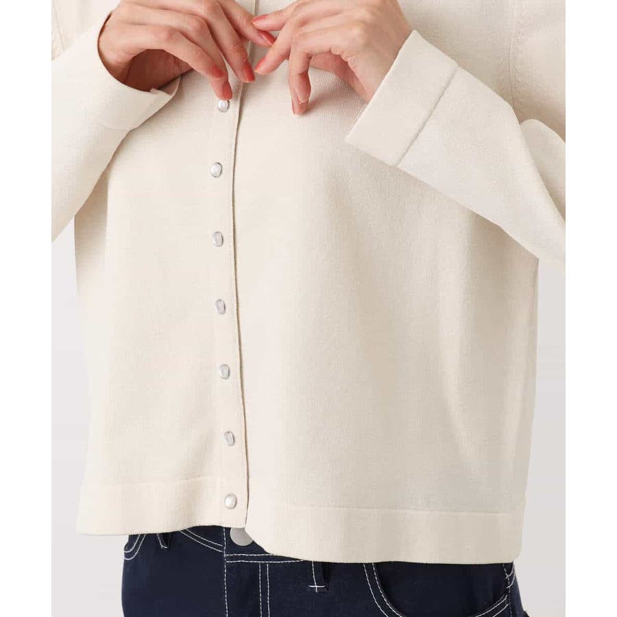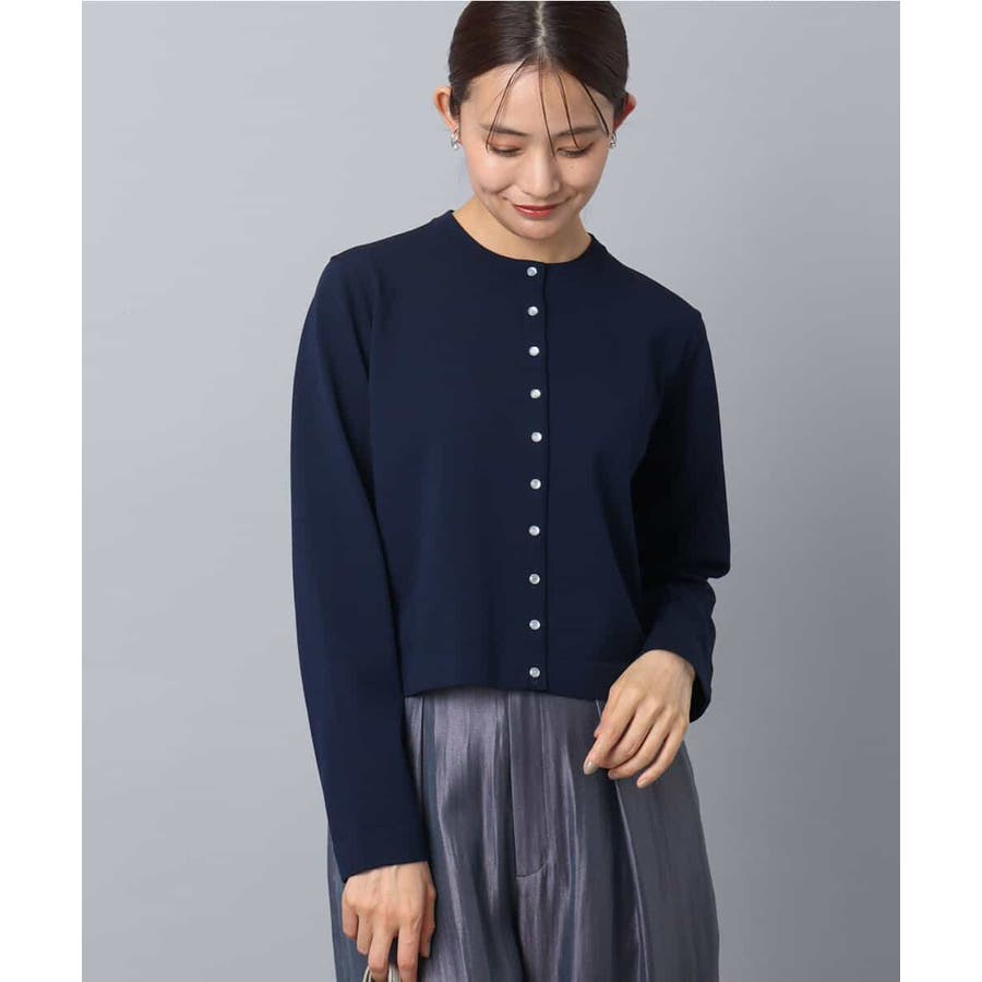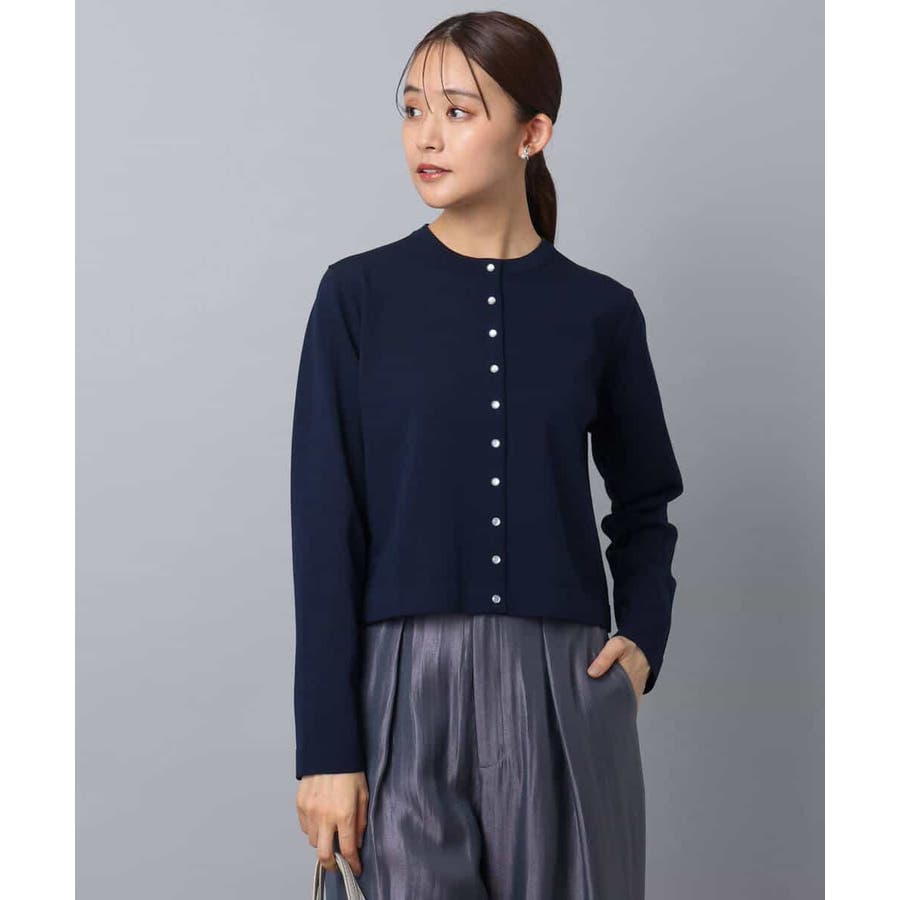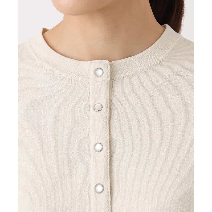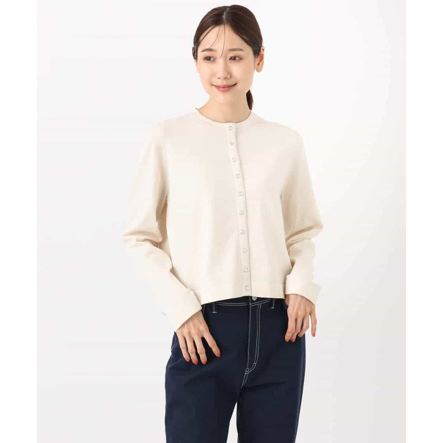 前立てに並んだドット釦がデザインポイントのニットカーディガン。シンプルなクルーネックデザインとコンパクトなサイズ感で、シーンを選ばずに活躍してくれます。