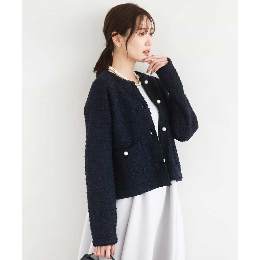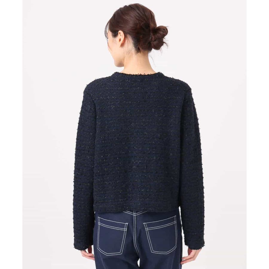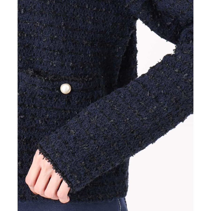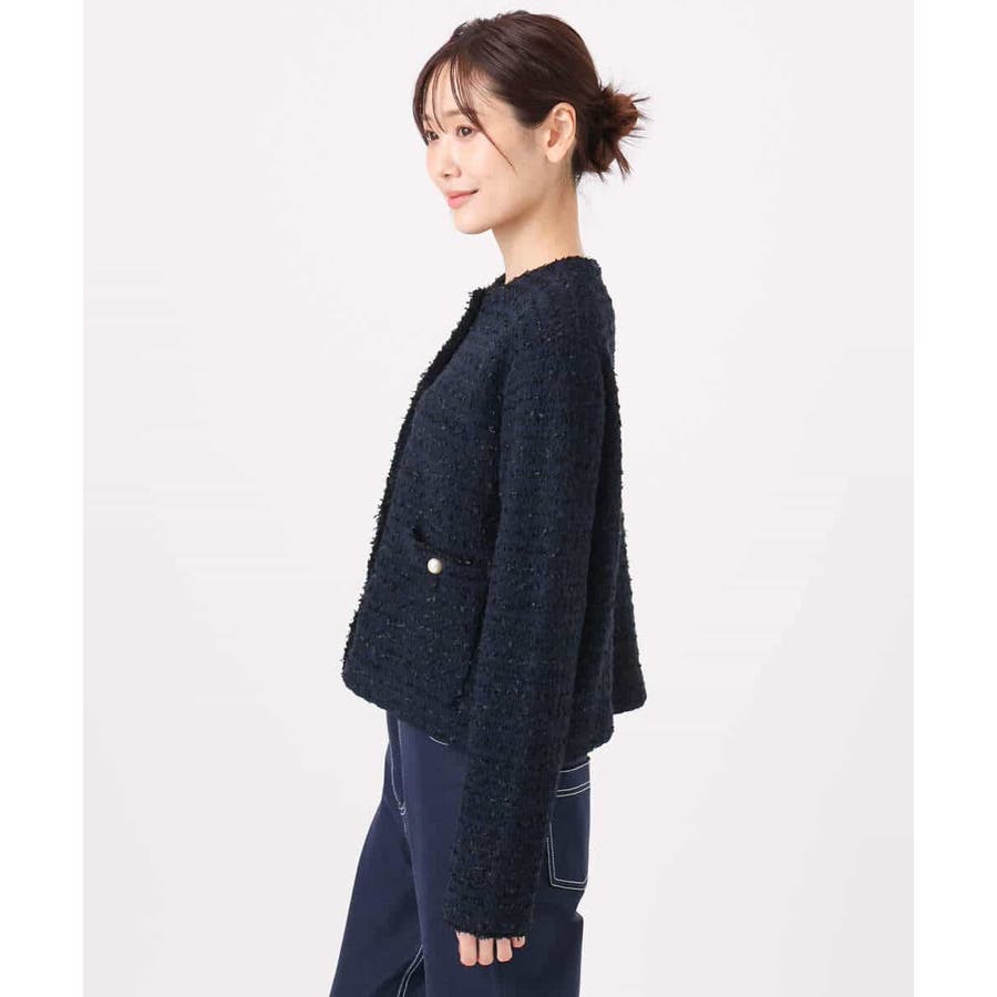 ニットのツイード編みジャケット。ツイードジャケットのきちんとした見た目を保ちながらも、ニットならではの伸縮性で気負わず着用できるのが魅力のアイテムです。