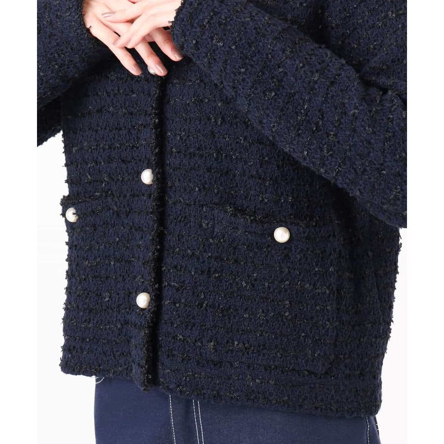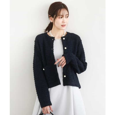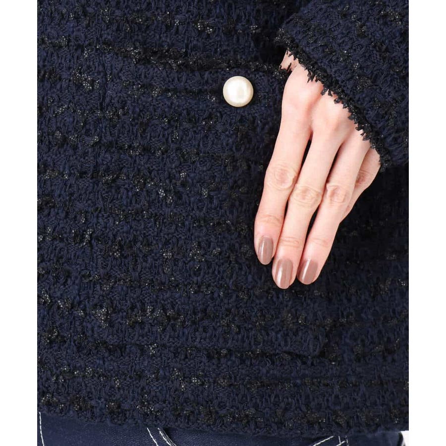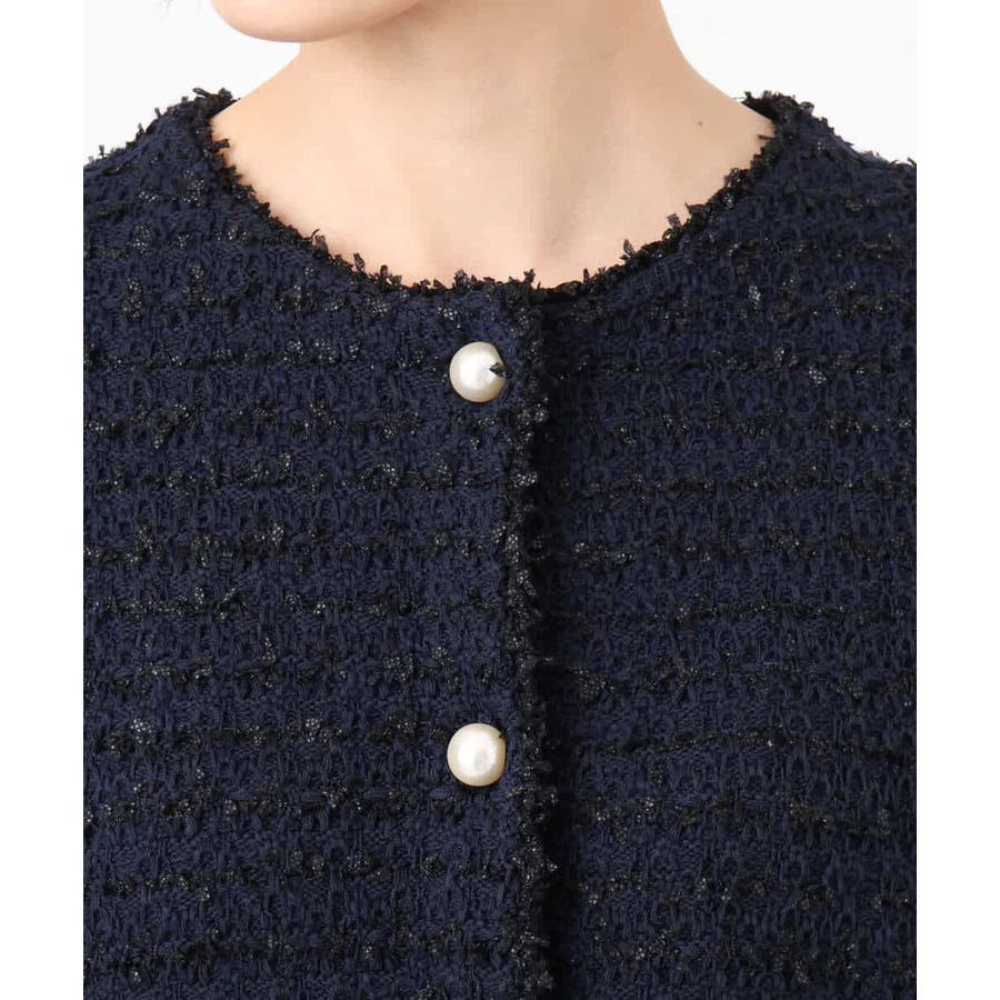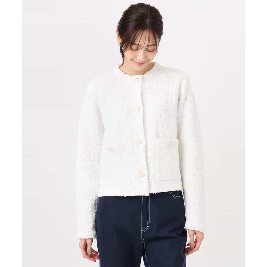 ニットのツイード編みジャケット。ツイードジャケットのきちんとした見た目を保ちながらも、ニットならではの伸縮性で気負わず着用できるのが魅力のアイテムです。