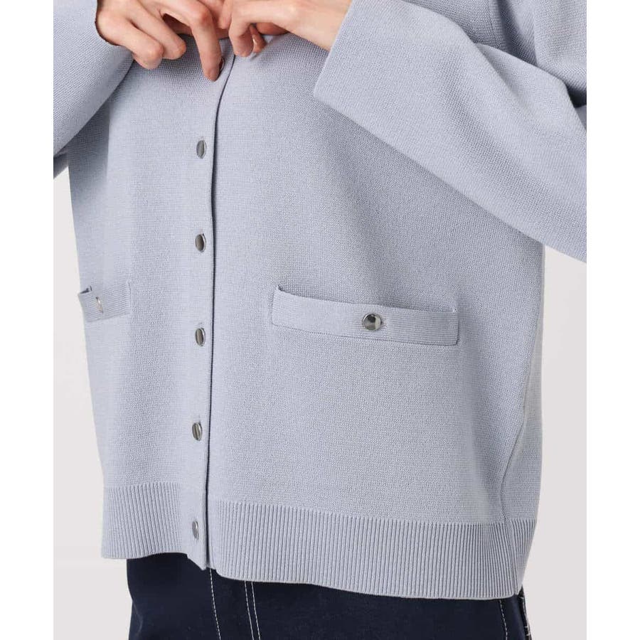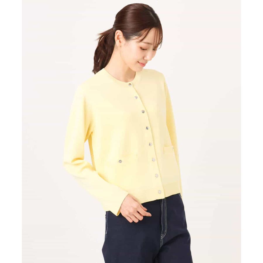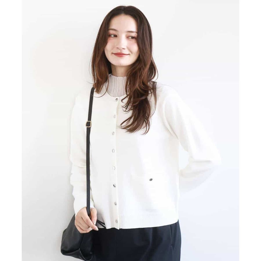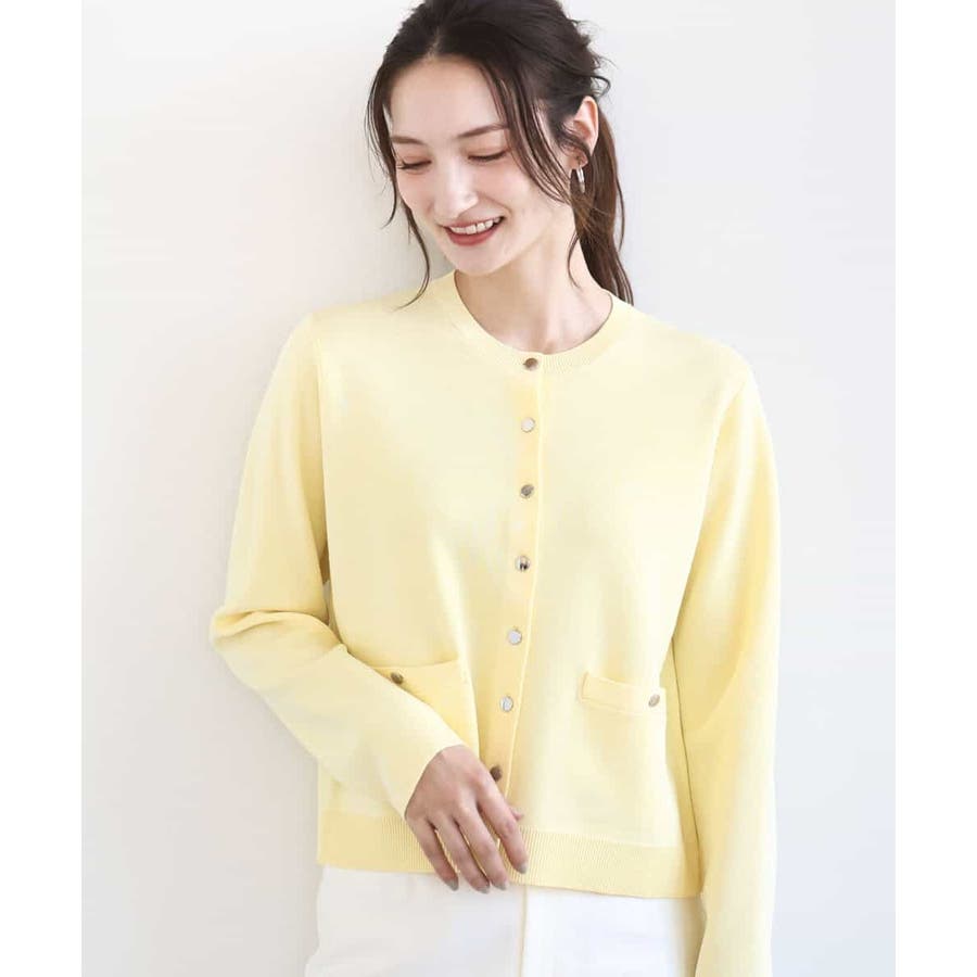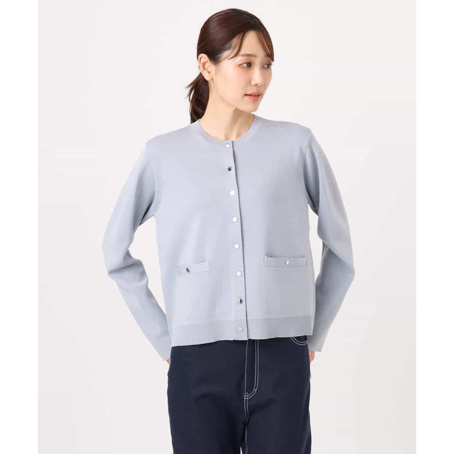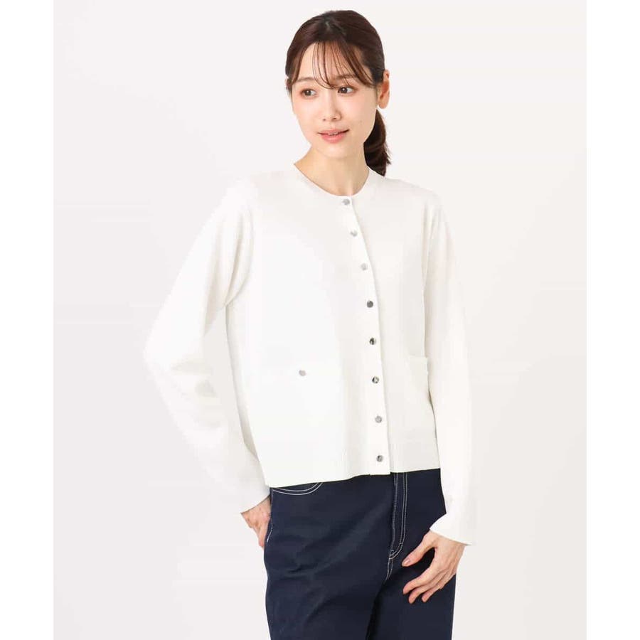 コンパクトな着丈にすっきりとしたシルエットがきちんとさのあるニットカーディガン。ジャケットライクなポケットディティールやシルバーの小さめなメタル釦を並べたデザインはフレンチなイメージにもぴったり。