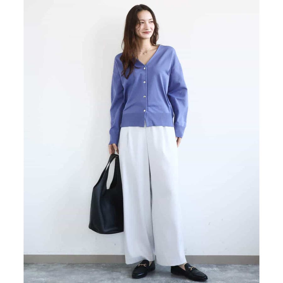 羽織っても、前を閉じてプルオーバーとしても決まるカーディガンは1着で着こなしの幅を楽しめる優れもの。Vネックはやや深めになるのでインナーはマスト。肌寒い時期はシャツやハイネックなどの長袖インナーと組み合わせも楽しめます。
