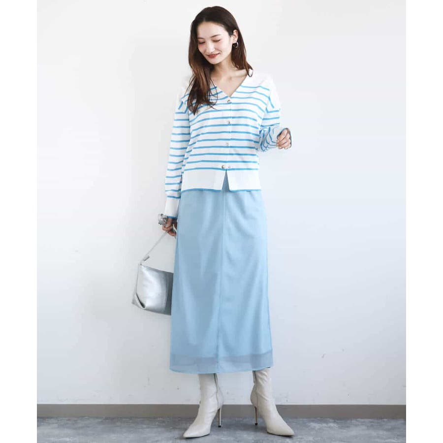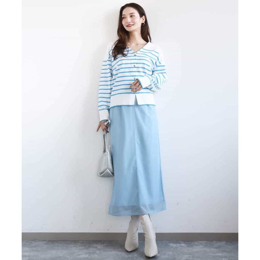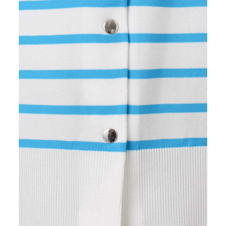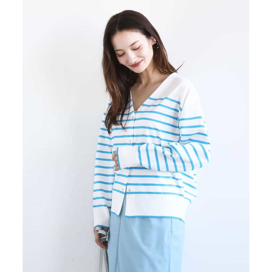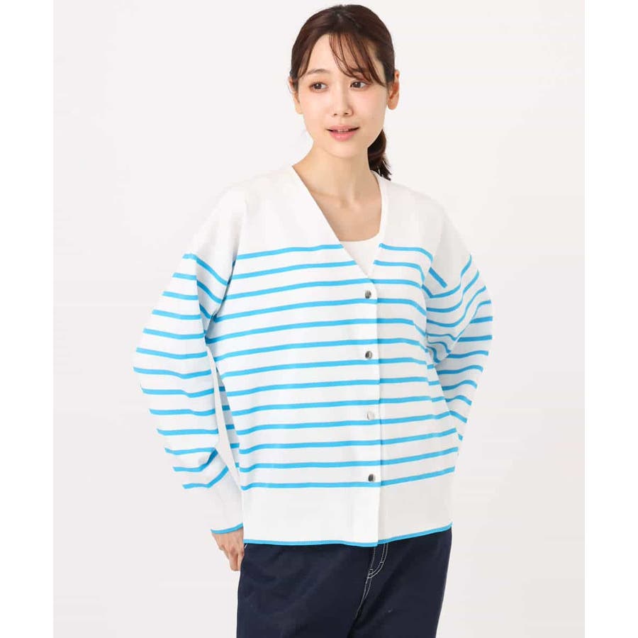 肌離れの良いさらっとしたニット素材で、シーズンレスで着こなせそうなカーディガン。広めに開いたVネックですが、インナーはギリギリ見え隠れする程度で一枚で女性らしく、シャツを重ねてレイヤードを楽しんでも素敵です。肩の落ちたデザインに、身頃もゆったりめでラクな着心地。タイトめなスカートやパンツと相性良く着こなせると思います。ホワイト×ブルーの色味は、真っ白にやや蛍光のようなブルーが映えてさわやかに。細めのボーダーなのでカジュアルすぎずに着こなせると思います。