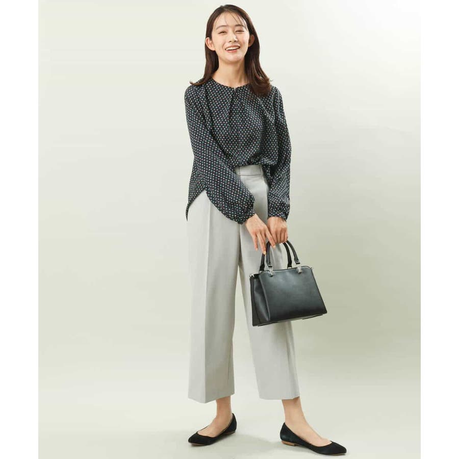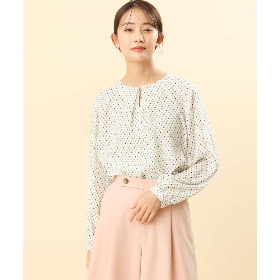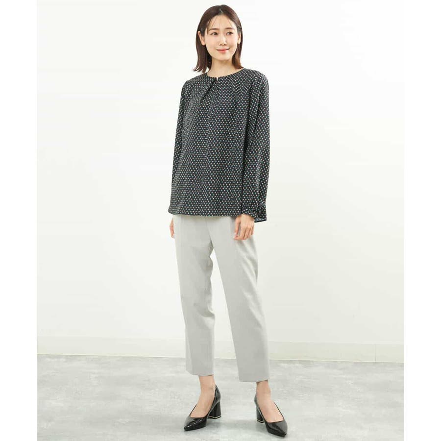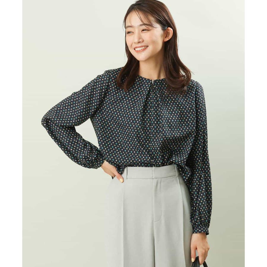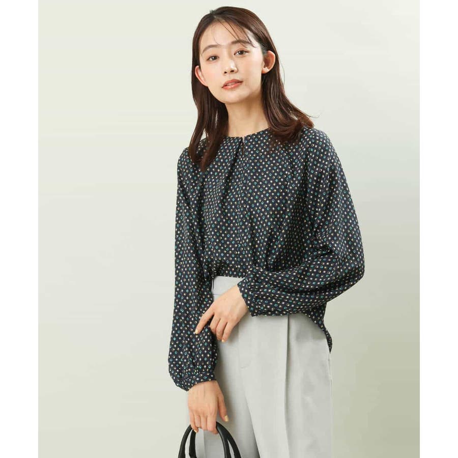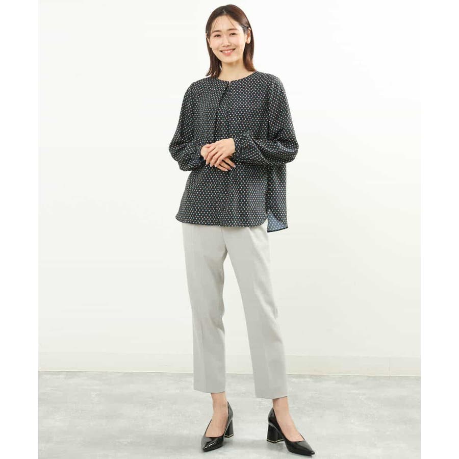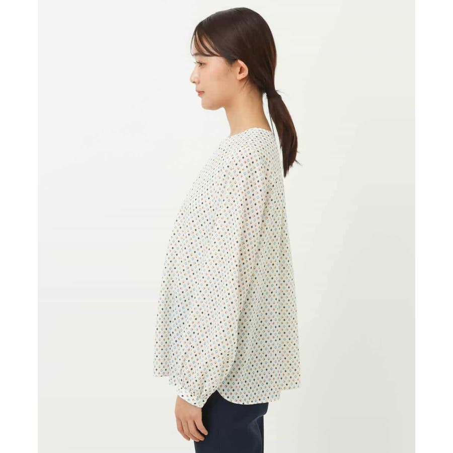お仕事シーンにもちょうどいいプリントブラウスはシンプルなボトムと合わせても地味になりすぎず上品な華やかさをプラスしてくれます。ジャケットやカーディガンも合わせやすいシルエットはシーズン問わず活躍してくれそう。