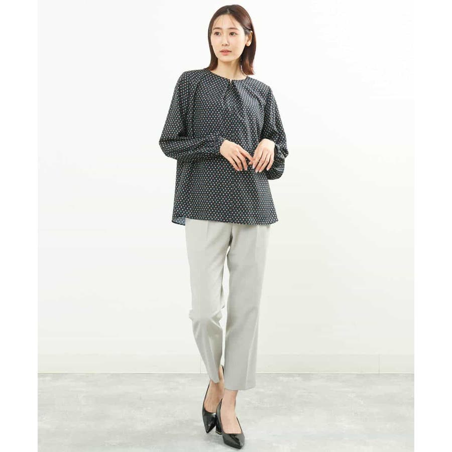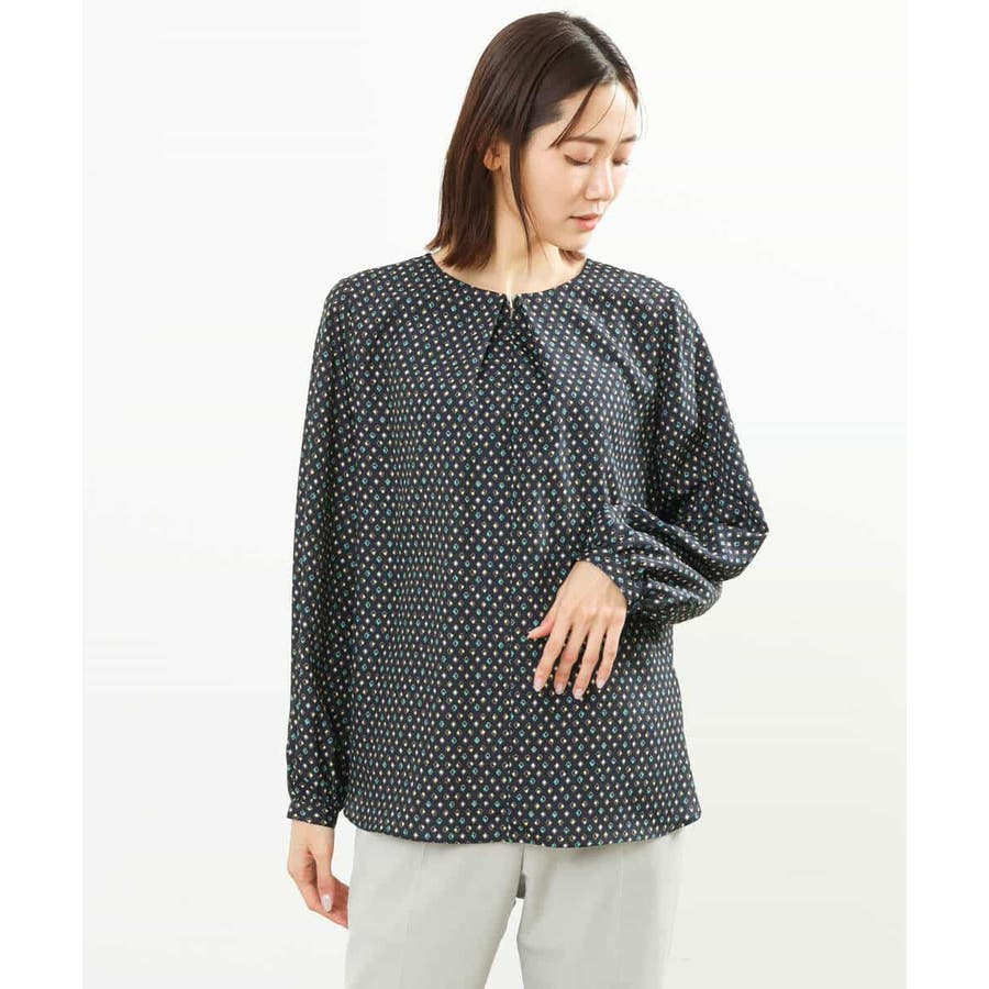 細かなダイヤドット柄が派手すぎず、お仕事にも合わせやすいブラウスです。前にメタルホックがあり、着脱もしやすく、シワにもなりにくいのでお手入れも楽です!