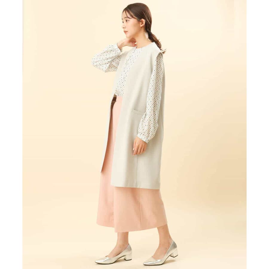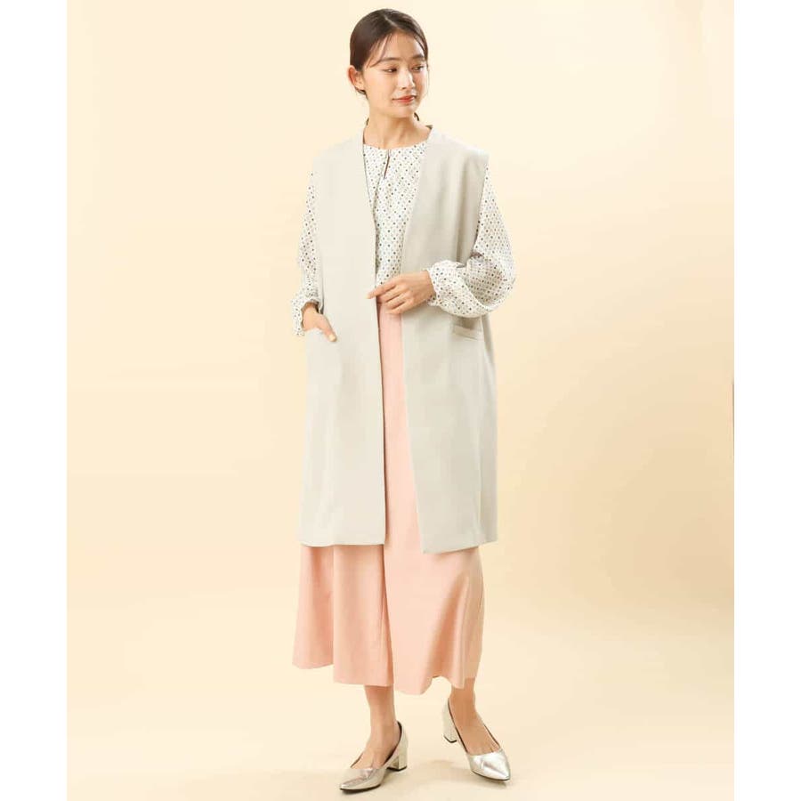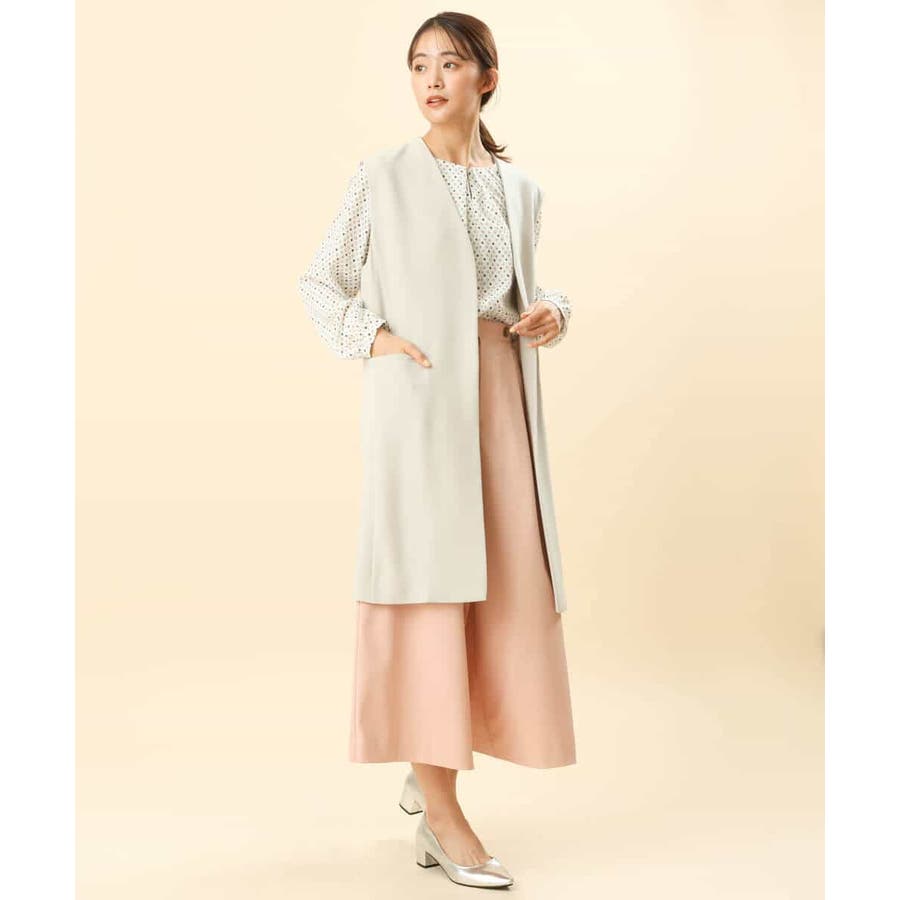 さらりとしたポリエステル100の素材はシワになりにくく扱いやすい優秀素材。お仕事に最適なきちんとした印象の見え感です。