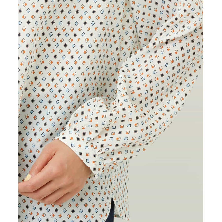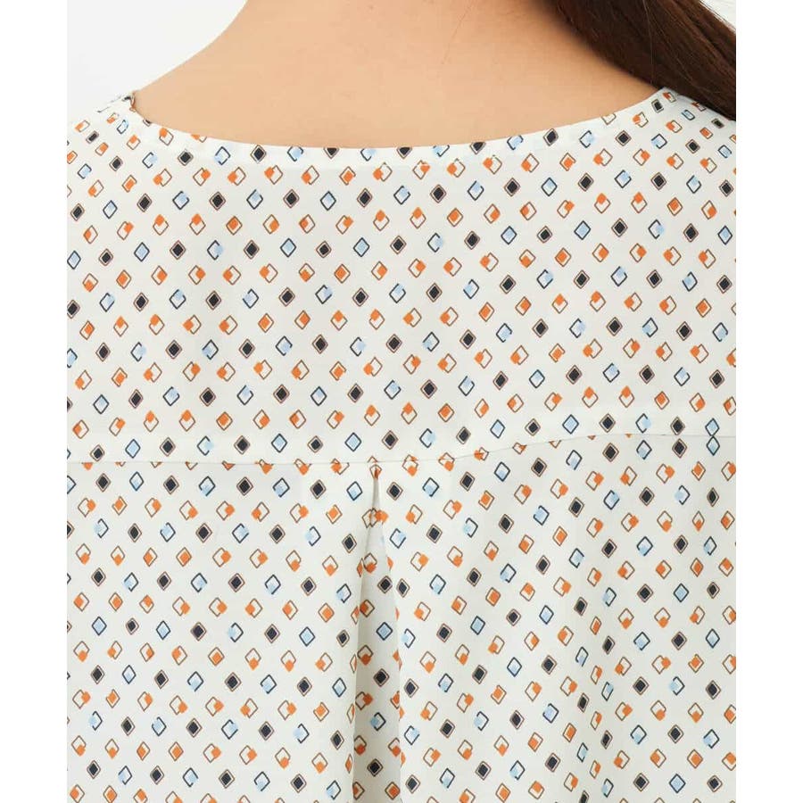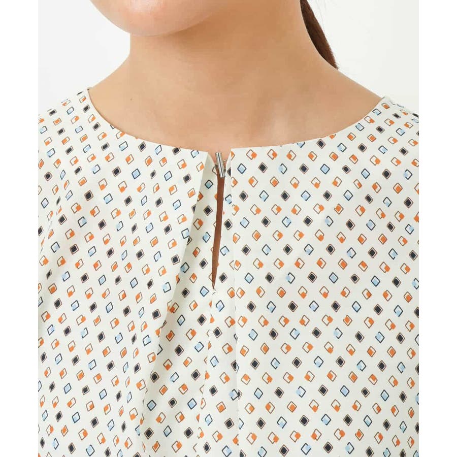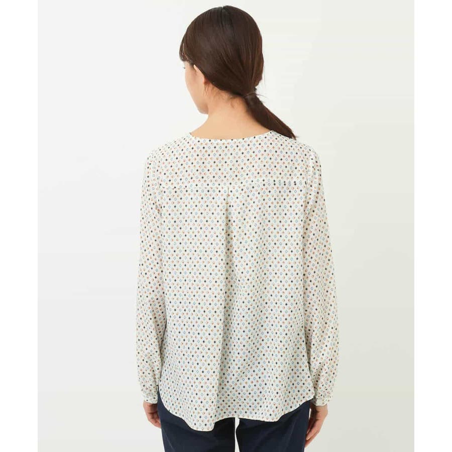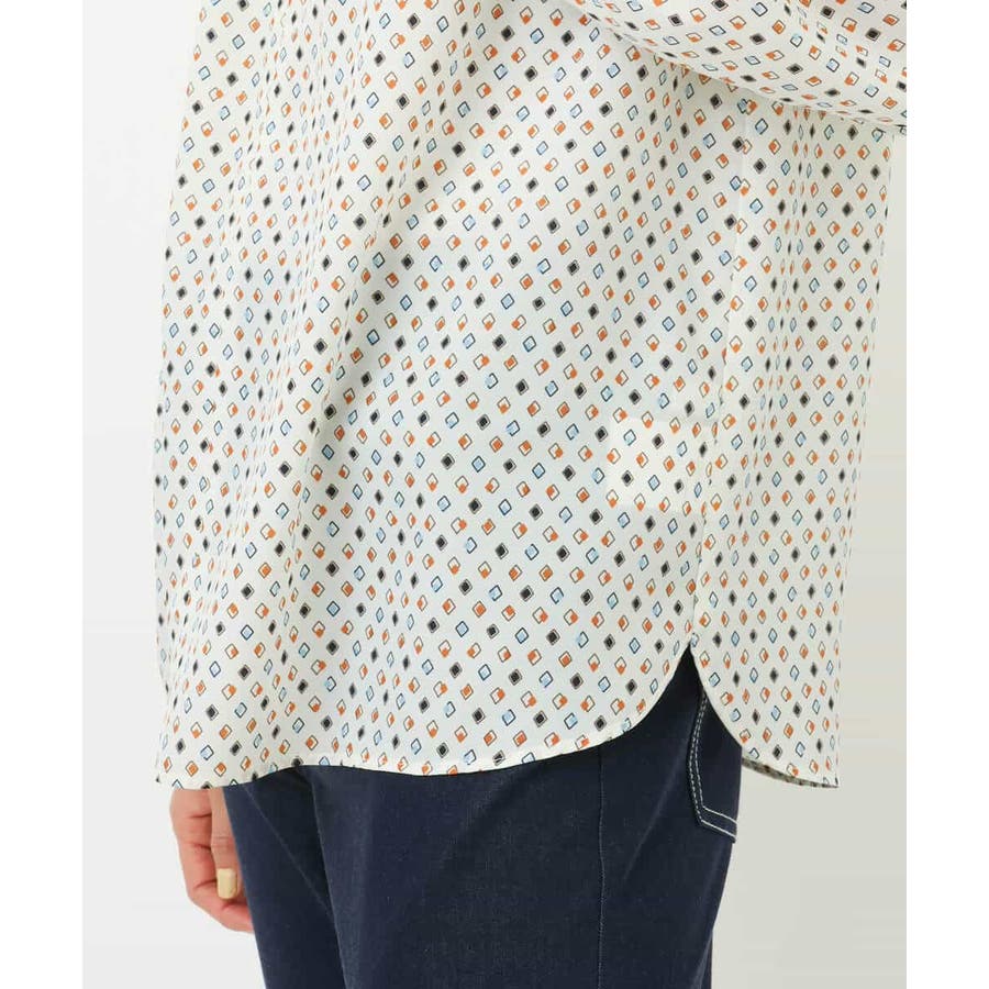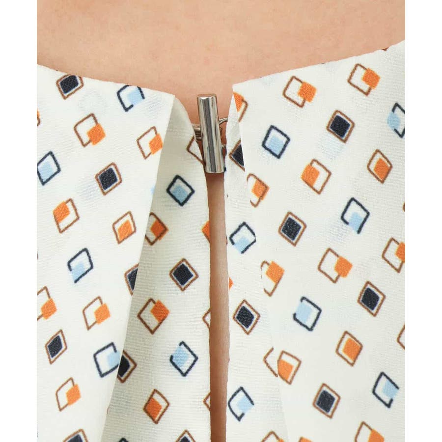 ダイヤ柄モチーフが散りばめられたような幾何学柄が印象的なプリントブラウス。フロントのメタルホックのワンポイントはデザイン性がありながらも、脱ぎ着がラクなのも嬉しい。