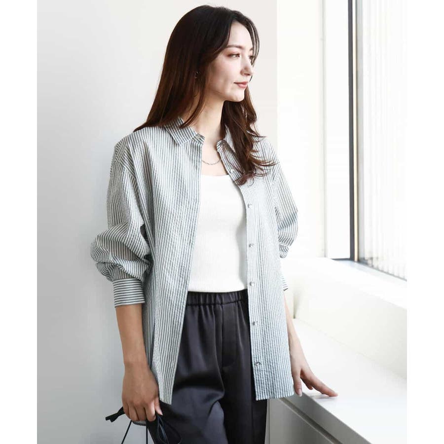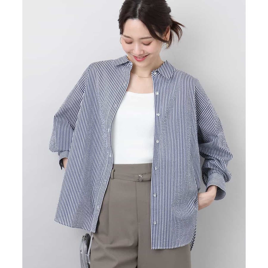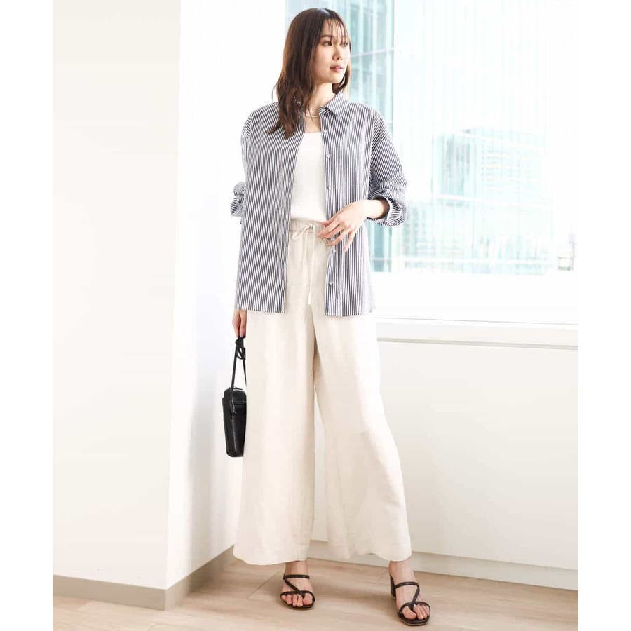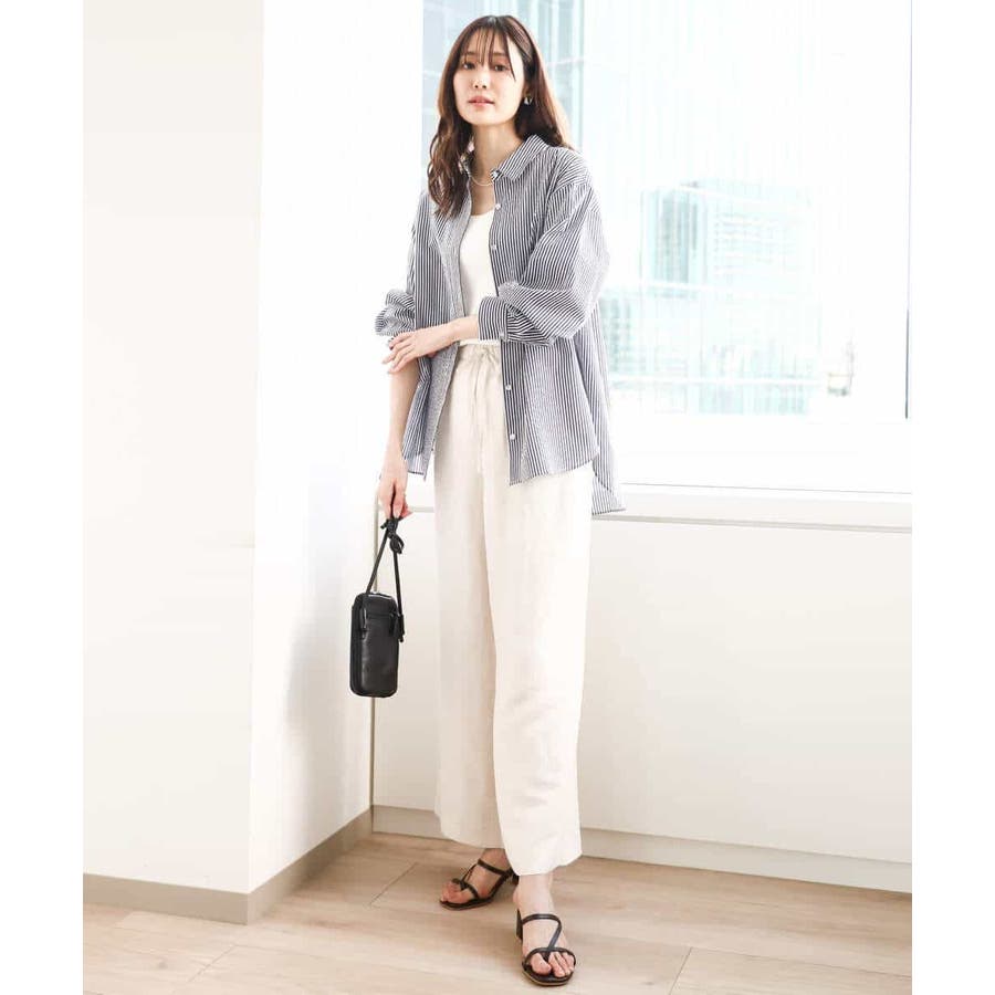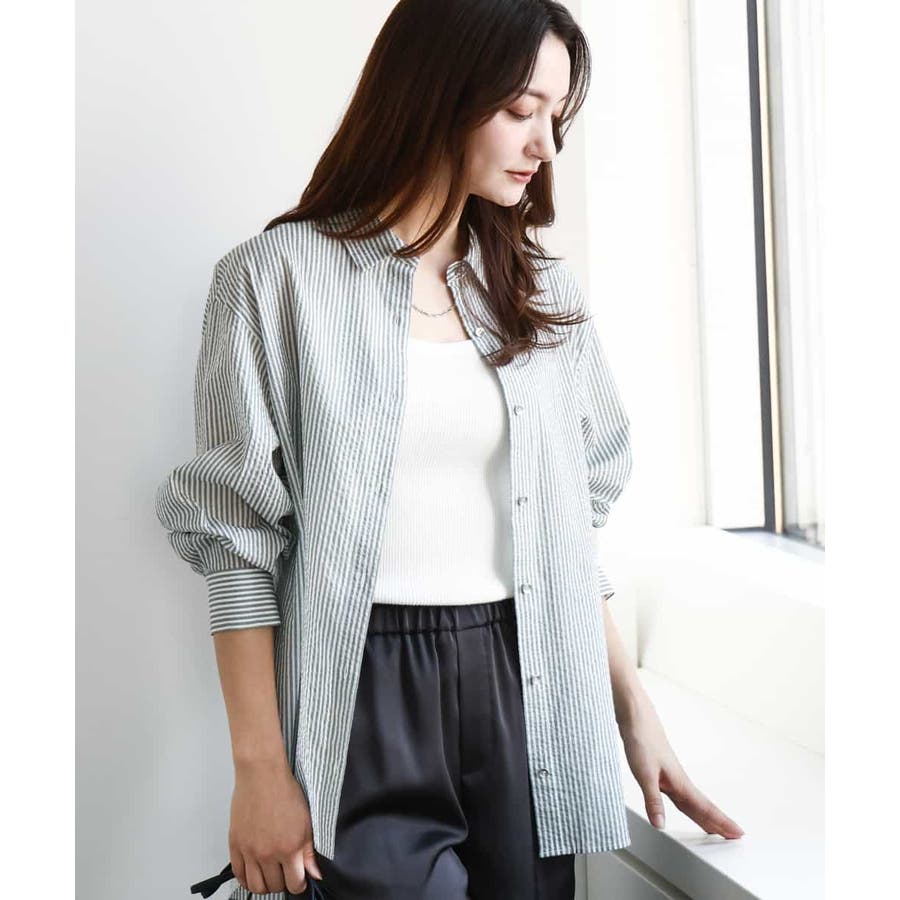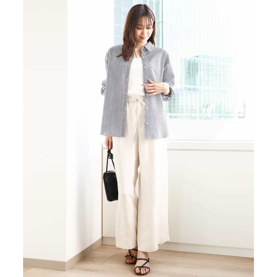 タンクトップやTシャツの上にさっと気軽に羽織っても素敵な着こなしに。細いストライプ柄はアクセントになりながらコーデの邪魔をしないので、着回し力が高いのも魅力。羽織りとしても一枚着としてもシーズンレスで重宝するアイテムです。