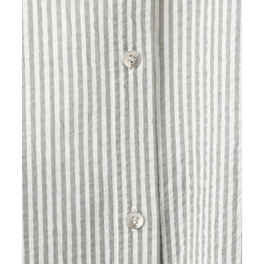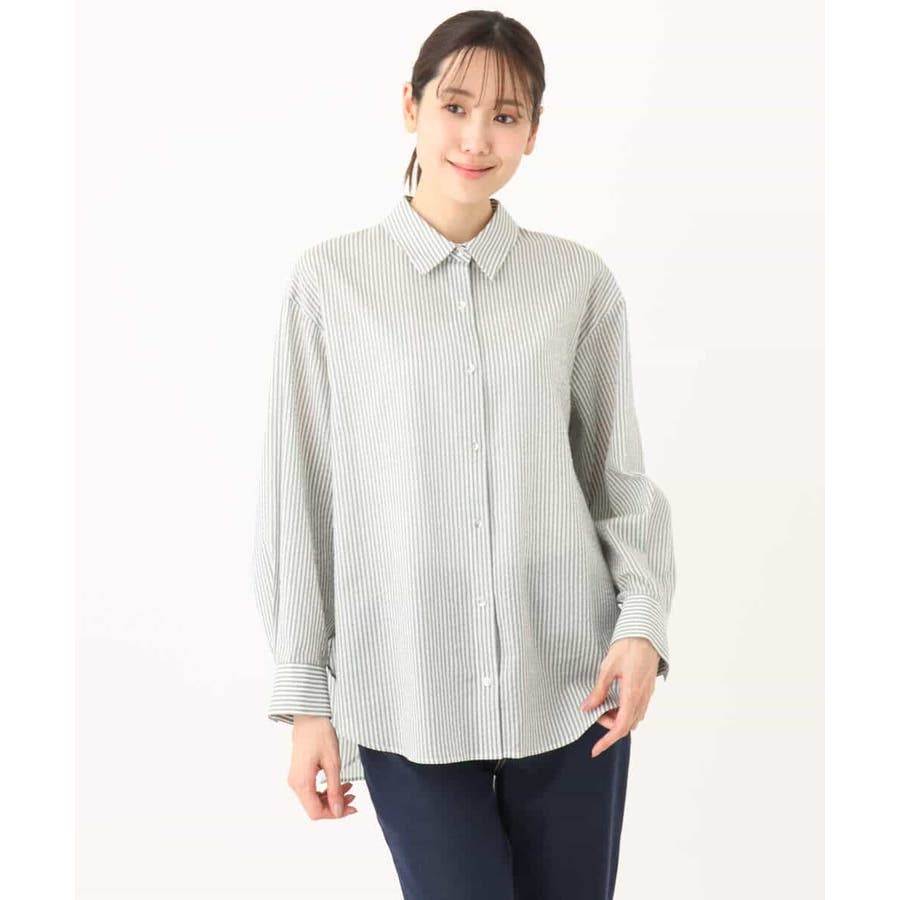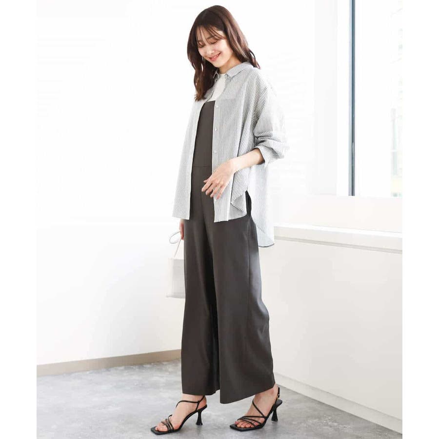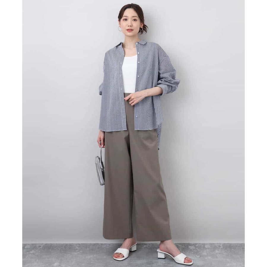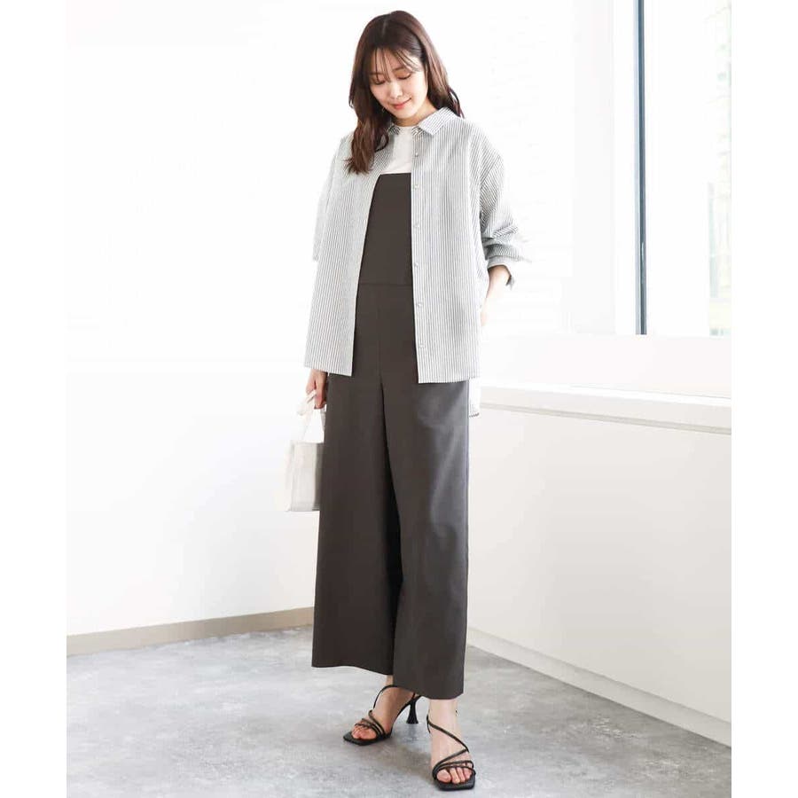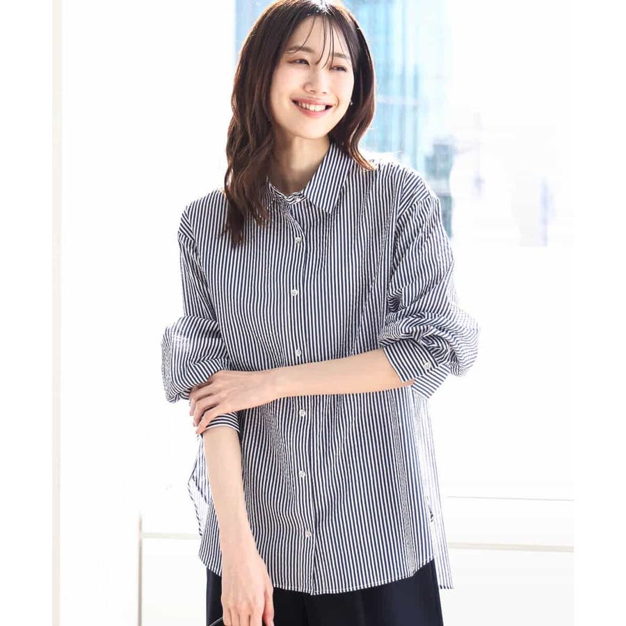 タンクトップやTシャツの上にさっと気軽に羽織っても素敵な着こなしに。細いストライプ柄はアクセントになりながらコーデの邪魔をしないので、着回し力が高いのも魅力。羽織りとしても一枚着としてもシーズンレスで重宝するアイテムです。