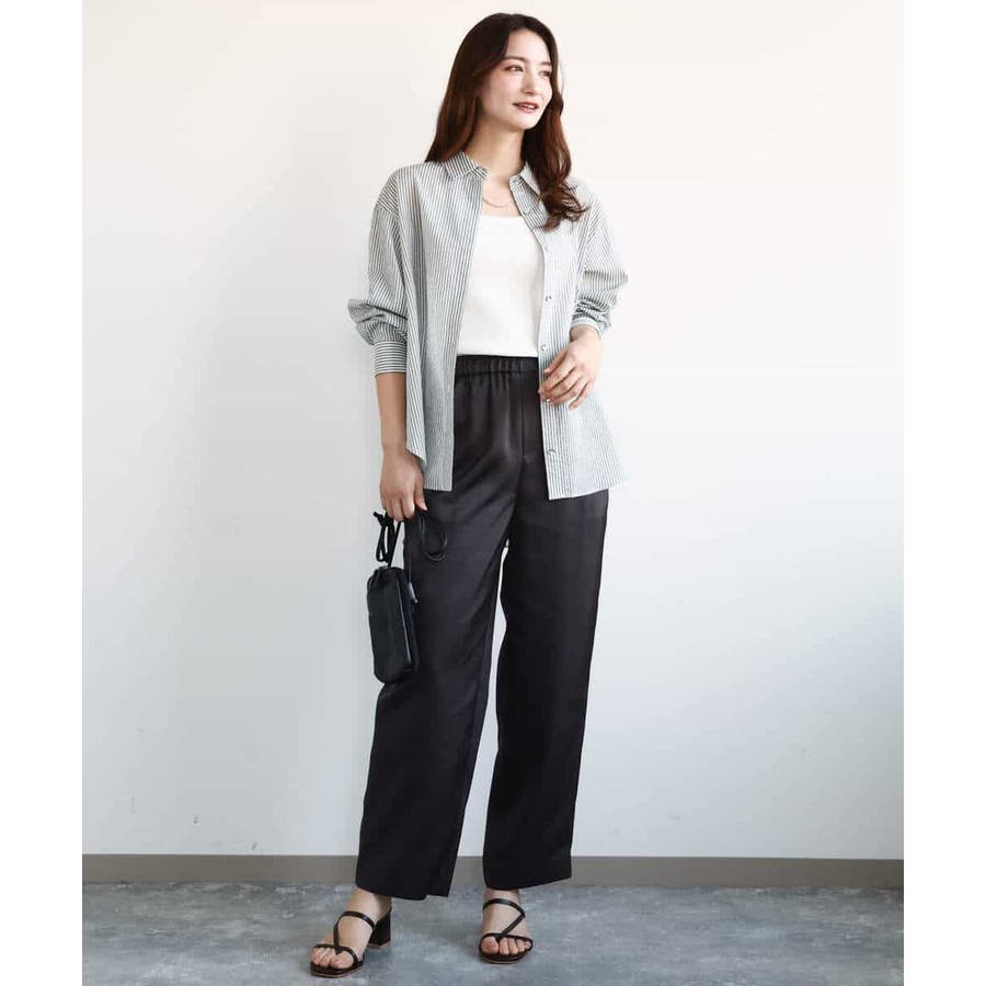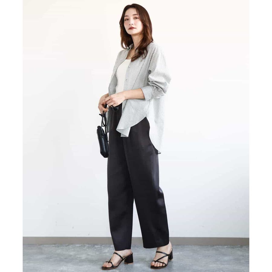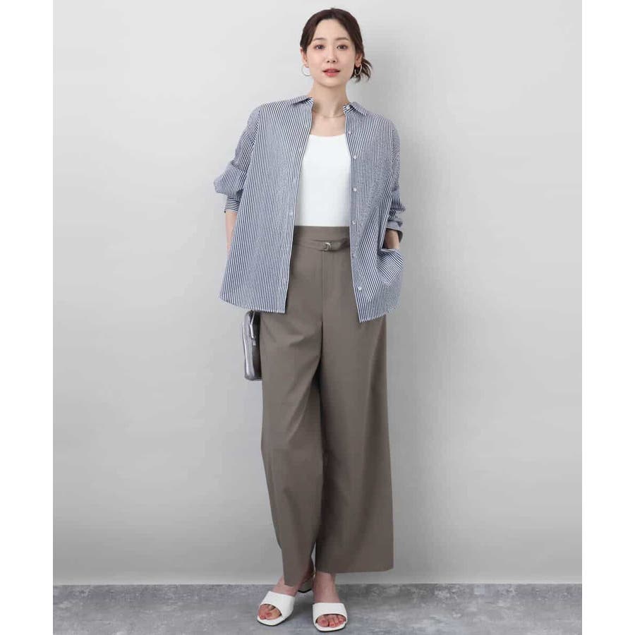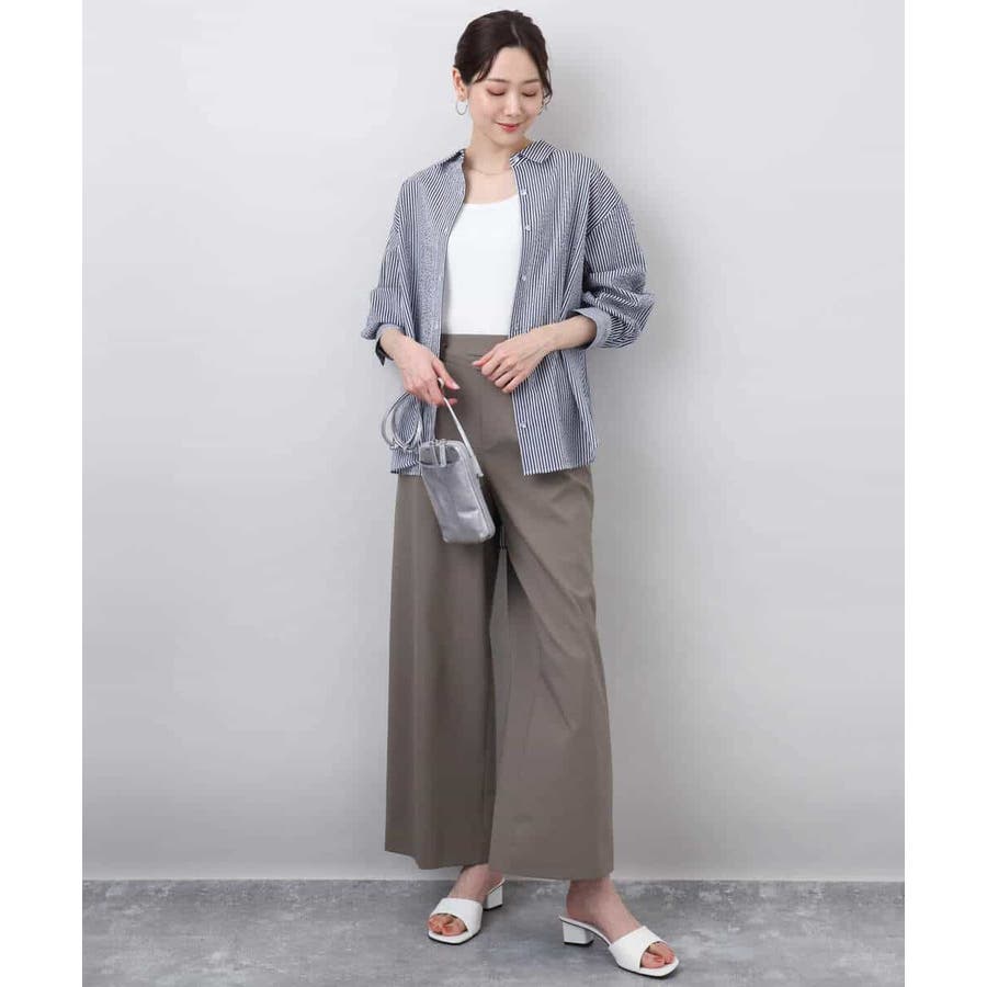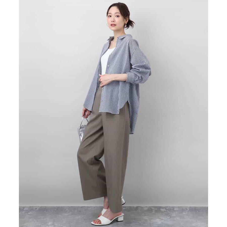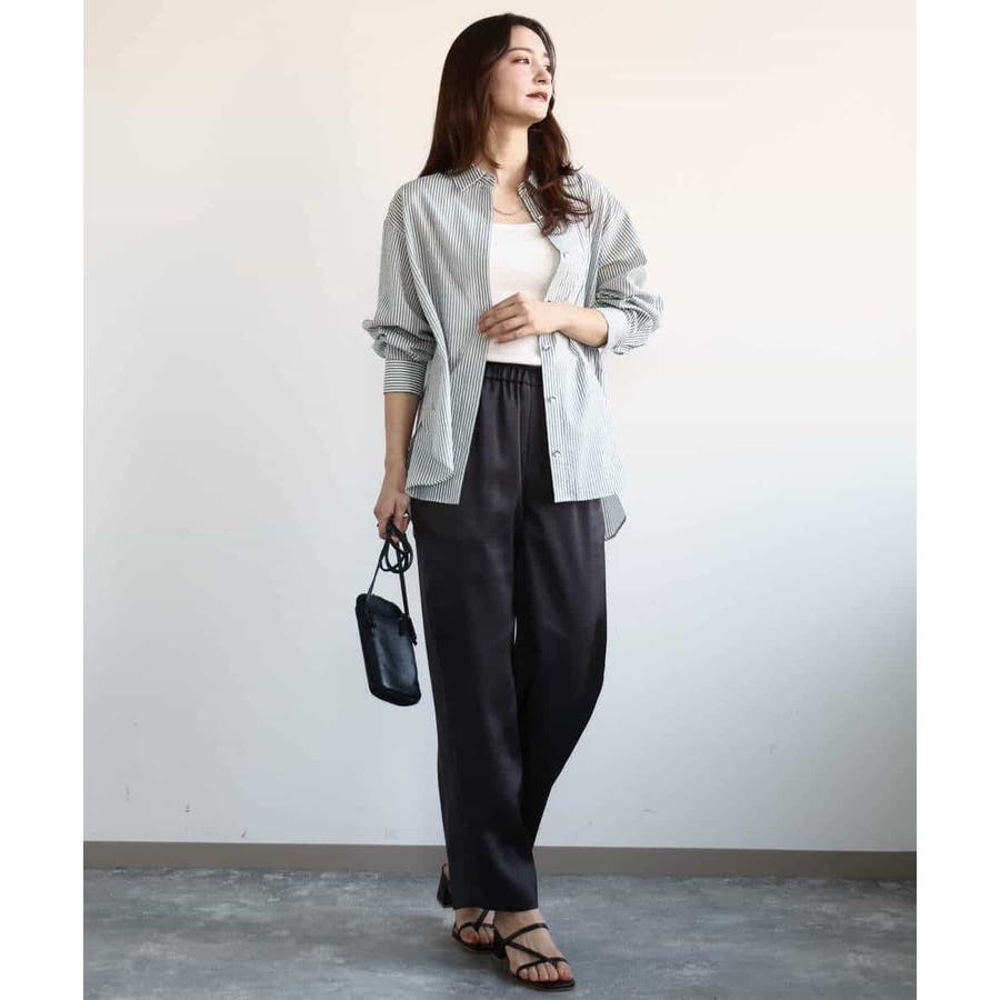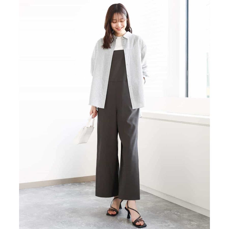 タンクトップやTシャツの上にさっと気軽に羽織っても素敵な着こなしに。細いストライプ柄はアクセントになりながらコーデの邪魔をしないので、着回し力が高いのも魅力。羽織りとしても一枚着としてもシーズンレスで重宝するアイテムです。