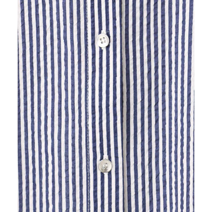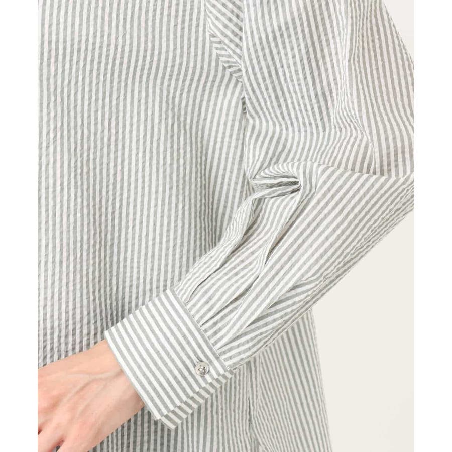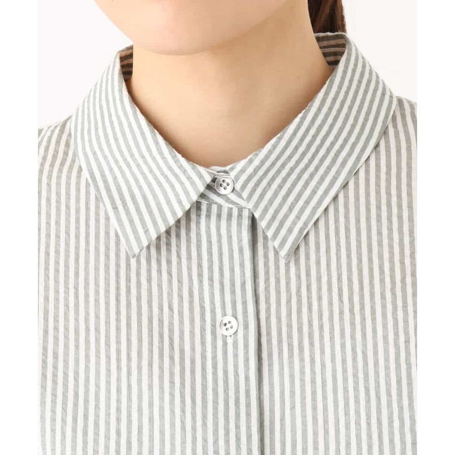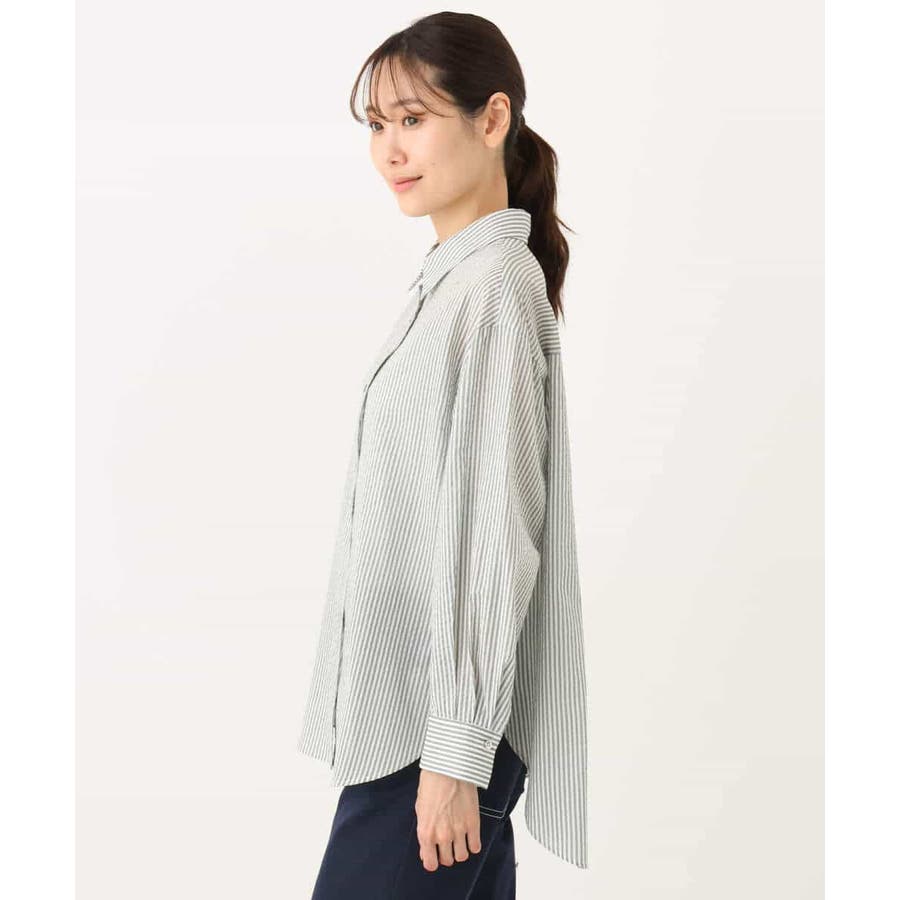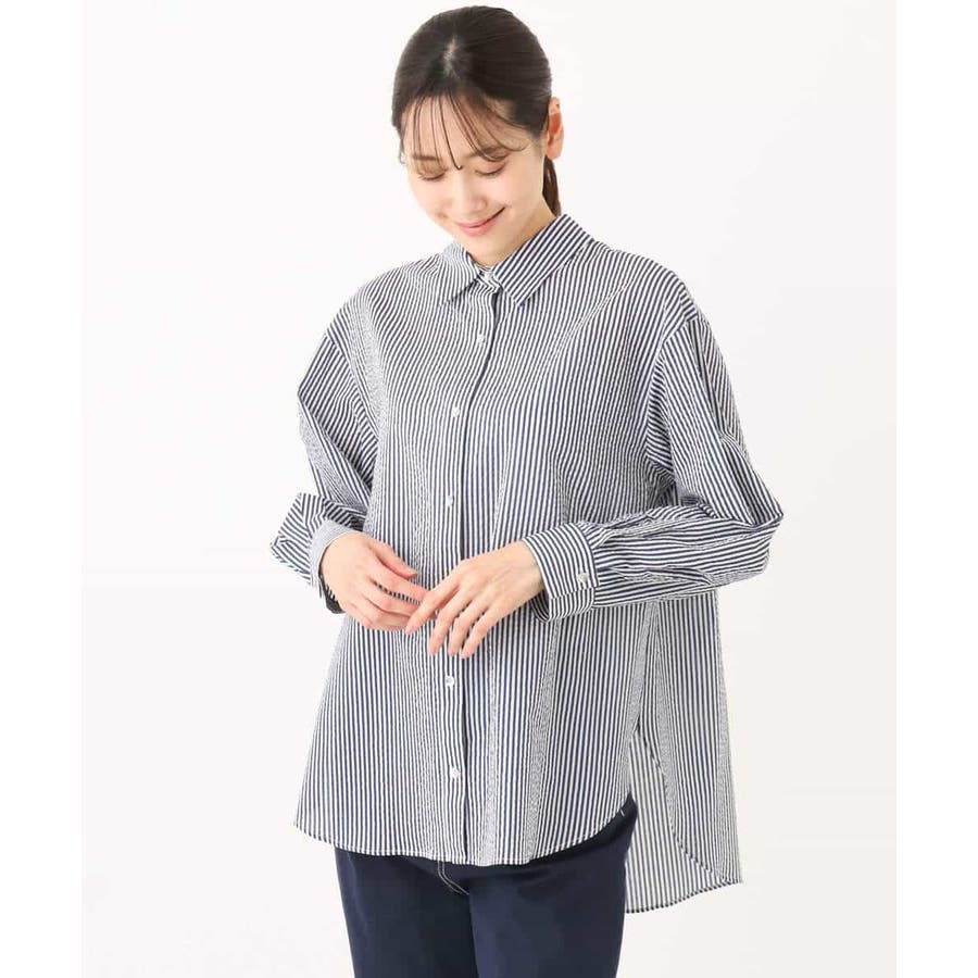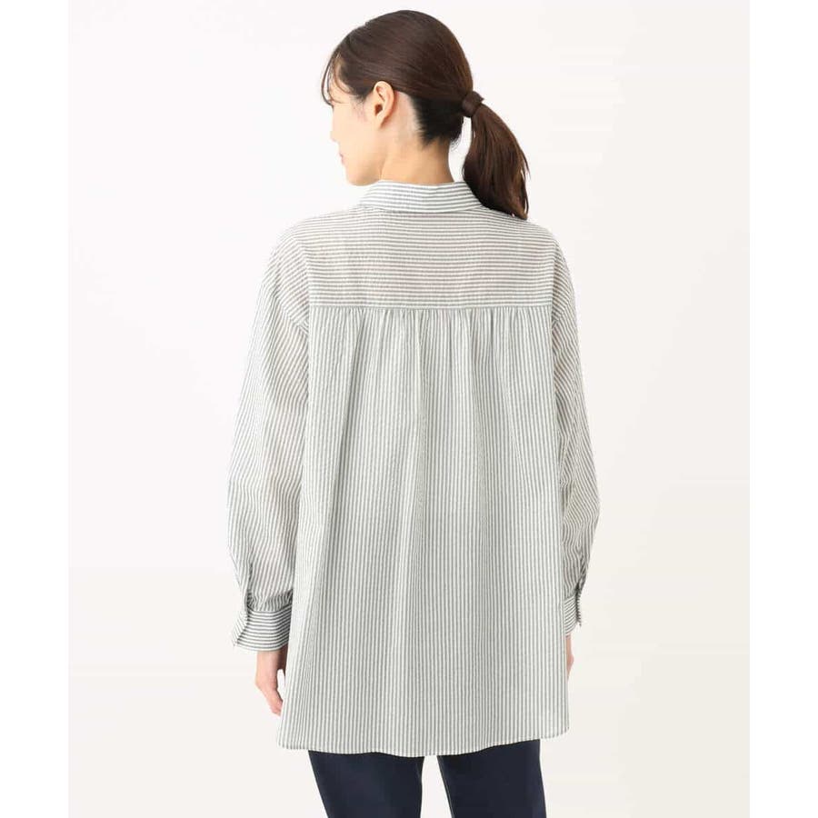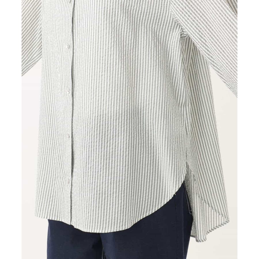 コットン100で表面感のあるサッカー素材のシャツブラウスです。ゆったりとしたサイズ感で体に張り付かず、さらっと着やすいです。釦を閉めて一枚着としても、タンクトップやTシャツの上からカーディガン代わりに羽織りとしても重宝します。後ろが長めでお尻がすっぽり隠れる長さなので、細身のパンツでも合わせやすいです。