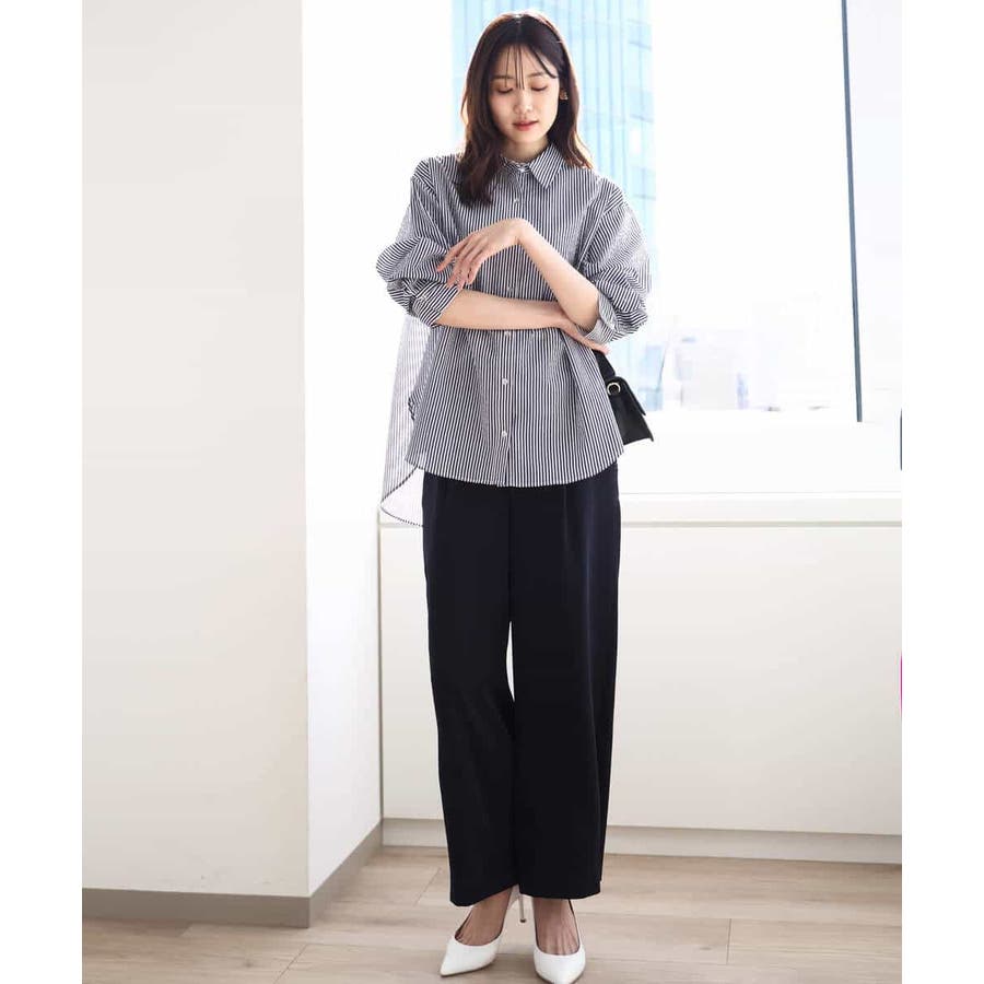 ストライプの柄が爽やかなベーシックなレギュラーカラーシャツ。程よくゆとりがありながらもオーバーすぎないシルエットが大人っぽく着こなせます。