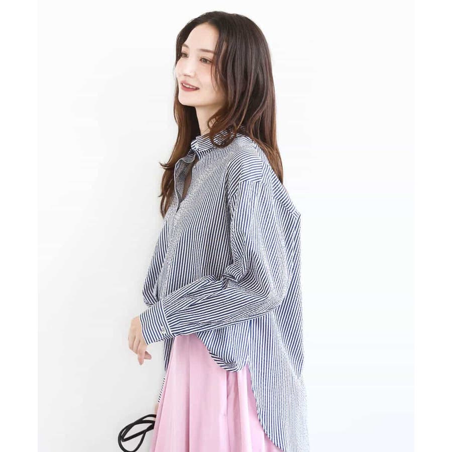 ストライプの柄が爽やかなベーシックなレギュラーカラーシャツ。程よくゆとりがありながらもオーバーすぎないシルエットが大人っぽく着こなせます。