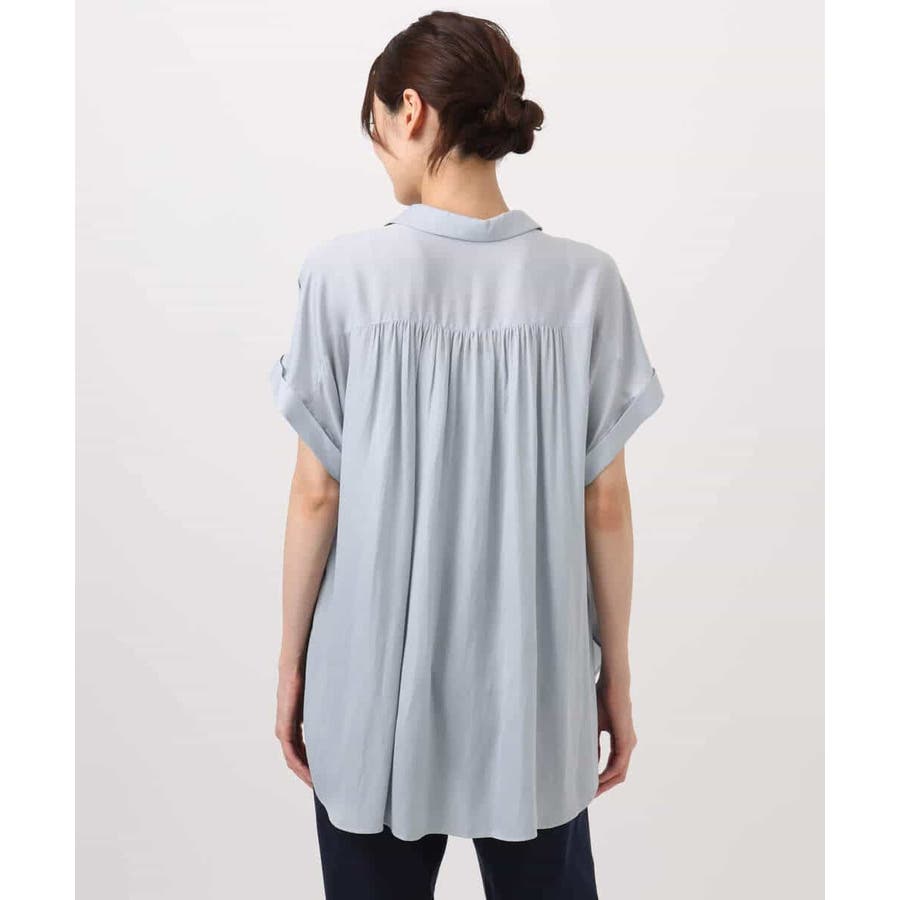 肩と背中部分のたっぷりのギャザーが女性らしいブラウス。フロントの華奢なミニメタル釦がアクセントに。前後差のある着丈がバランス良く着こなしやすく、首元部分もよりすっきりときれいに見えるようデザインが人気のMKの夏の定番ブラウスです。裾を内側の釦で留めるとウエストインしたようなシルエットでも着こなせます。