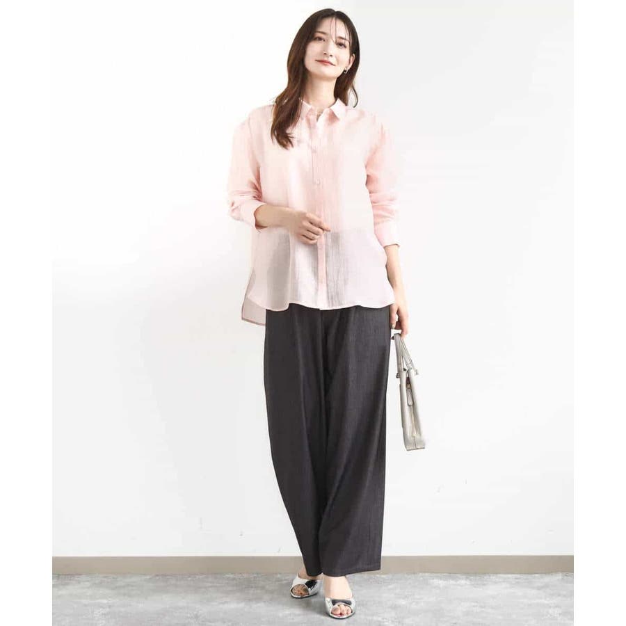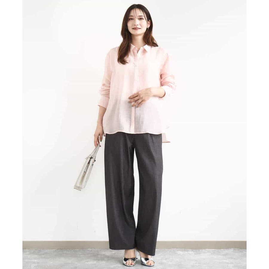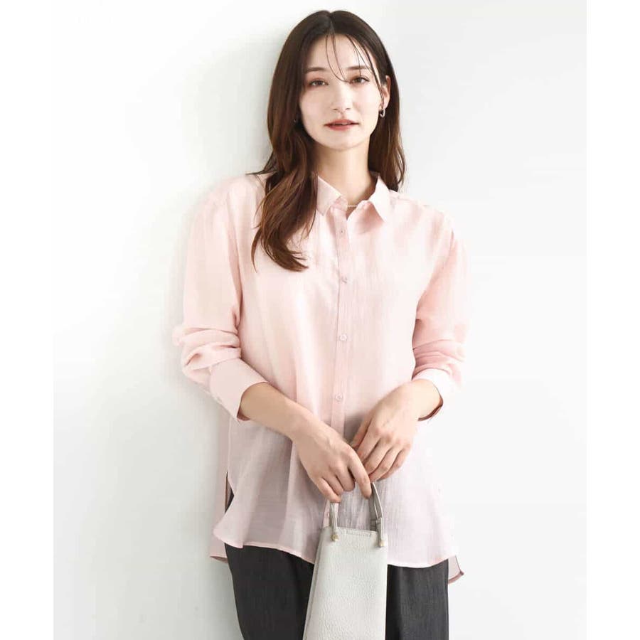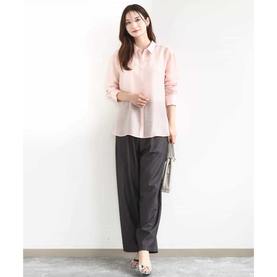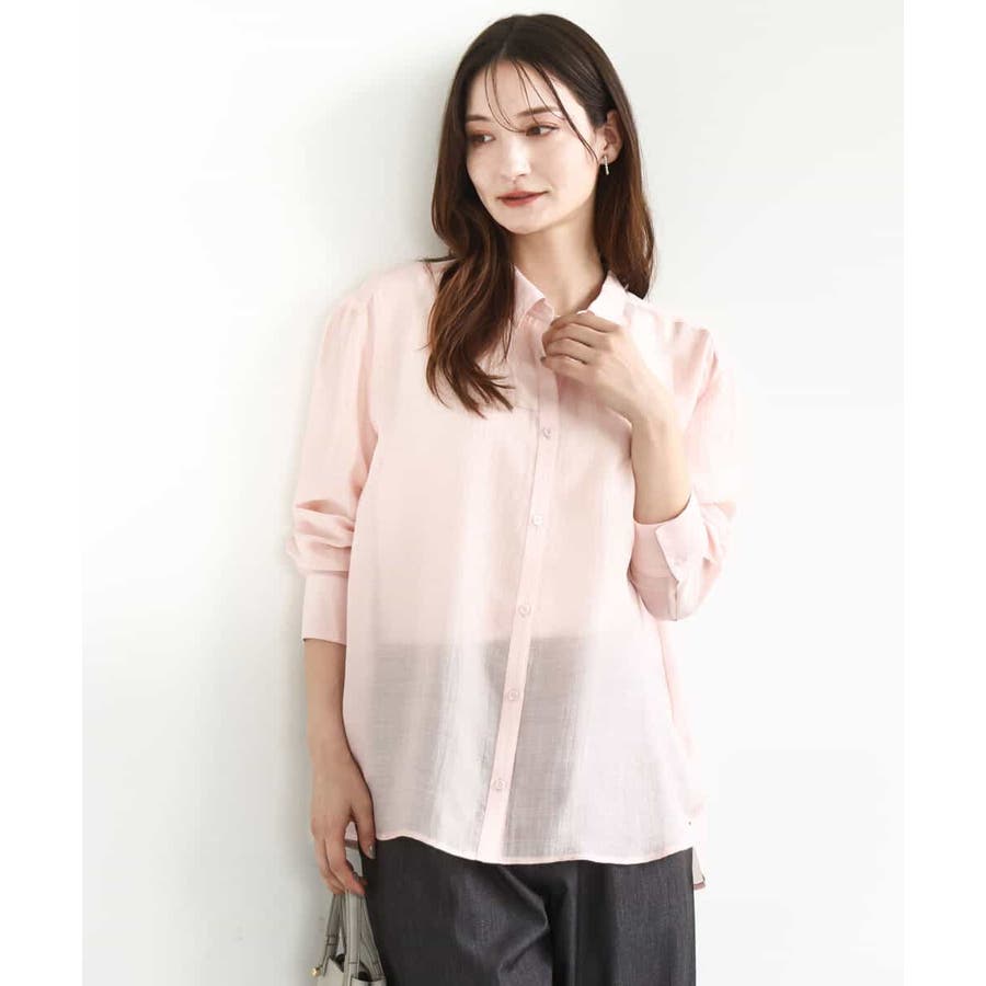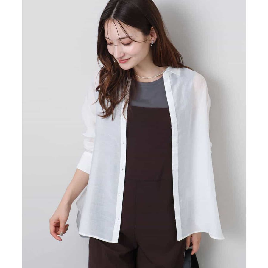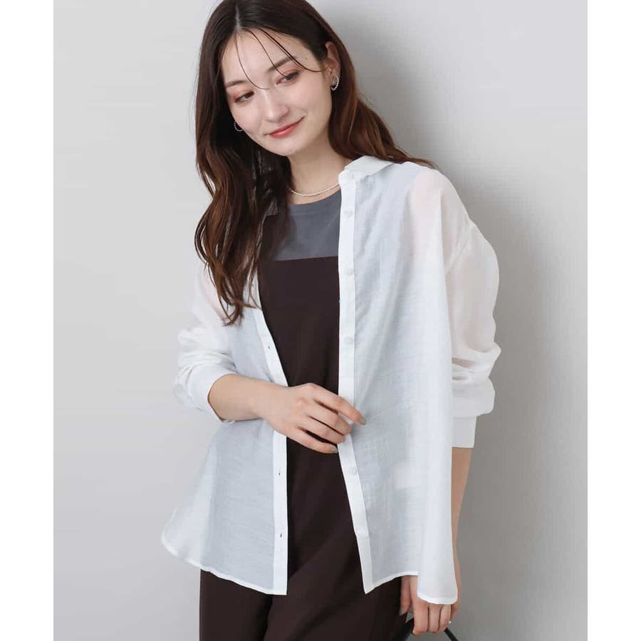 シワになりにくいシャツは冷房対策や日除けの羽織りとして持ち運びにも便利です。コーディネートの邪魔をしないやわらかなシアーな色合いが女性らしい優しげな印象に着こなせます。