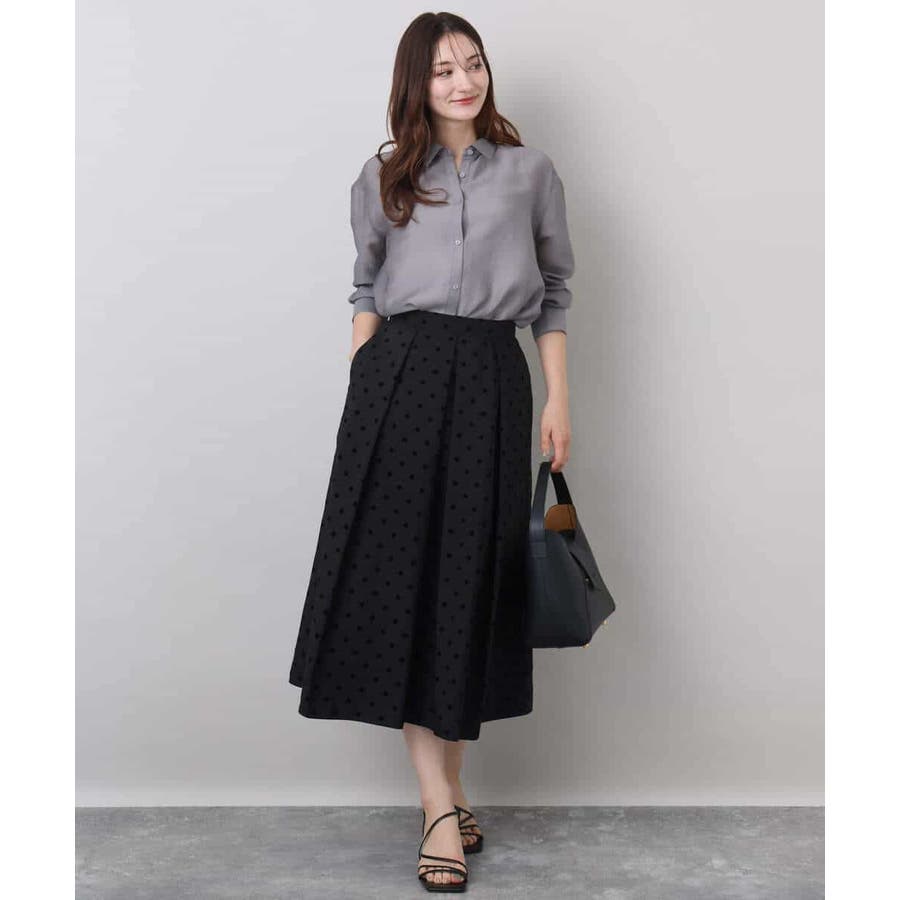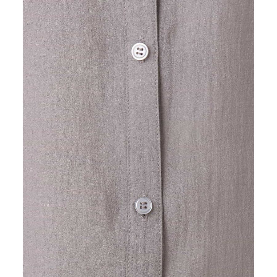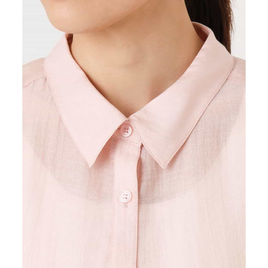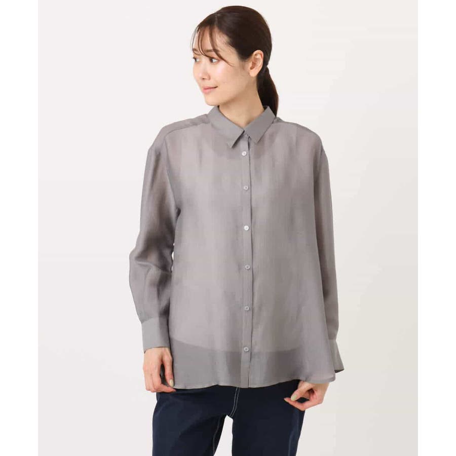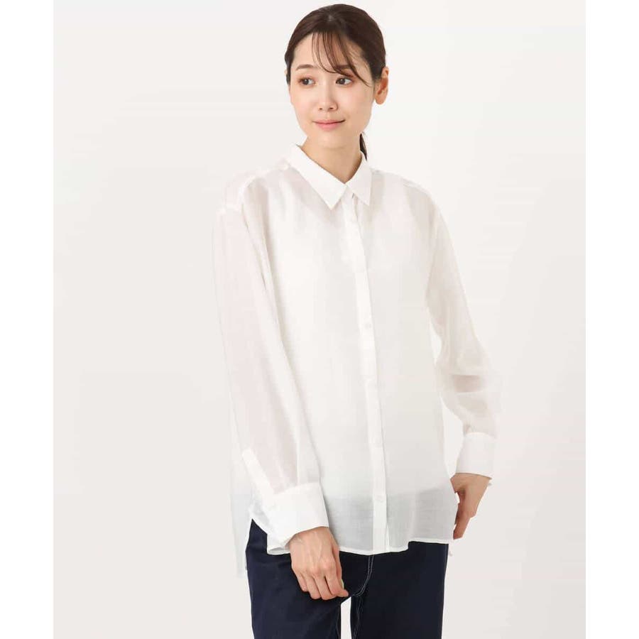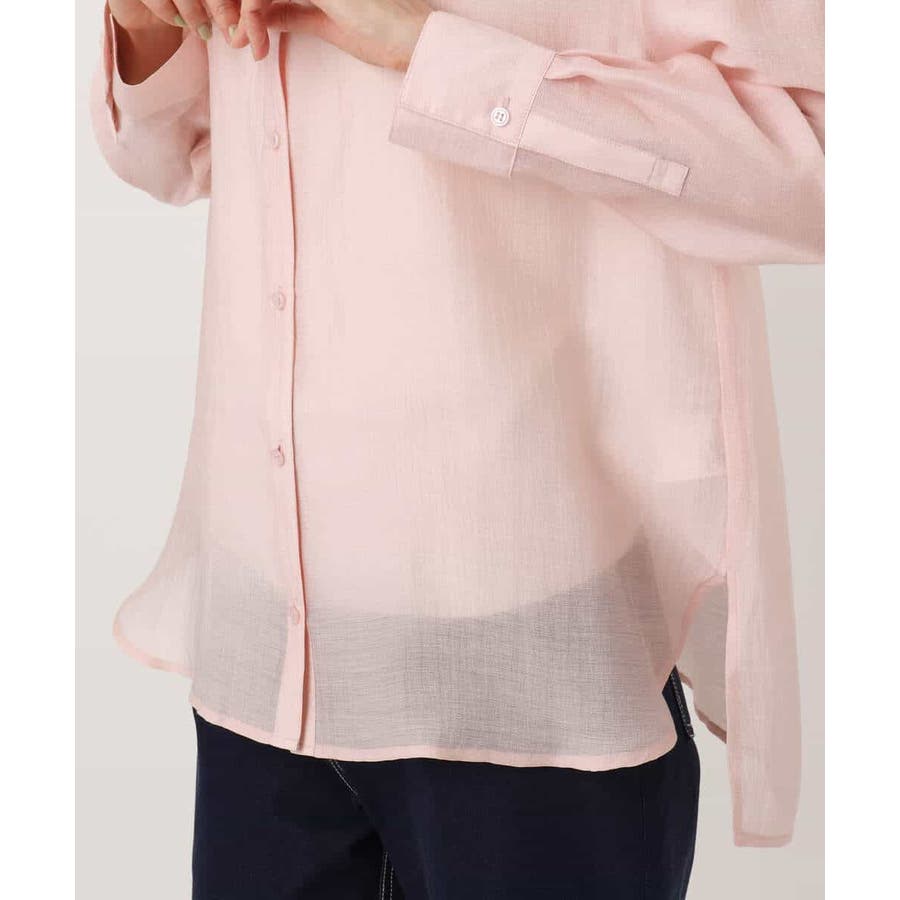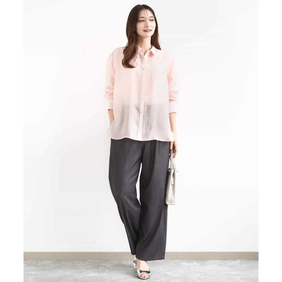 シワになりにくいシャツは冷房対策や日除けの羽織りとして持ち運びにも便利です。コーディネートの邪魔をしないやわらかなシアーな色合いが女性らしい優しげな印象に着こなせます。
