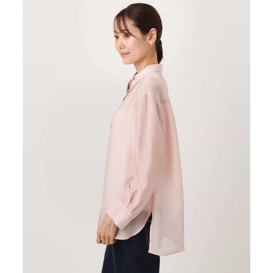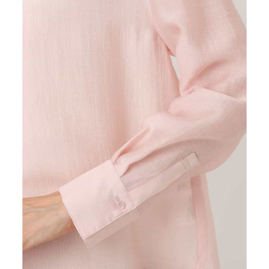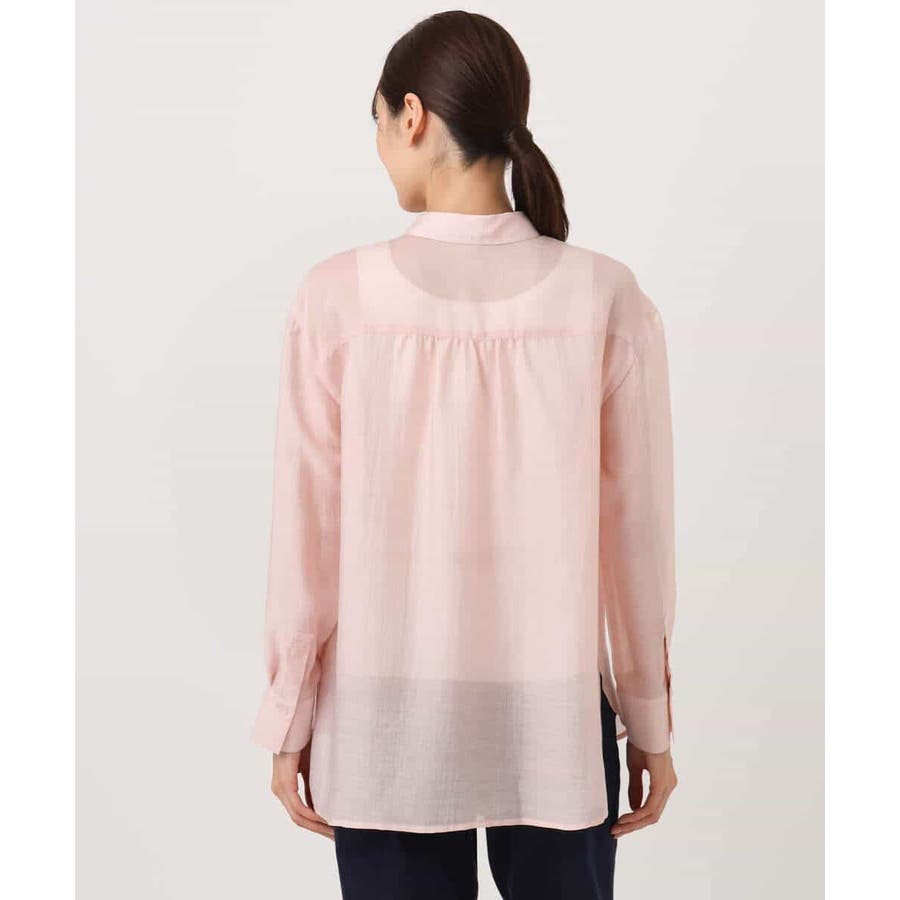 旬のシアー感シャツブラウスは、爽やかにスタイリングできる一枚。ゆとりのあるシルエットが上品な大人の抜け感のある着こなしを演出してくれます。プルオーバーとしてはもちろん釦を開けて軽い羽織りとしても着回し可能。日除けや冷房対策にも◎。薄手でありながらも適度なハリとコシのある麻のようなローン素材。通気性と速乾性に優れ夏の暑い時期でも快適に着用できます。お尻がしっかり隠れる丈感は細身のボトムにも合わせやすいですよ。