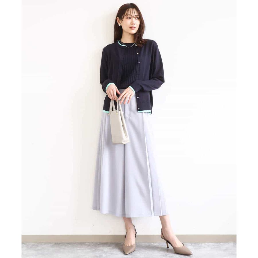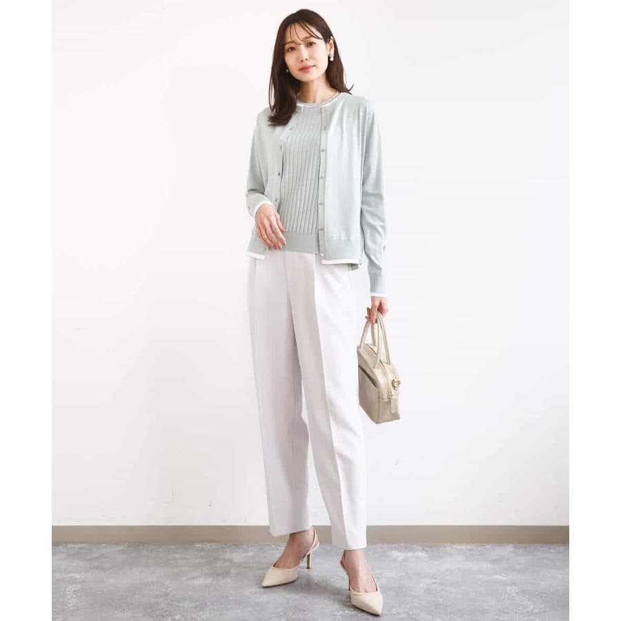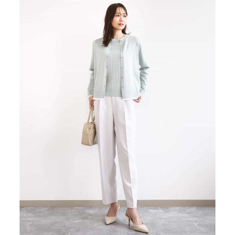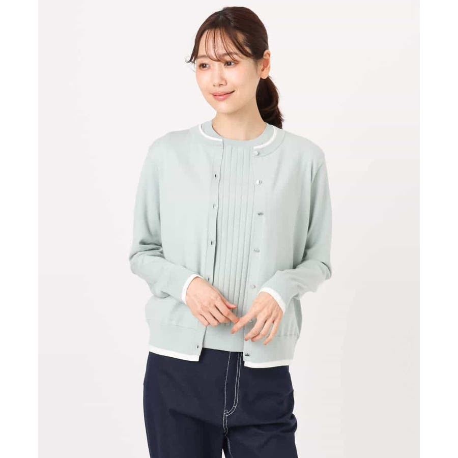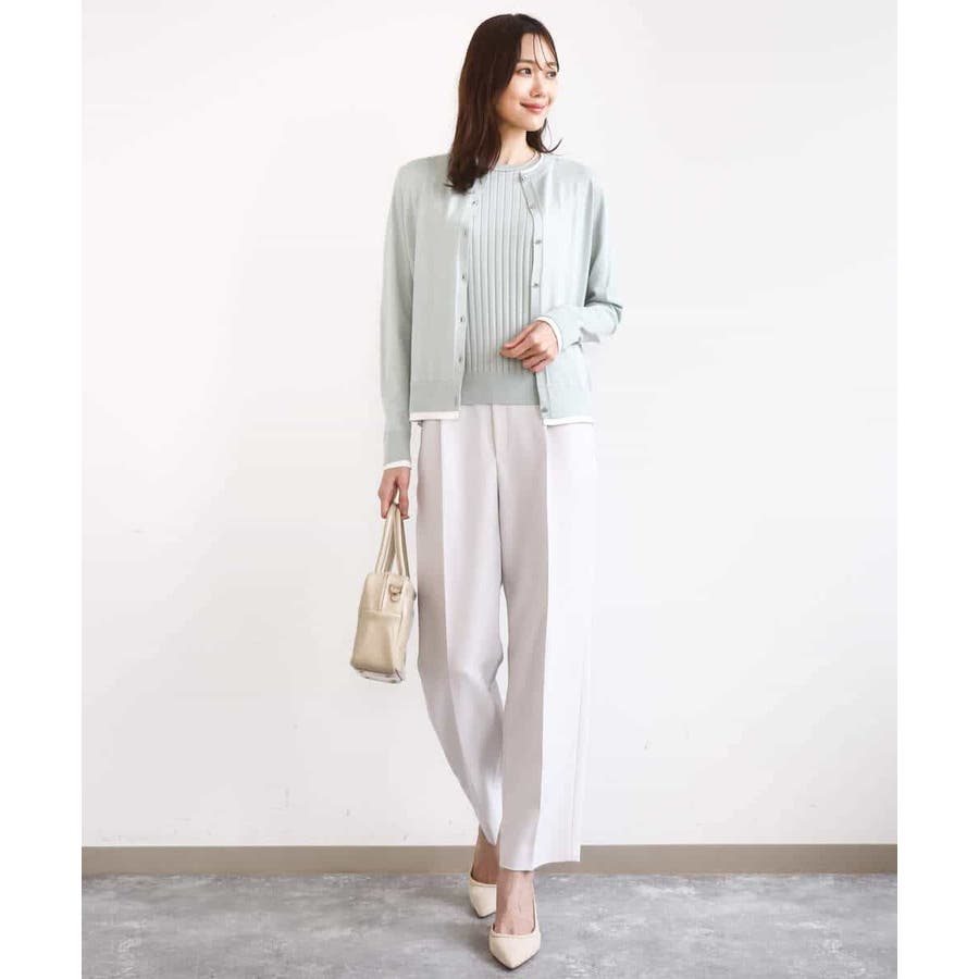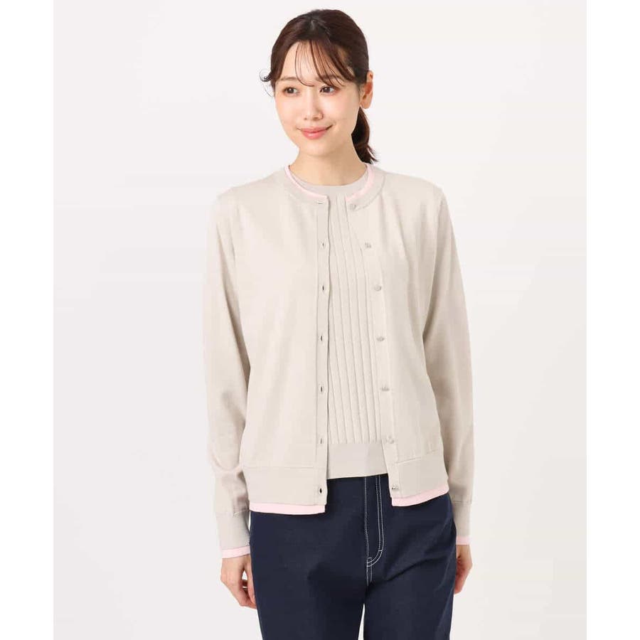 カーディガン一枚で前を閉じ、一枚着プルオーバーのように着こなすのもおすすめ。この先、暖かくなってもカーディガンを肩掛けしたり、半袖プルオーバーは単品でも、それぞれ着回し力の高いセットアイテムです。