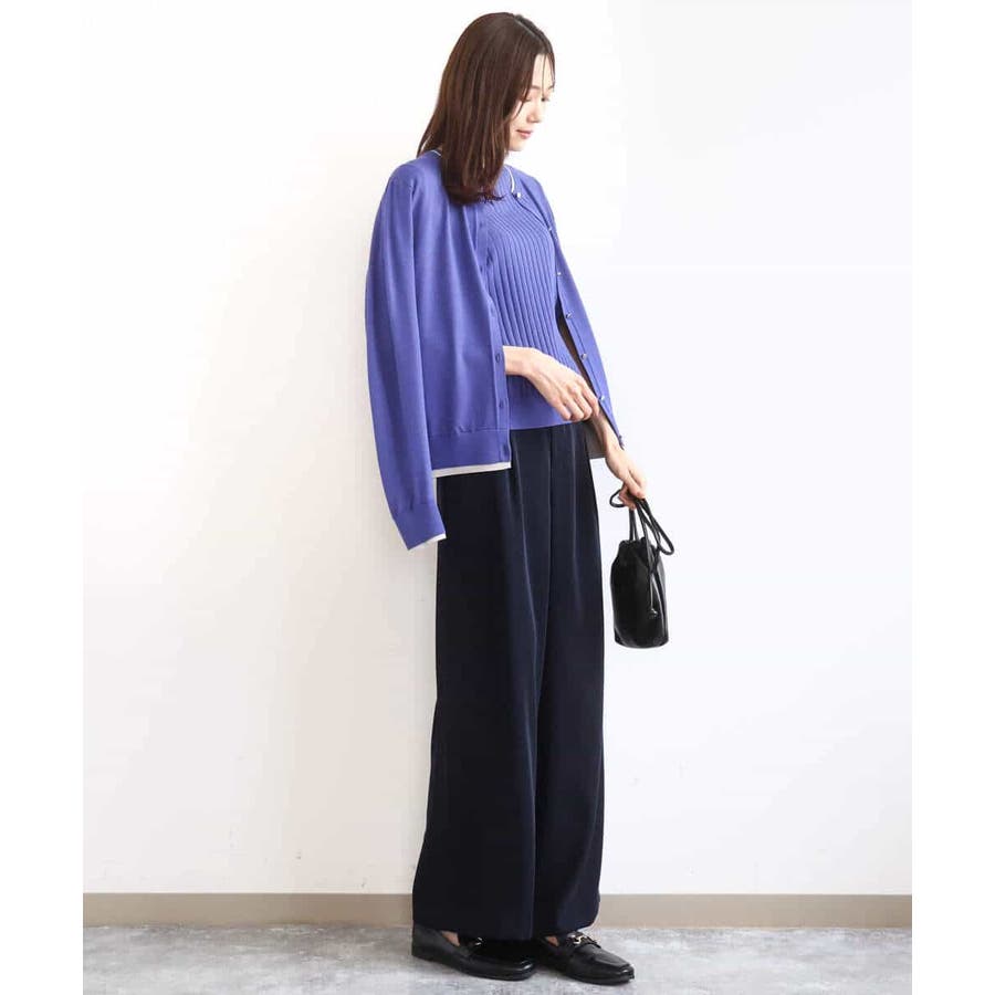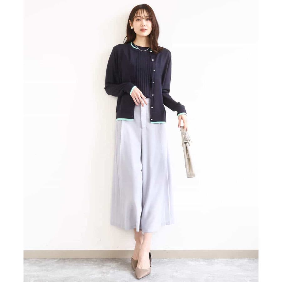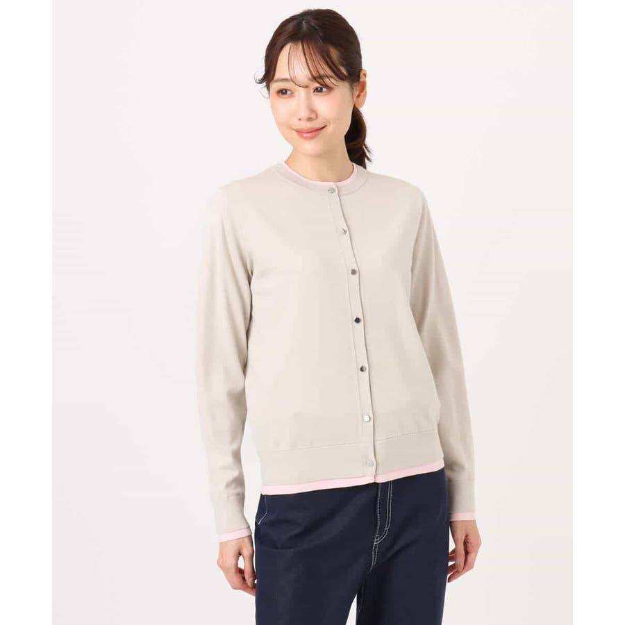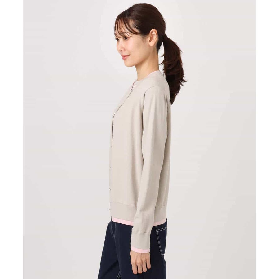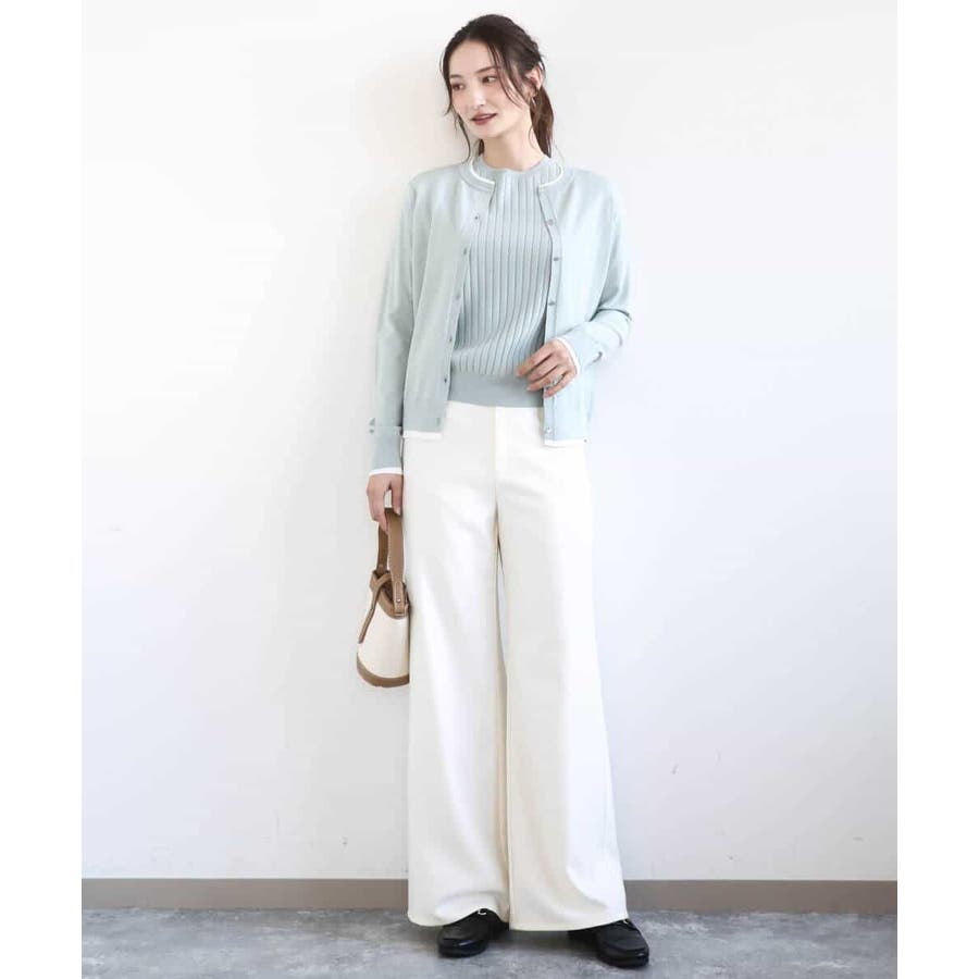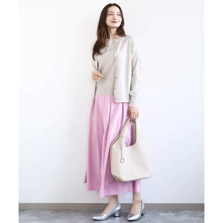 カーディガン一枚で前を閉じ、一枚着プルオーバーのように着こなすのもおすすめ。この先、暖かくなってもカーディガンを肩掛けしたり、半袖プルオーバーは単品でも、それぞれ着回し力の高いセットアイテムです。