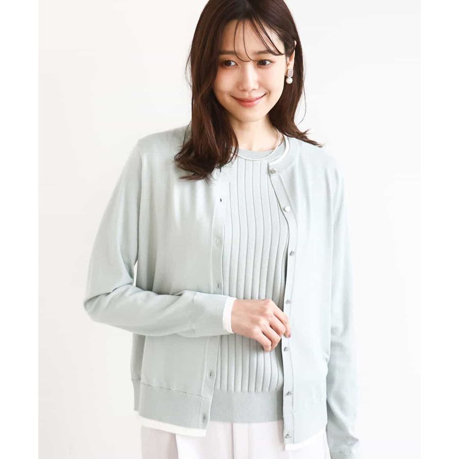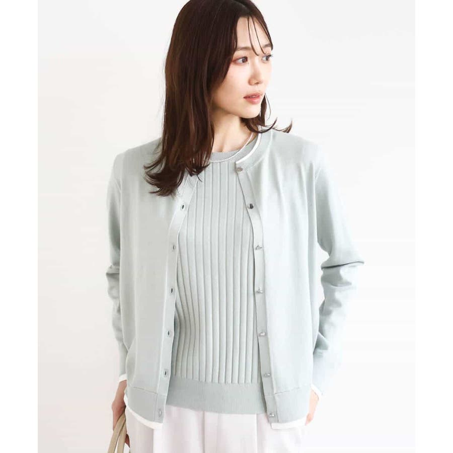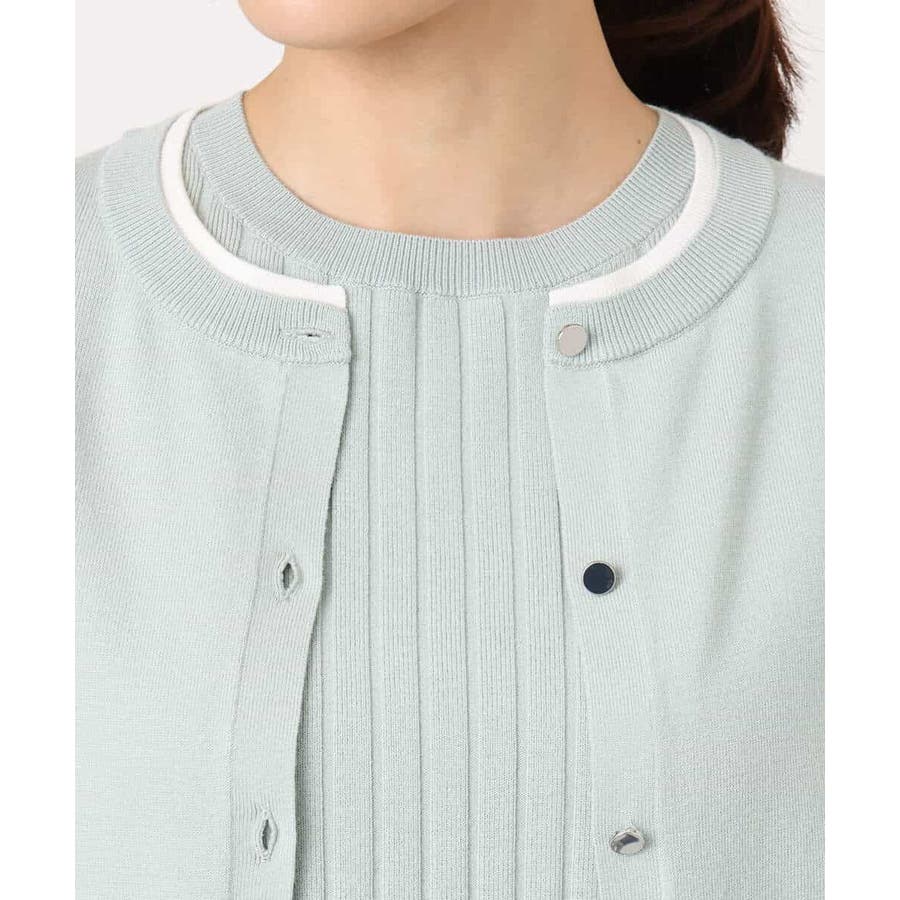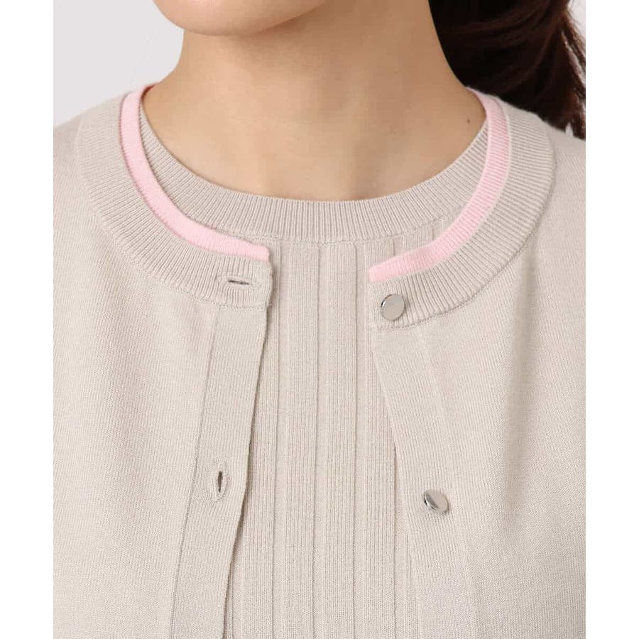 人気のアンサンブルニット。カーディガンの衿、袖口、裾の配色デザインをポイントに。インナーはワイドリブのストライプ見え半袖プルオーバーです。