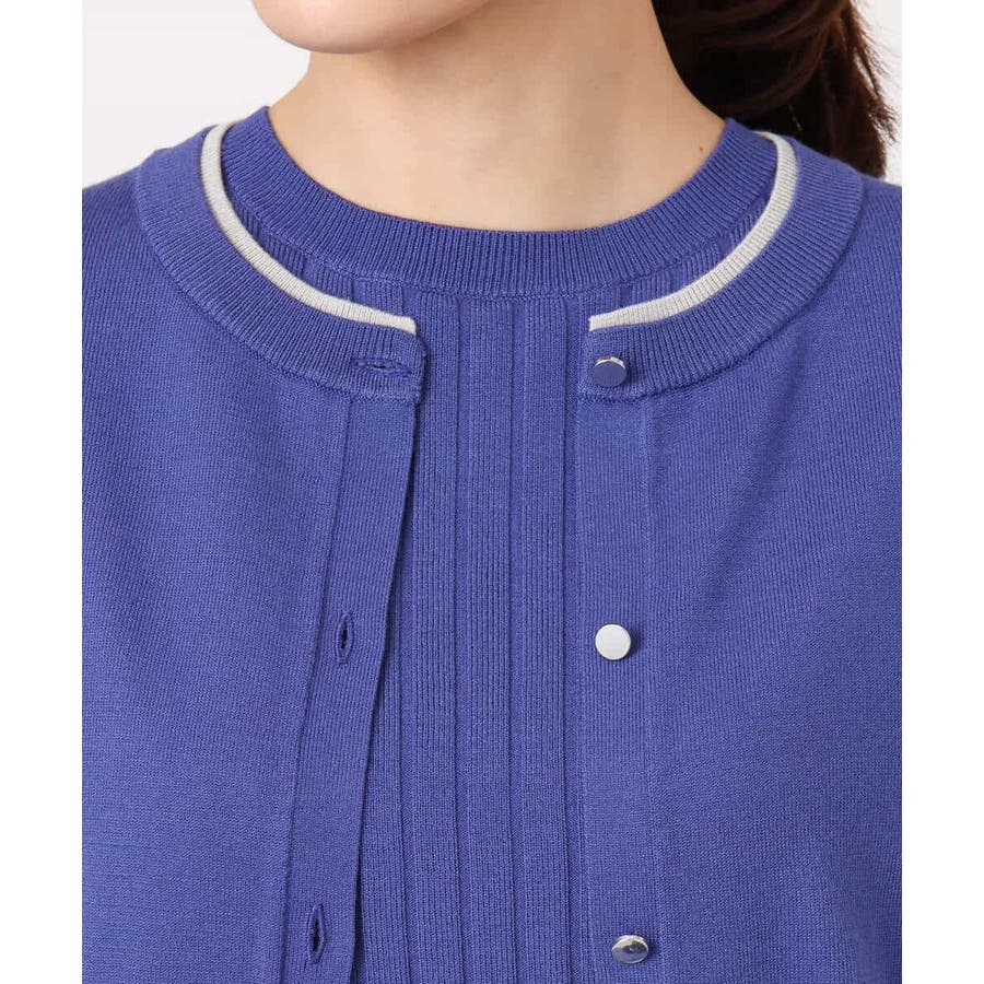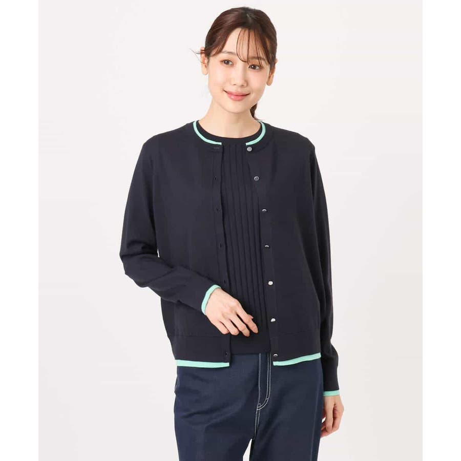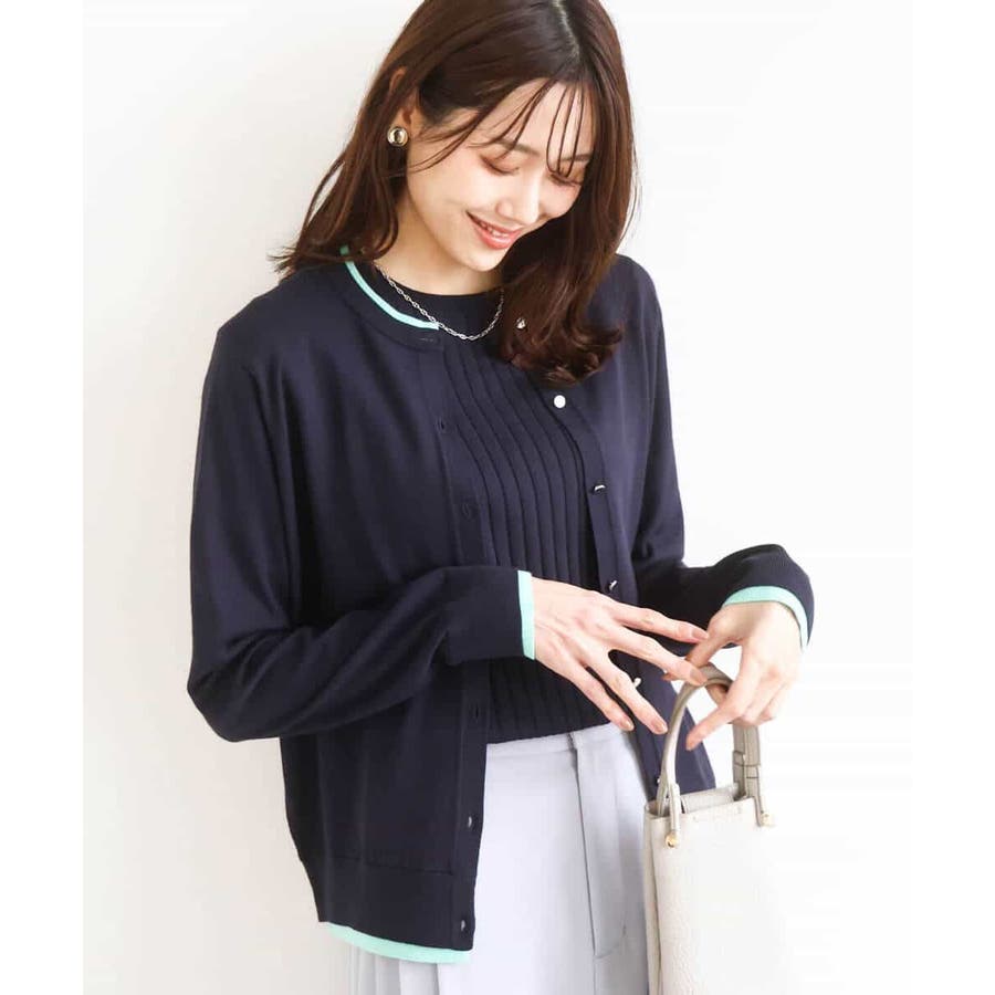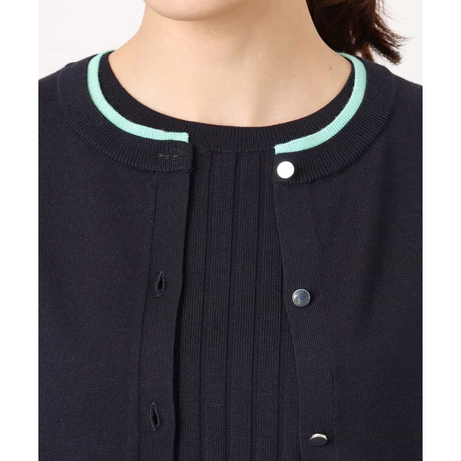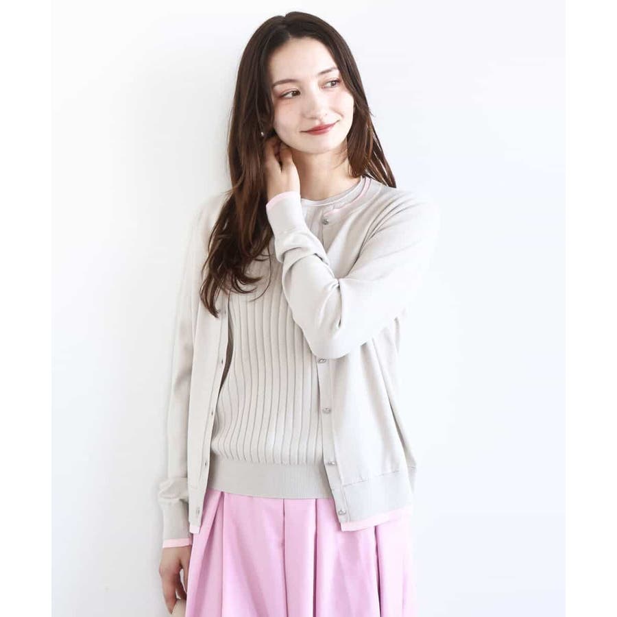 人気のアンサンブルニット。カーディガンの衿、袖口、裾の配色デザインをポイントに。インナーはワイドリブのストライプ見え半袖プルオーバーです。