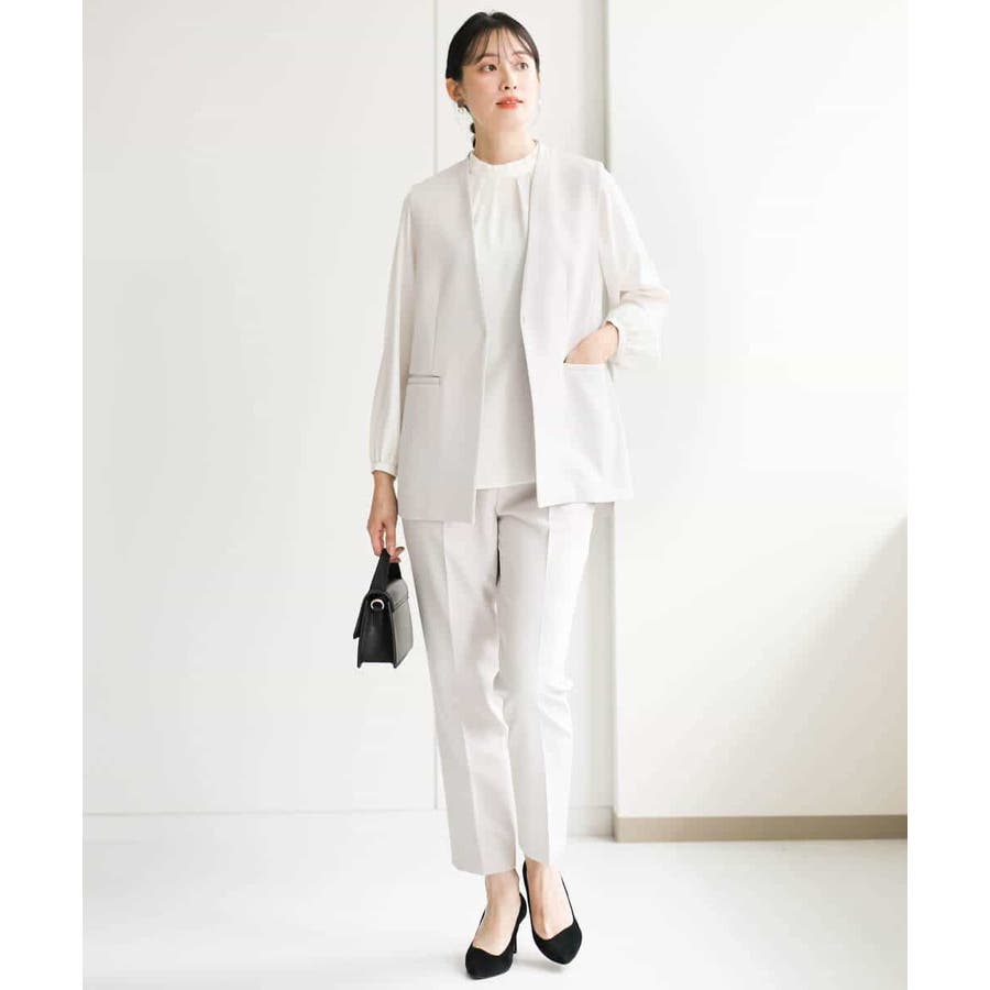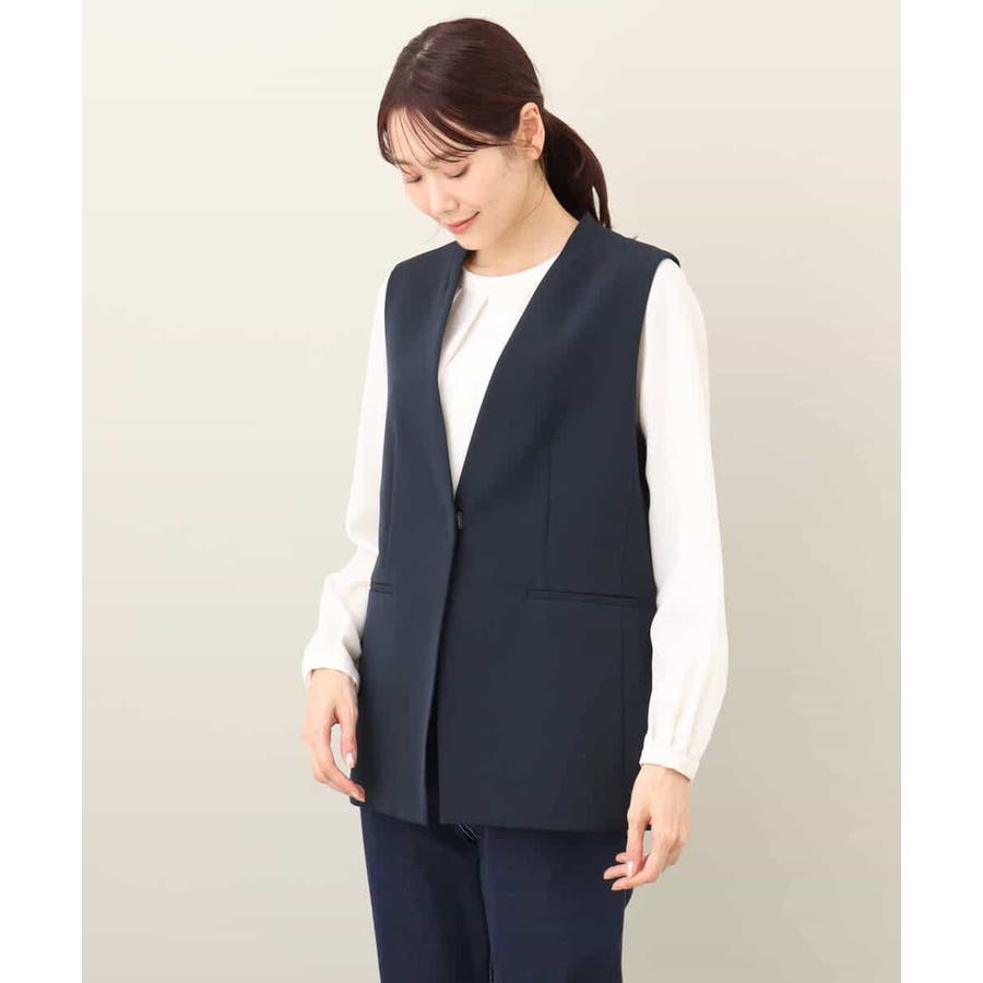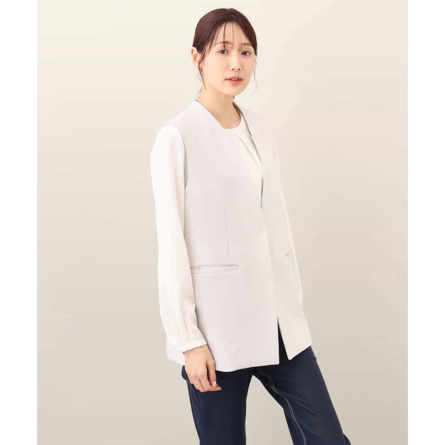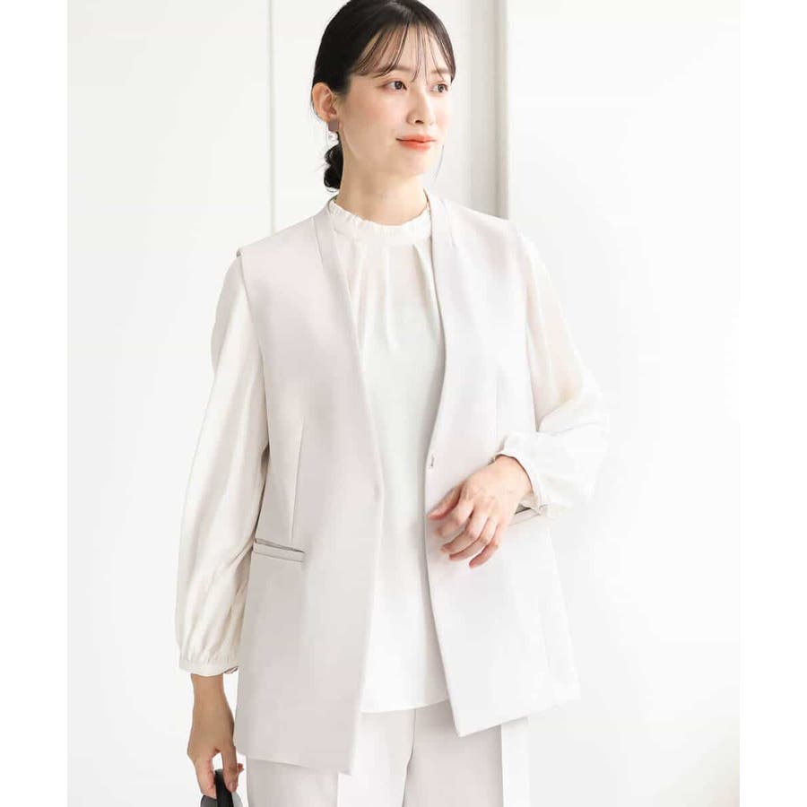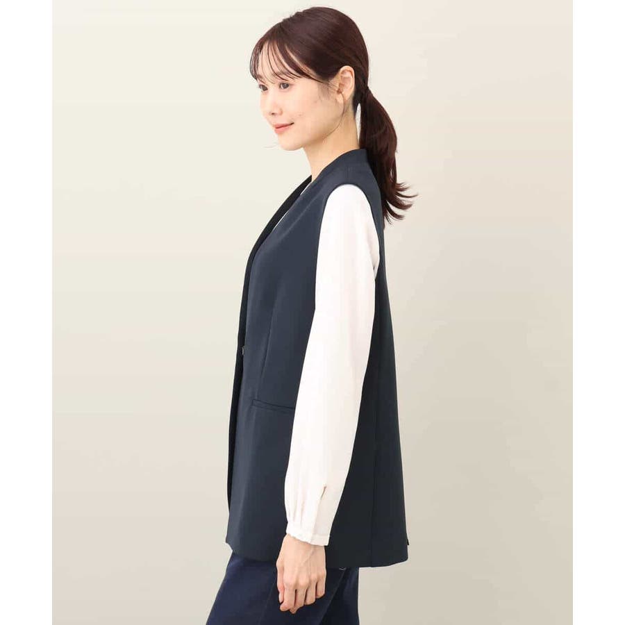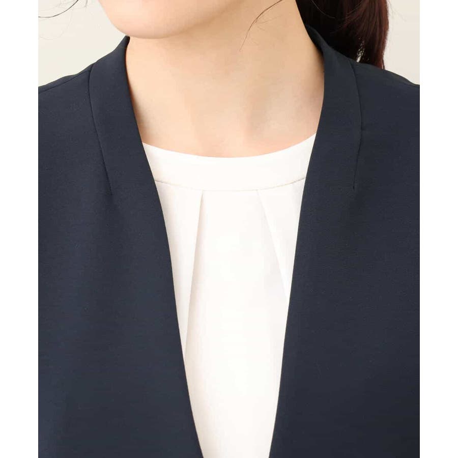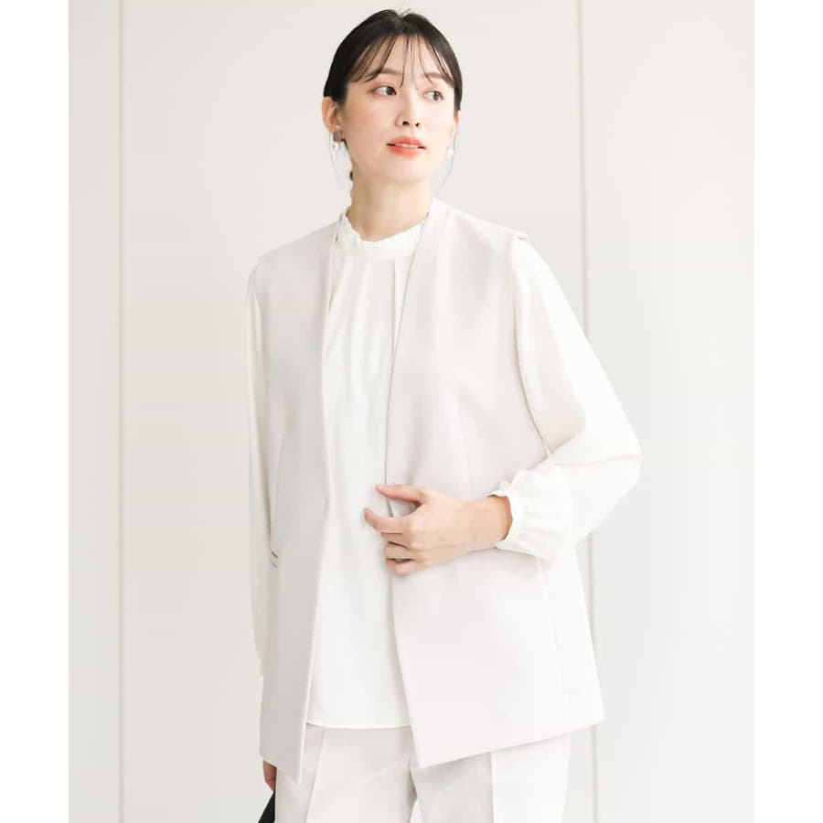 すっきりとしたVネックのカットラインがきれいなノーカラージレ。肩幅は細く見えるように仕立て、お仕事などきれいめなシーンにも着回しやすく仕上げました。裏地を付けずパイピング始末で丁寧に仕上げているので、春から夏、秋と長く着回せる仕様なのも嬉しい。