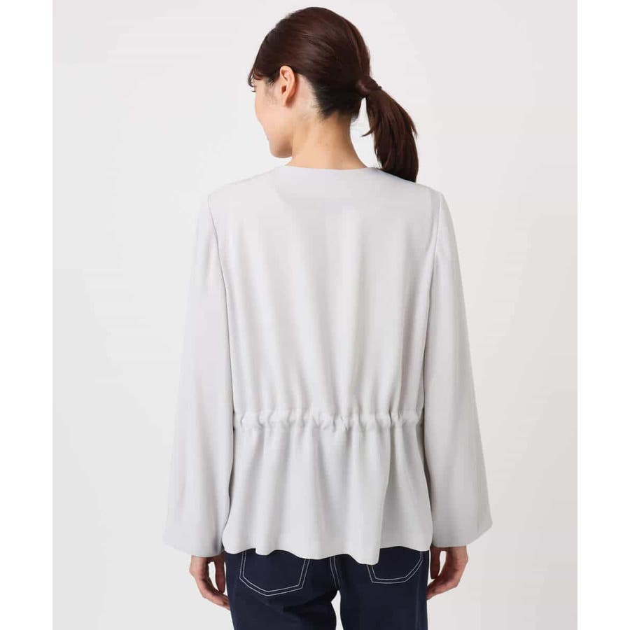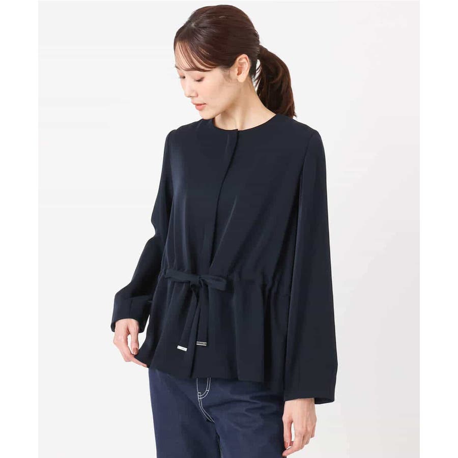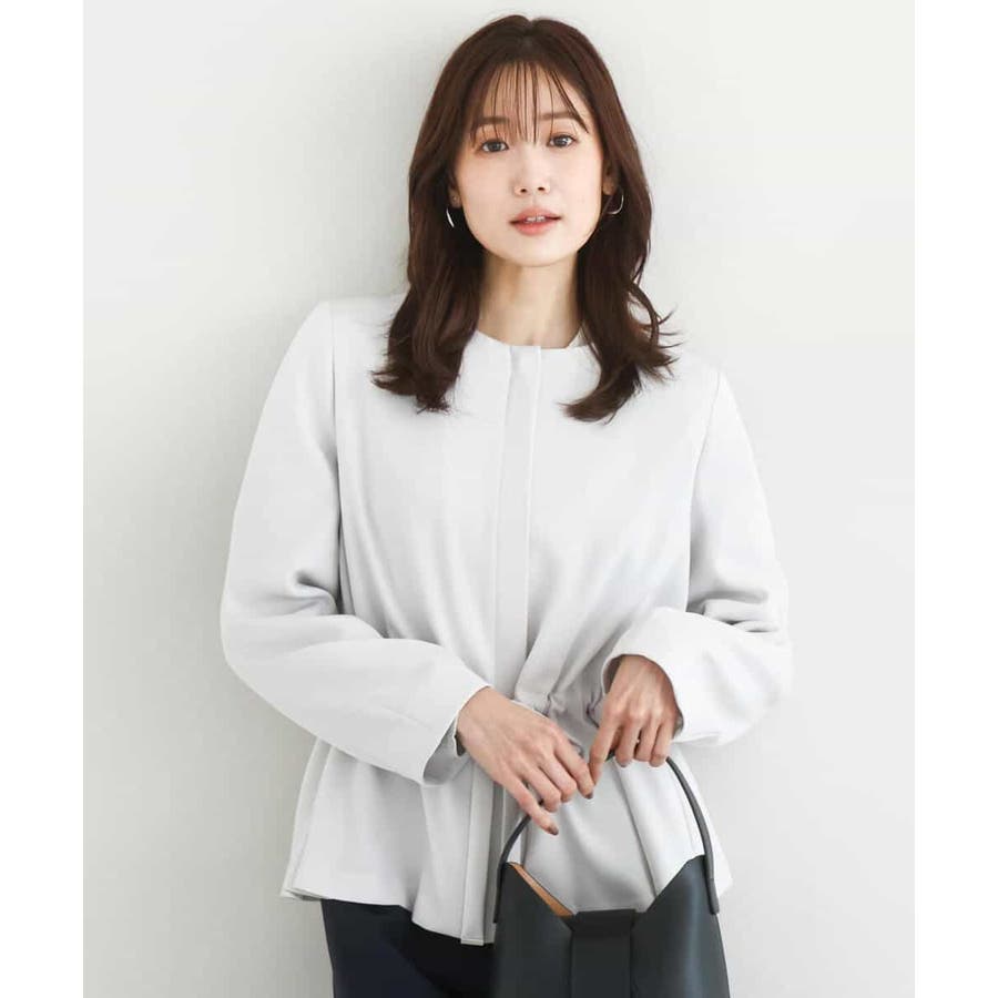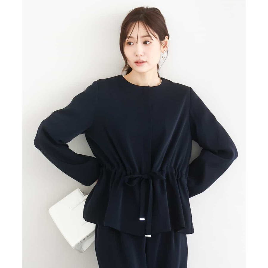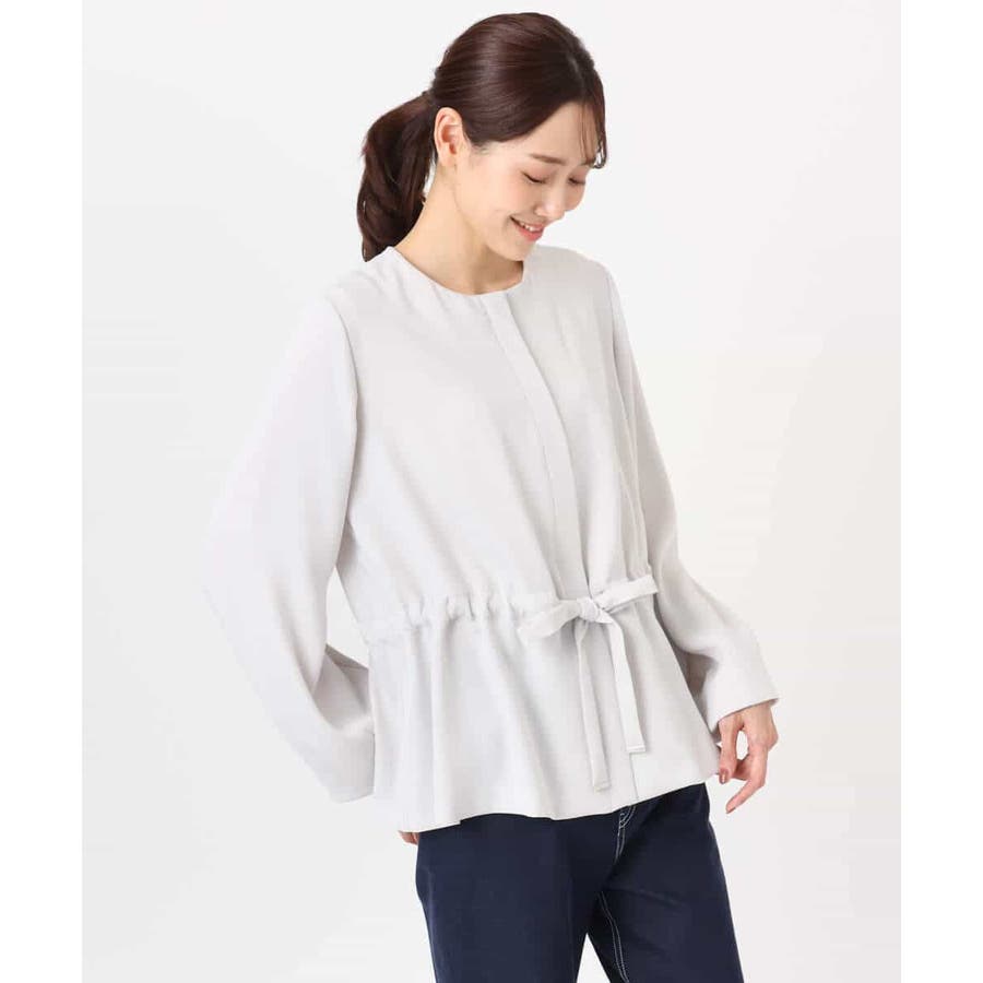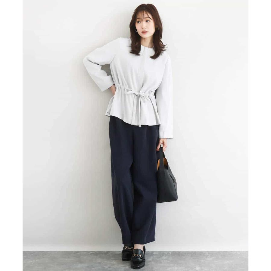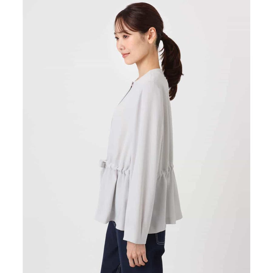 プルオーバーとしてもブルゾンとしてもどちらの着こなしも楽しめる一枚です。全体的にシルエットはゆったりとしていて、ウエストのリボンで調整可能。ギャザーを寄せてペプラムっぽいシルエットで着こなすのがおすすめです。袖口が広めなので、タックアップはややしにくさを感じました。生地はさらりとなめらかできれいめな印象。撥水加工や防シワの嬉しい機能付きです。同素材のパンツとのコーディネートも洗練された印象でおすすめ。普段使いはもちろん、セレモニーなどのONシーンにも着回せる汎用性の高さも魅力です。