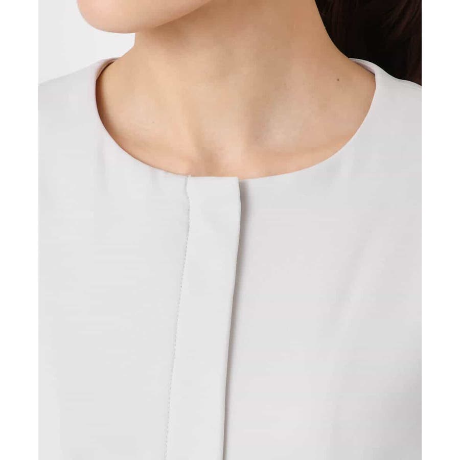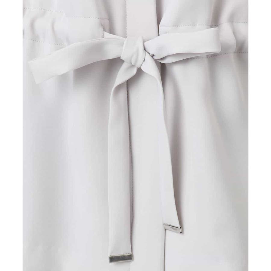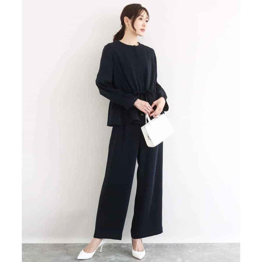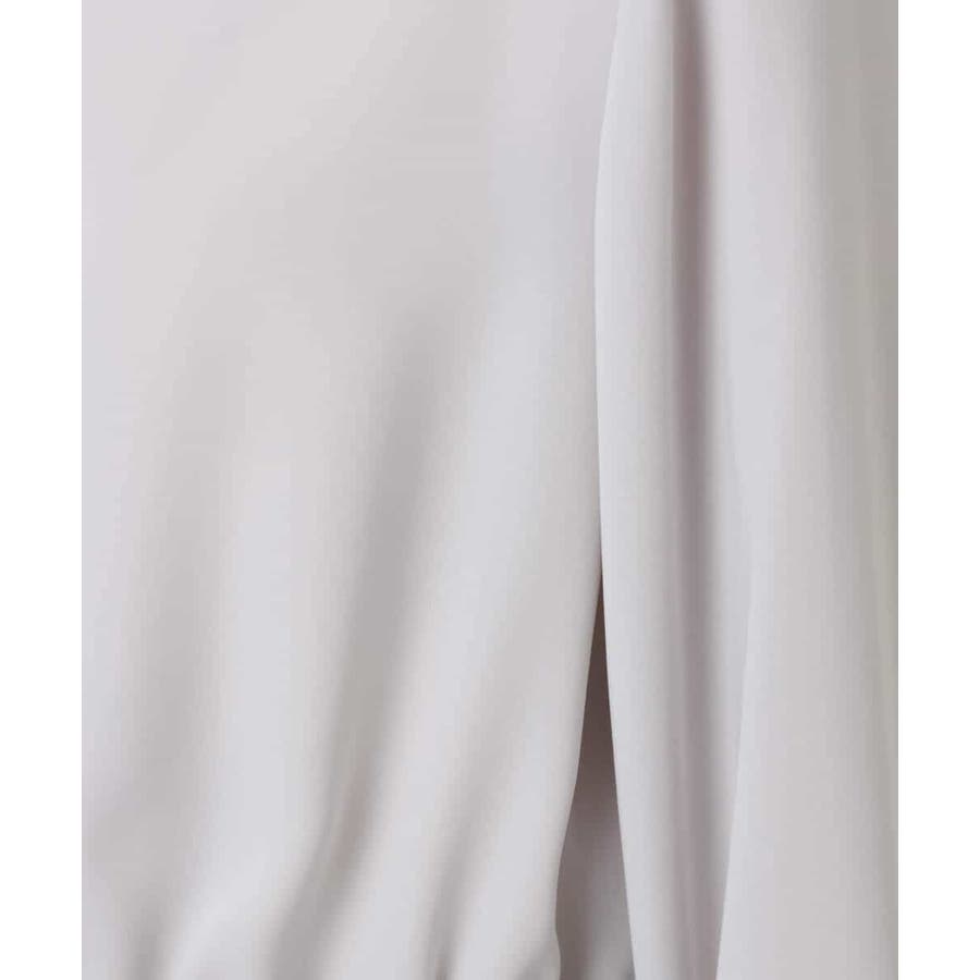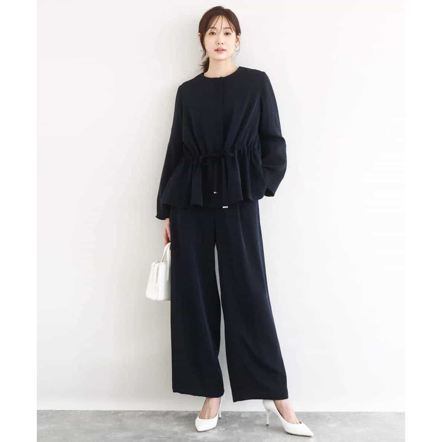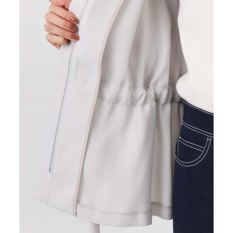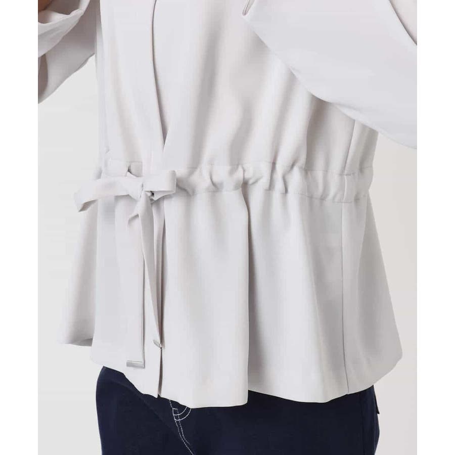 プルオーバーとしてもブルゾンとしてもどちらの着こなしも楽しめる一枚です。全体的にシルエットはゆったりとしていて、ウエストのリボンで調整可能。ギャザーを寄せてペプラムっぽいシルエットで着こなすのがおすすめです。袖口が広めなので、タックアップはややしにくさを感じました。生地はさらりとなめらかできれいめな印象。撥水加工や防シワの嬉しい機能付きです。同素材のパンツとのコーディネートも洗練された印象でおすすめ。普段使いはもちろん、セレモニーなどのONシーンにも着回せる汎用性の高さも魅力です。