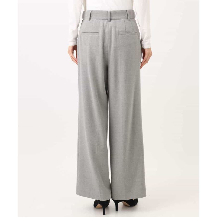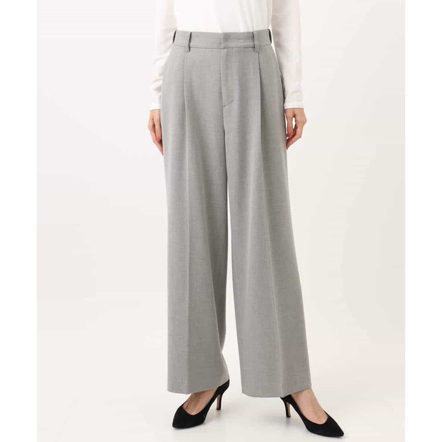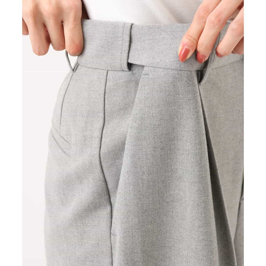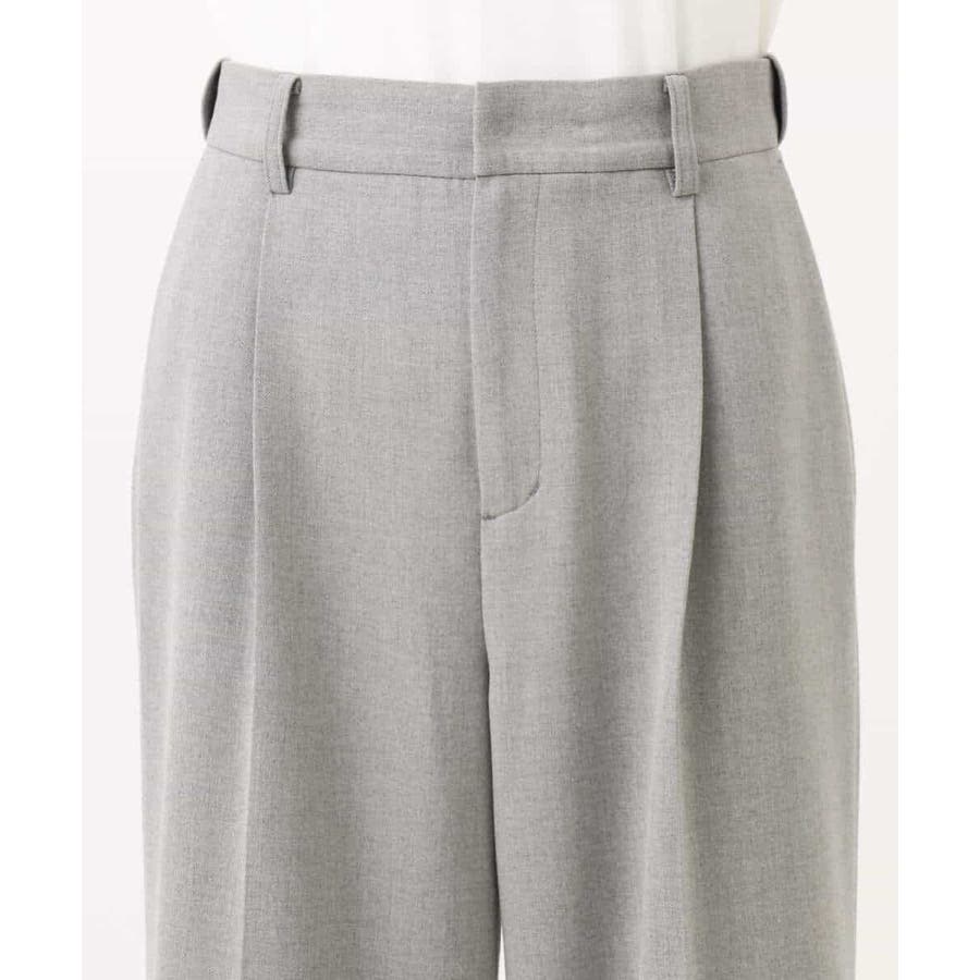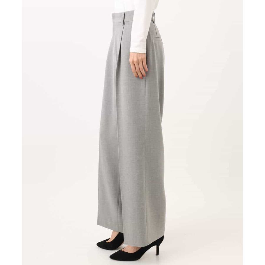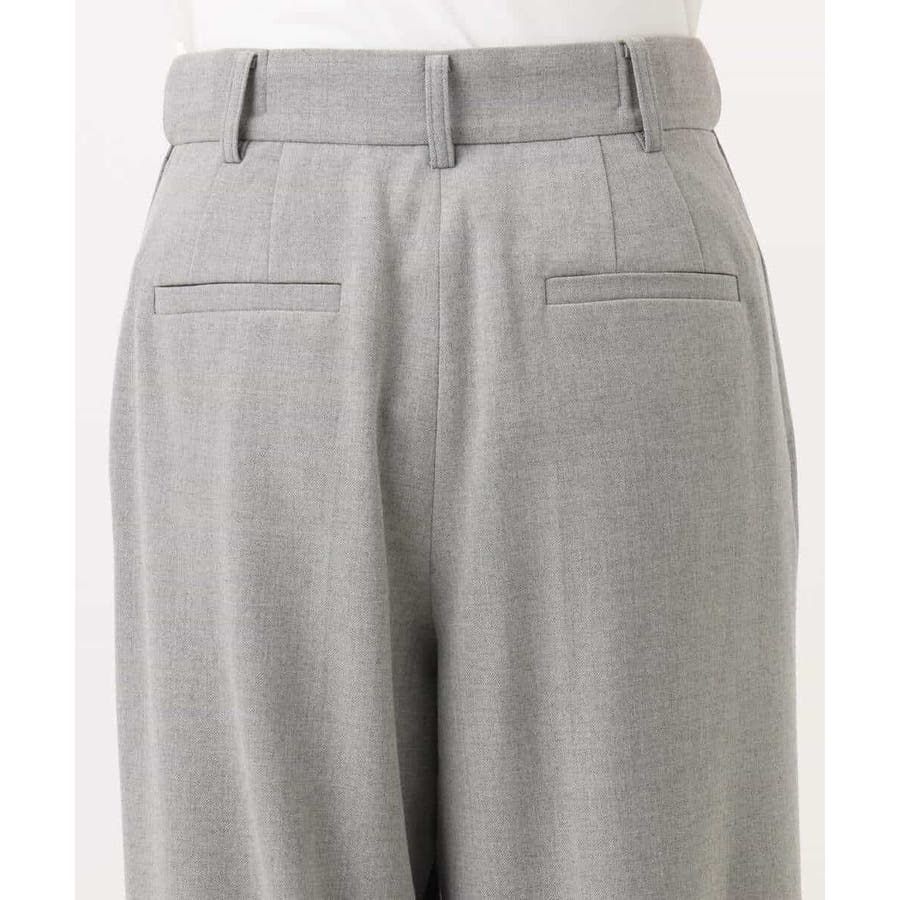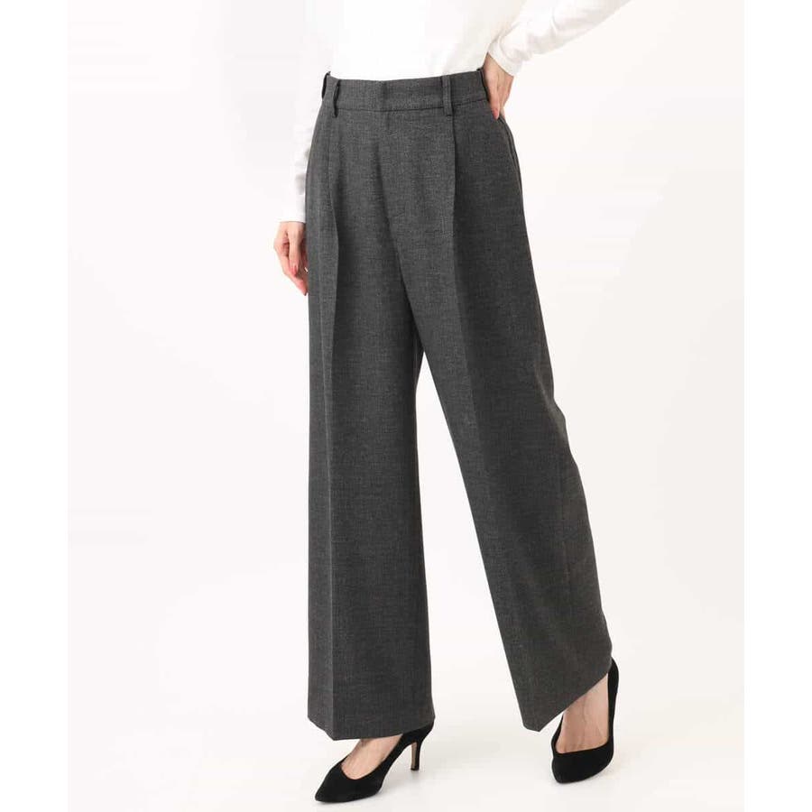 シンプルな美脚シルエットのワイドパンツ。きれいめに着こなしやすい無地見えするツイード調の柄が新鮮な一枚です。フロントタック山が、ウエスト周りのシルエットを隠してくれつつ、山から続きのプレス線を入れることでタテ長効果でスッキリとしたシルエットを実現。脚を綺麗に見せてくれます。ワイドすぎず、細すぎずな程良い分量感が合わせるトップスを選びません。まっすぐ目のベルトカーブにすることでシャープな印象のウエスト周りに。ウエストは動きに沿って伸び縮みする凝った仕様で仕上げ、後ろゴムギャザーを無くし、快適な着心地はそのままに、着用したときよりきちんと感のある見え感に仕上げました。