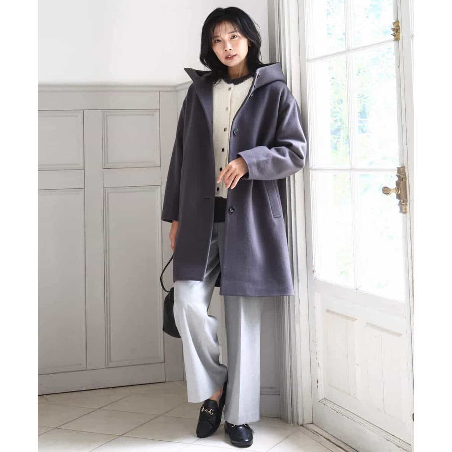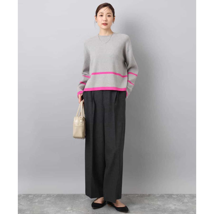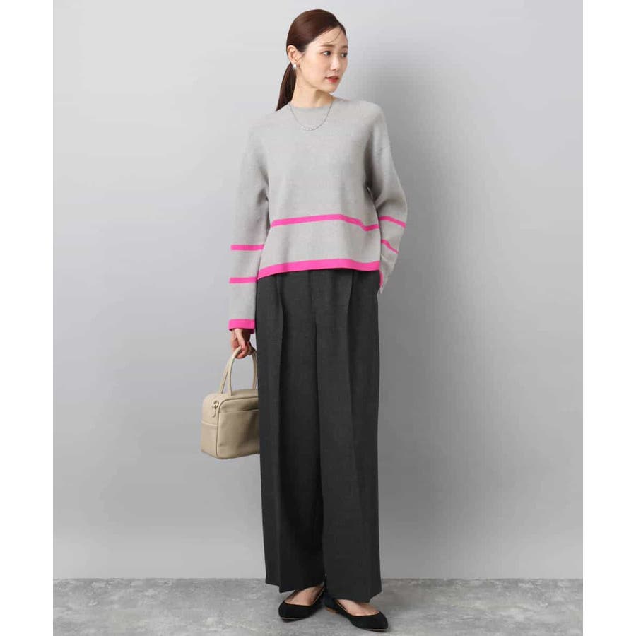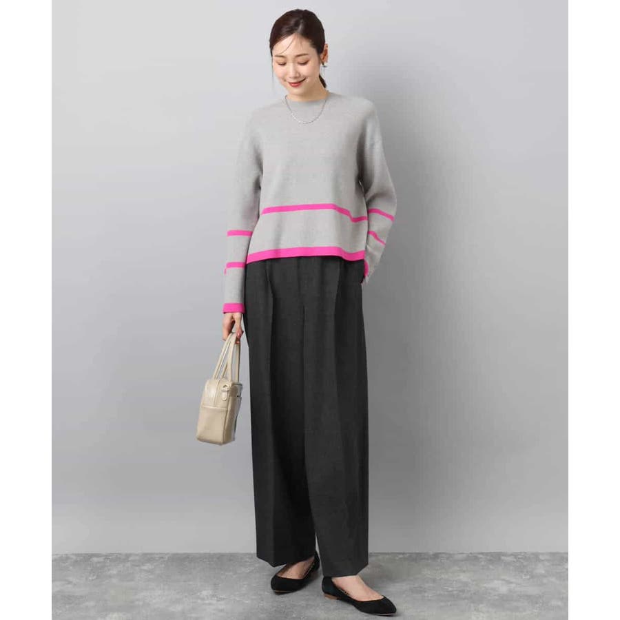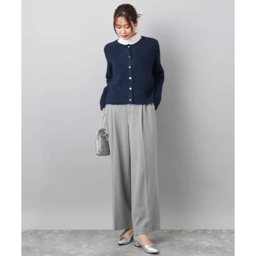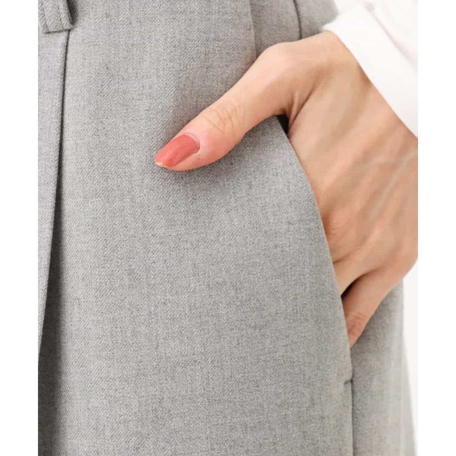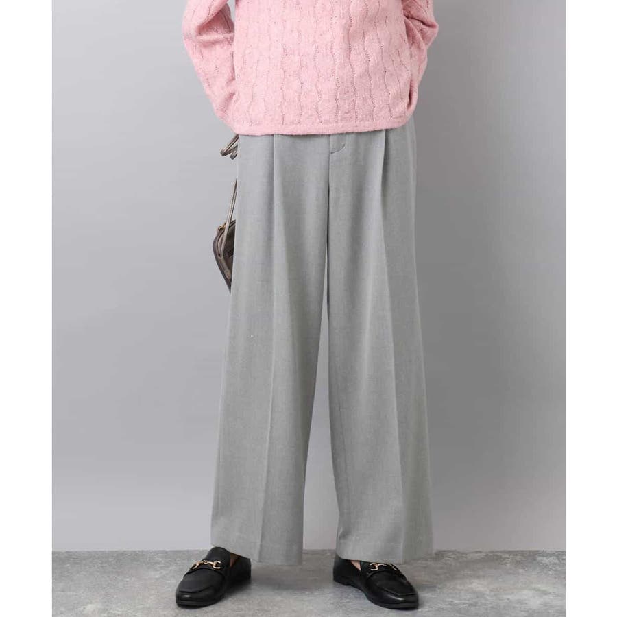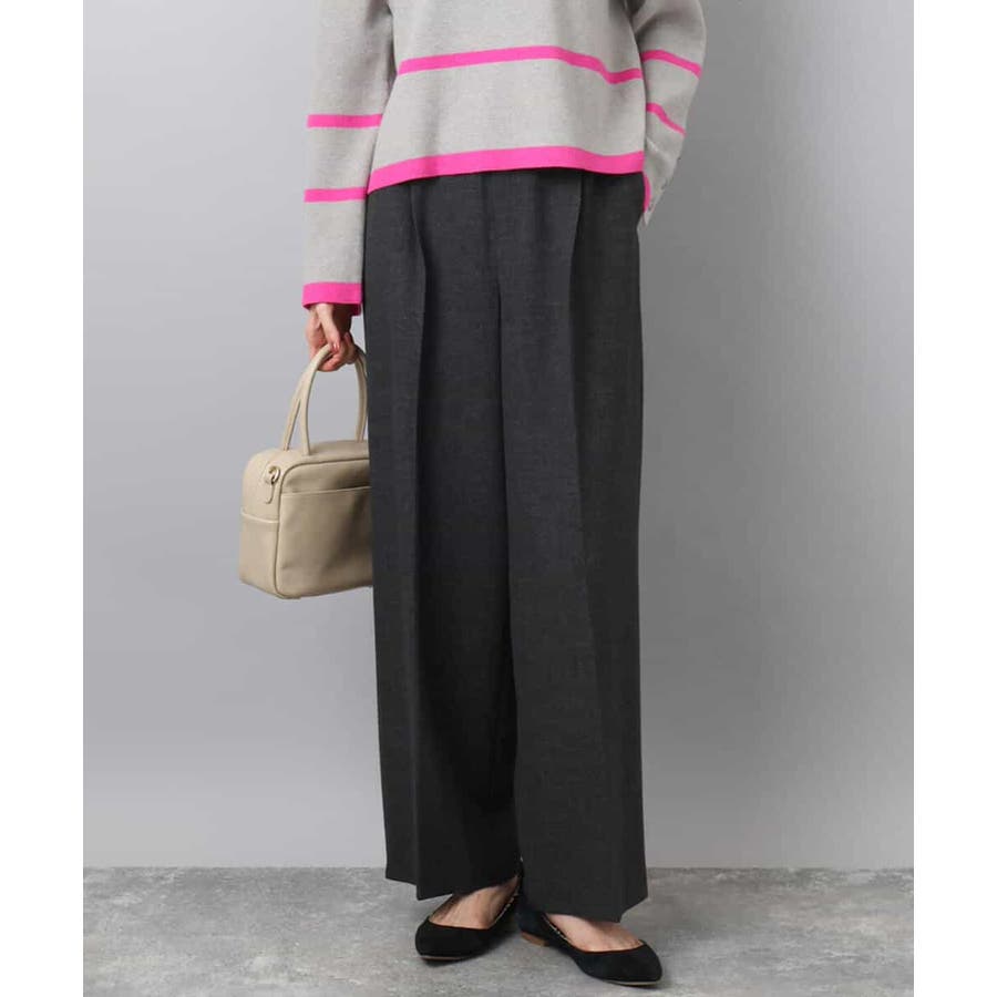 シンプルな美脚シルエットのワイドパンツ。きれいめに着こなしやすい無地見えするツイード調の柄が新鮮な一枚です。フロントタック山が、ウエスト周りのシルエットを隠してくれつつ、山から続きのプレス線を入れることでタテ長効果でスッキリとしたシルエットを実現。脚を綺麗に見せてくれます。ワイドすぎず、細すぎずな程良い分量感が合わせるトップスを選びません。まっすぐ目のベルトカーブにすることでシャープな印象のウエスト周りに。ウエストは動きに沿って伸び縮みする凝った仕様で仕上げ、後ろゴムギャザーを無くし、快適な着心地はそのままに、着用したときよりきちんと感のある見え感に仕上げました。