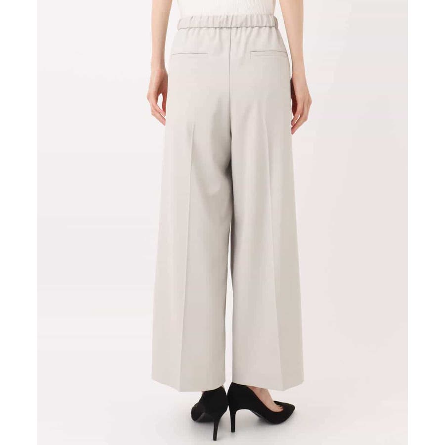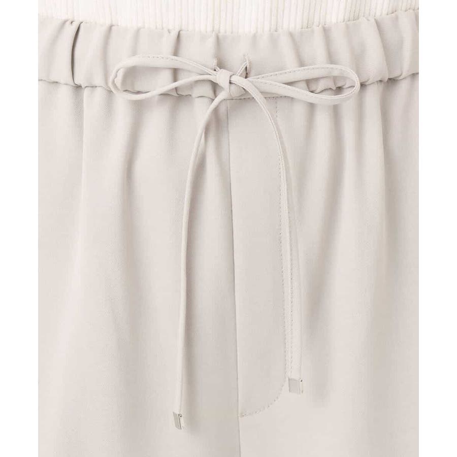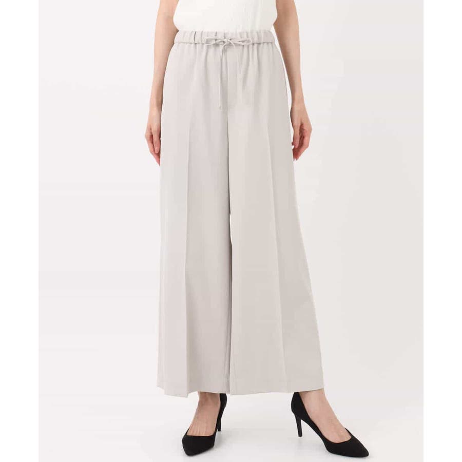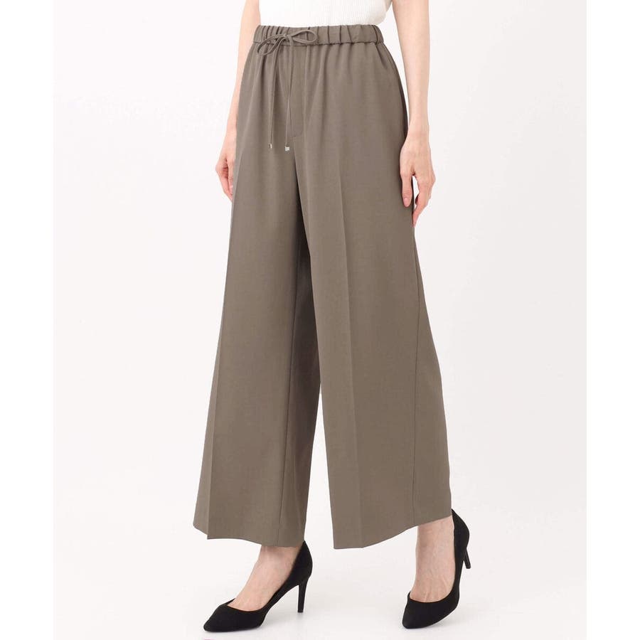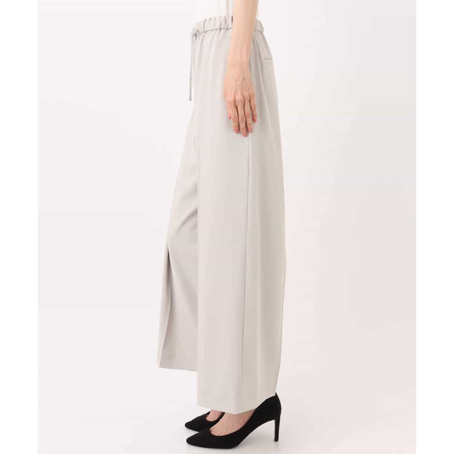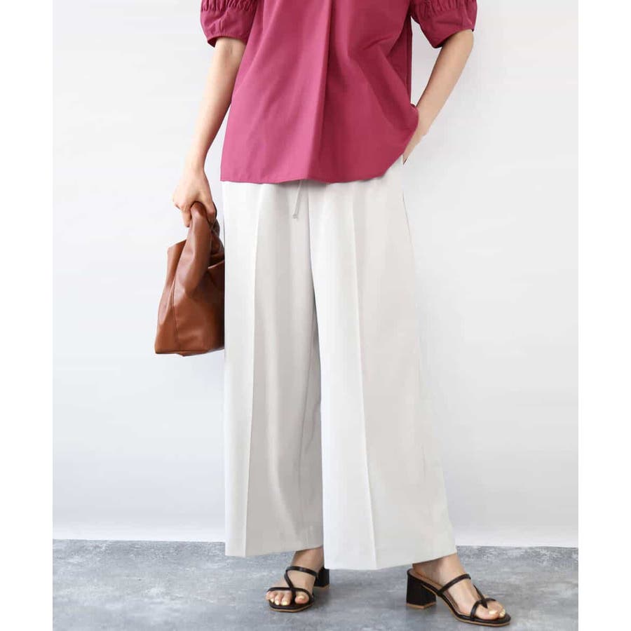 ウエストがドロスト仕様になったリラックス感のあるストレートワイドパンツ。楽な着心地ながら、センタープレス入りですっきりときちんと見えも叶います。