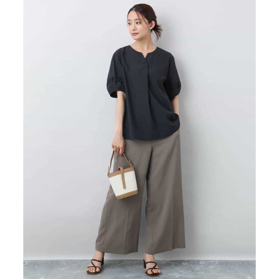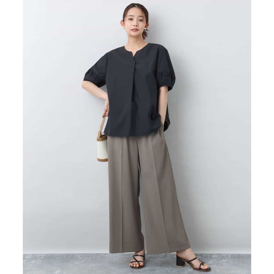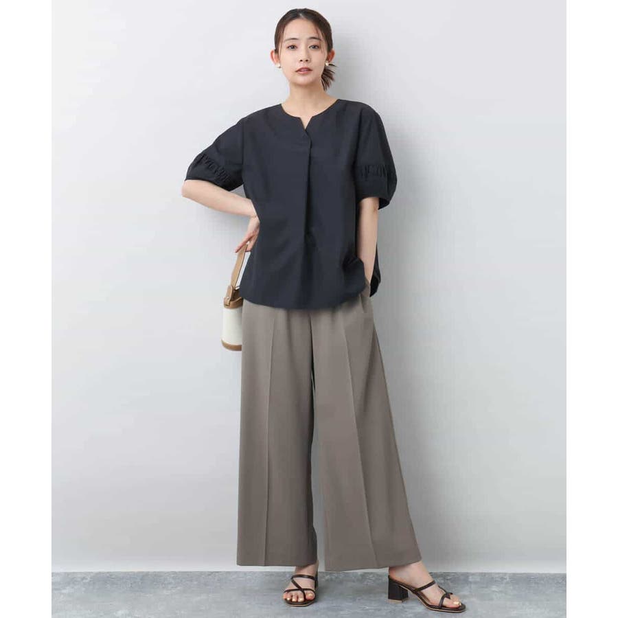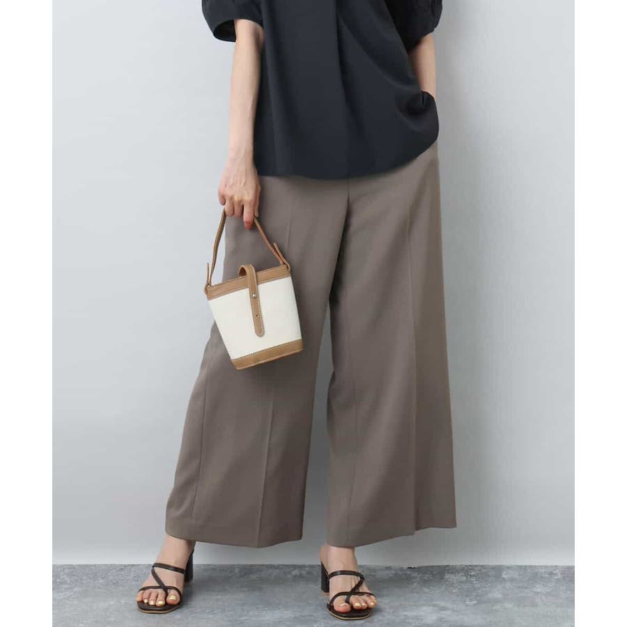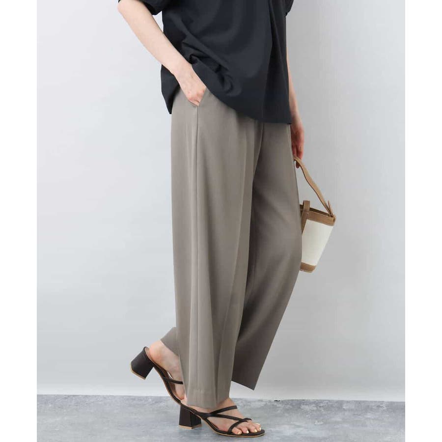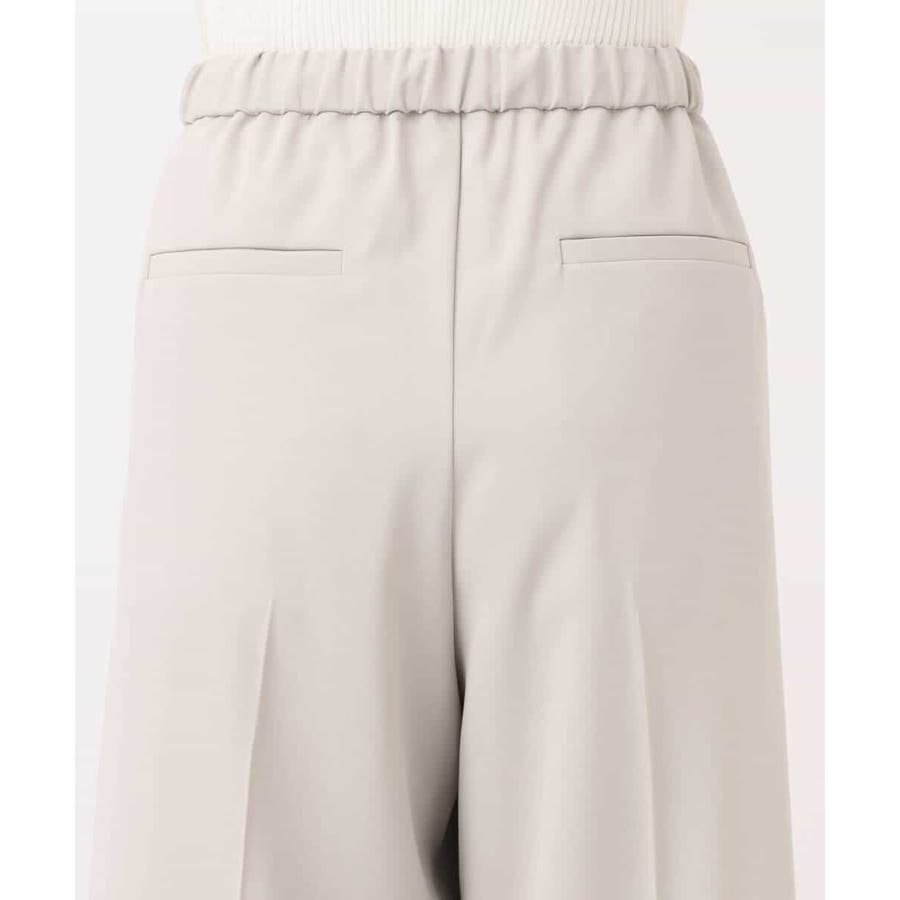 ウエストがドロスト仕様になったリラックス感のあるストレートワイドパンツ。楽な着心地ながら、センタープレス入りですっきりときちんと見えも叶います。