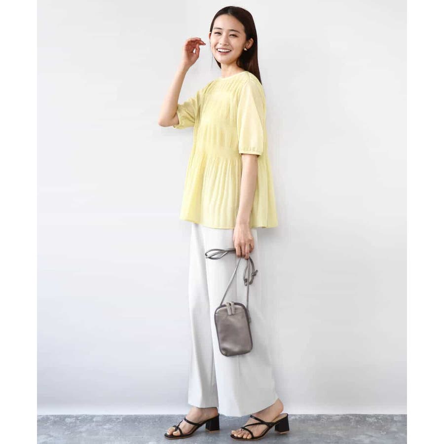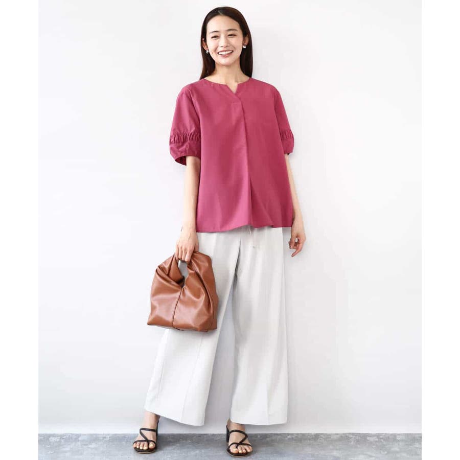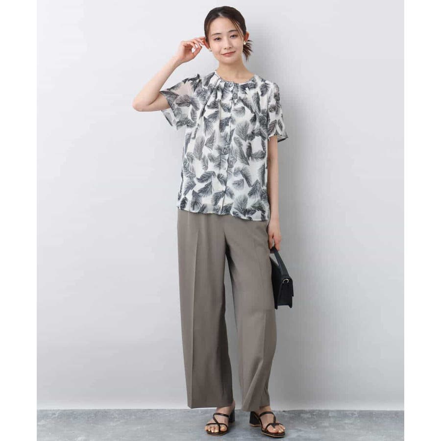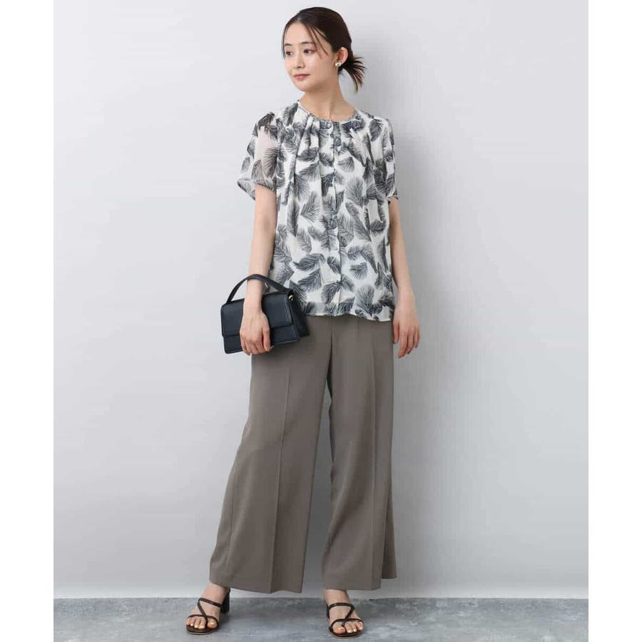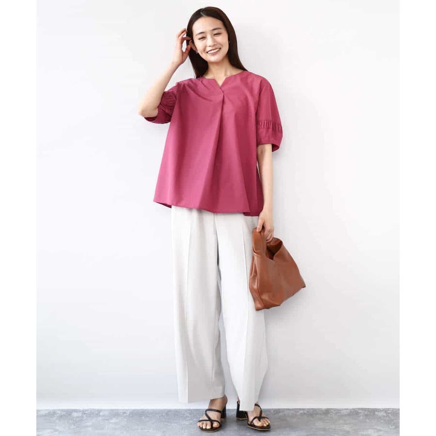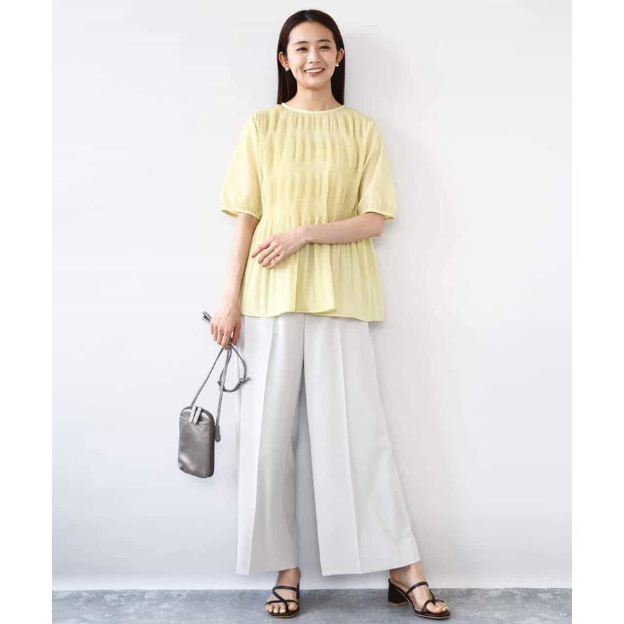 ウエストがドロスト仕様になったリラックス感のあるストレートワイドパンツ。楽な着心地ながら、センタープレス入りですっきりときちんと見えも叶います。