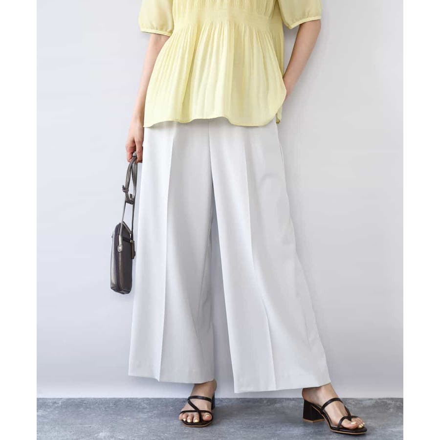 センタープレスのワイドパンツです。リラックス感はありつつキレイ見えします。ウエストはプルオンタイプで紐での調整が可能です。シンプルなシルエットなのでオフィスにもカジュアルにもコーディネートの幅が広がりますよ。接触冷感に加えて速乾・UVカット機能付きの優秀な一枚です。