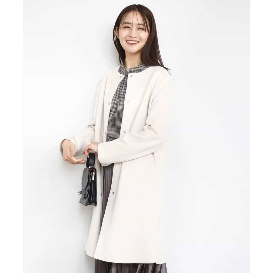 長めの着丈はボトムを選びません。ノーカラーのネックデザインはハイネックやタートルネック、フード付きのパーカーと合わせてもすっきりと着こなせます。