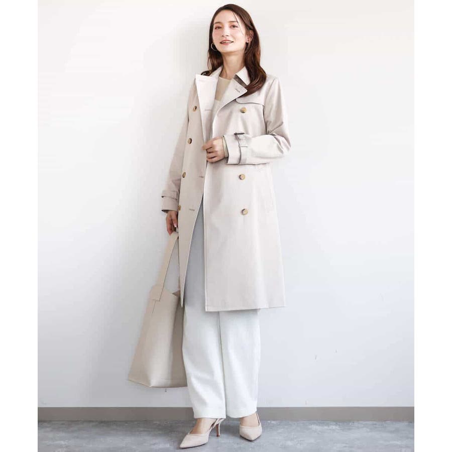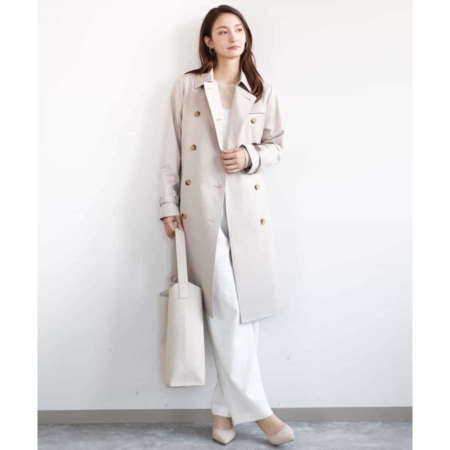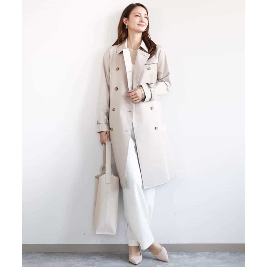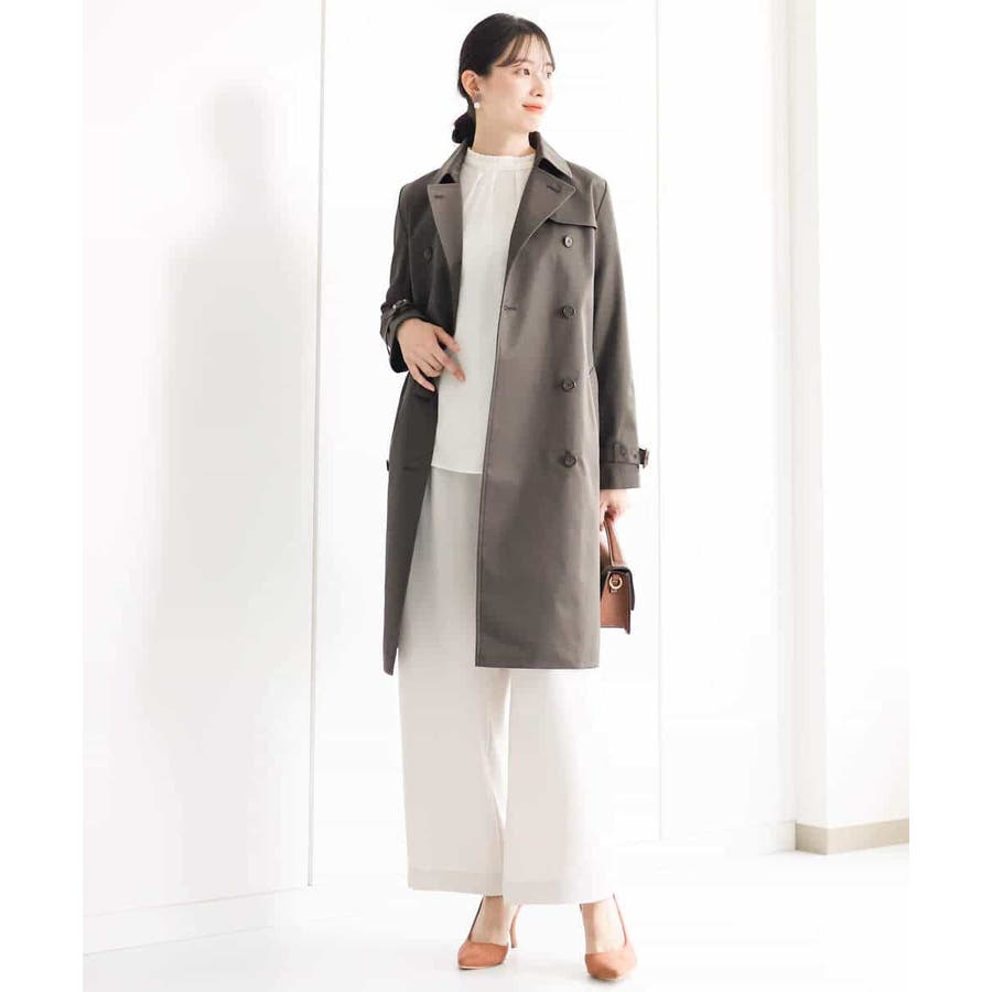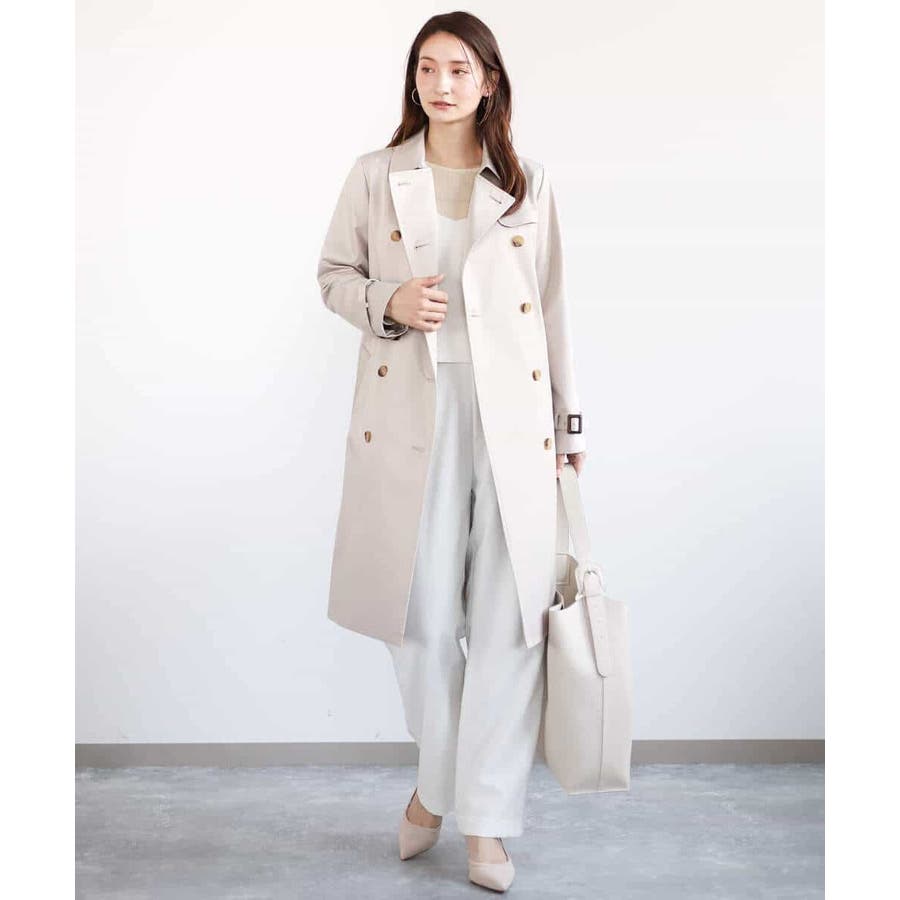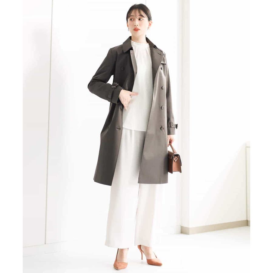 程良いハリと適度なやわらかさのある素材はきちんと感と女性らしさを両方兼ね備えた印象に。春秋どちらも着こなせる素材は、防花粉・撥水加工を施しより快適に。