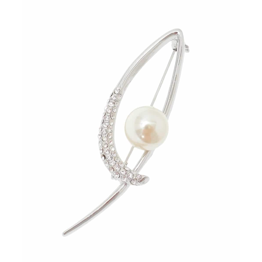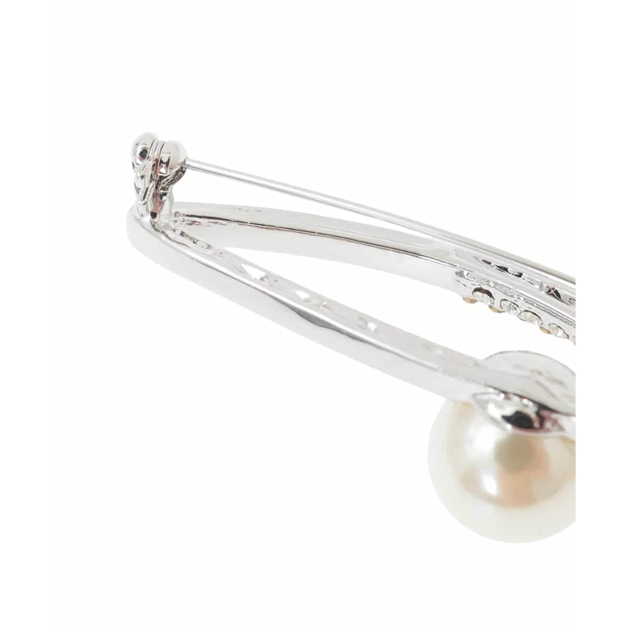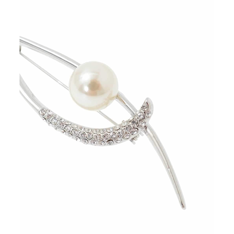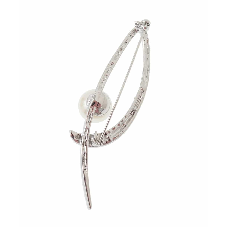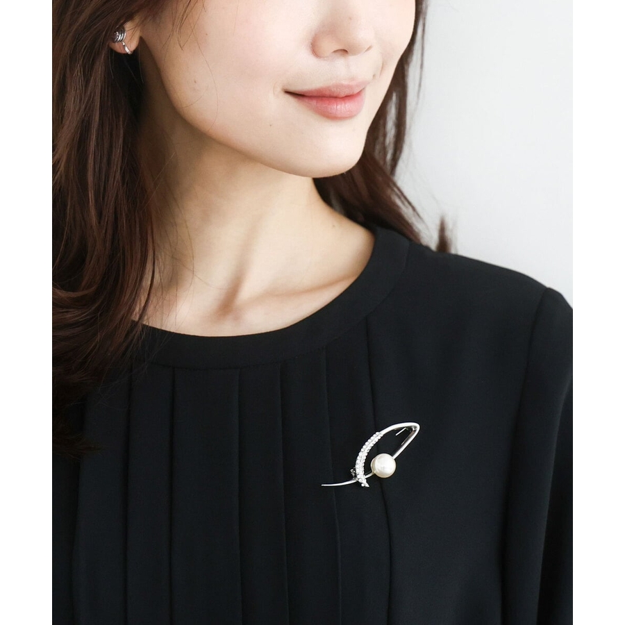 シャープなリーフモチーフのブローチ。ガラスストーンがあしらわれており繊細な輝きに仕上がっています。大きめのイミテーションパールがポイントに。上品さや程よい華やかさをプラスしたいときに、式典やセレモニーなどのオンシーンにもおすすめです。