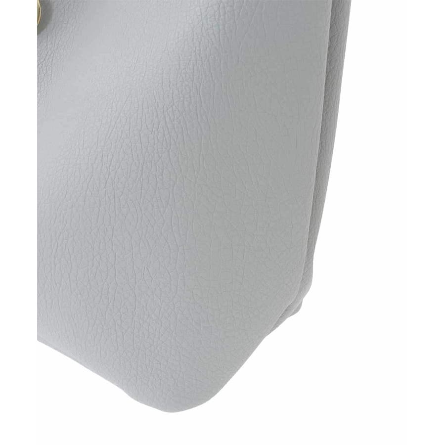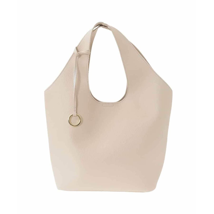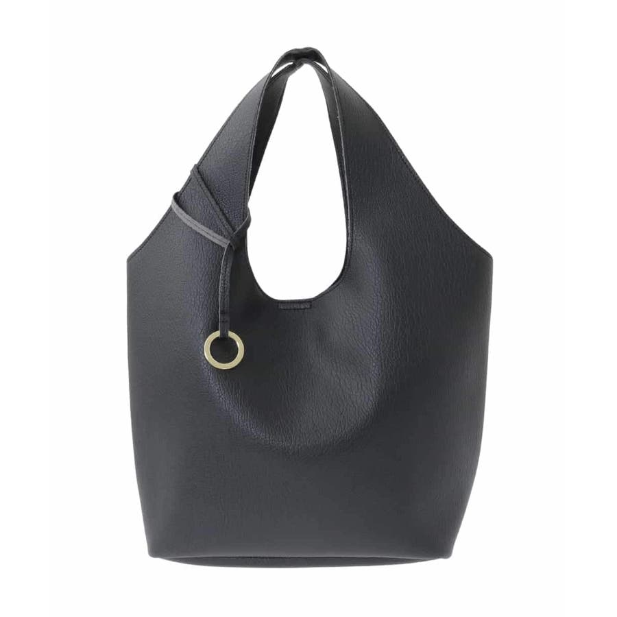ONにもOFFにも合わせやすいトートバッグ。A4サイズの用紙も収納出来るきれいめフォルムです。リングのチャームがきらりと光るアクセントに。お手入れが簡単な合成皮革です。