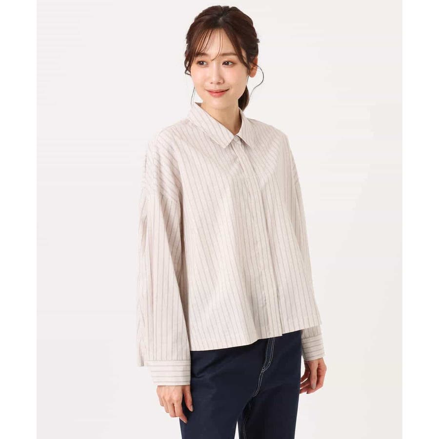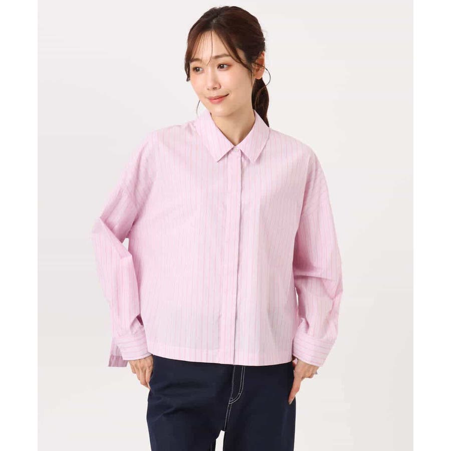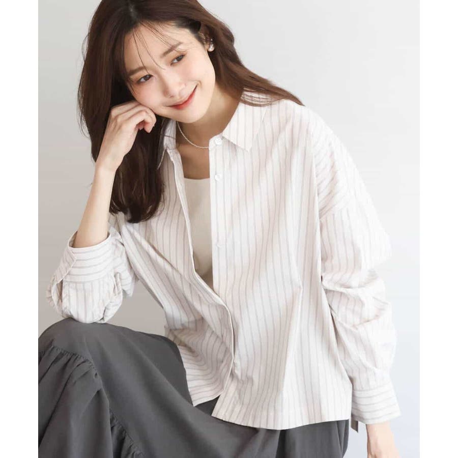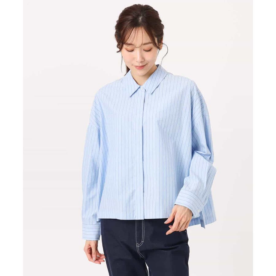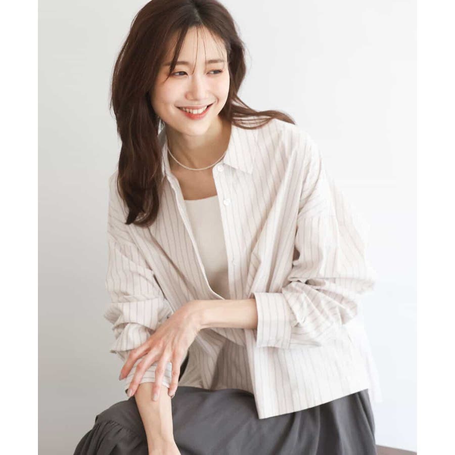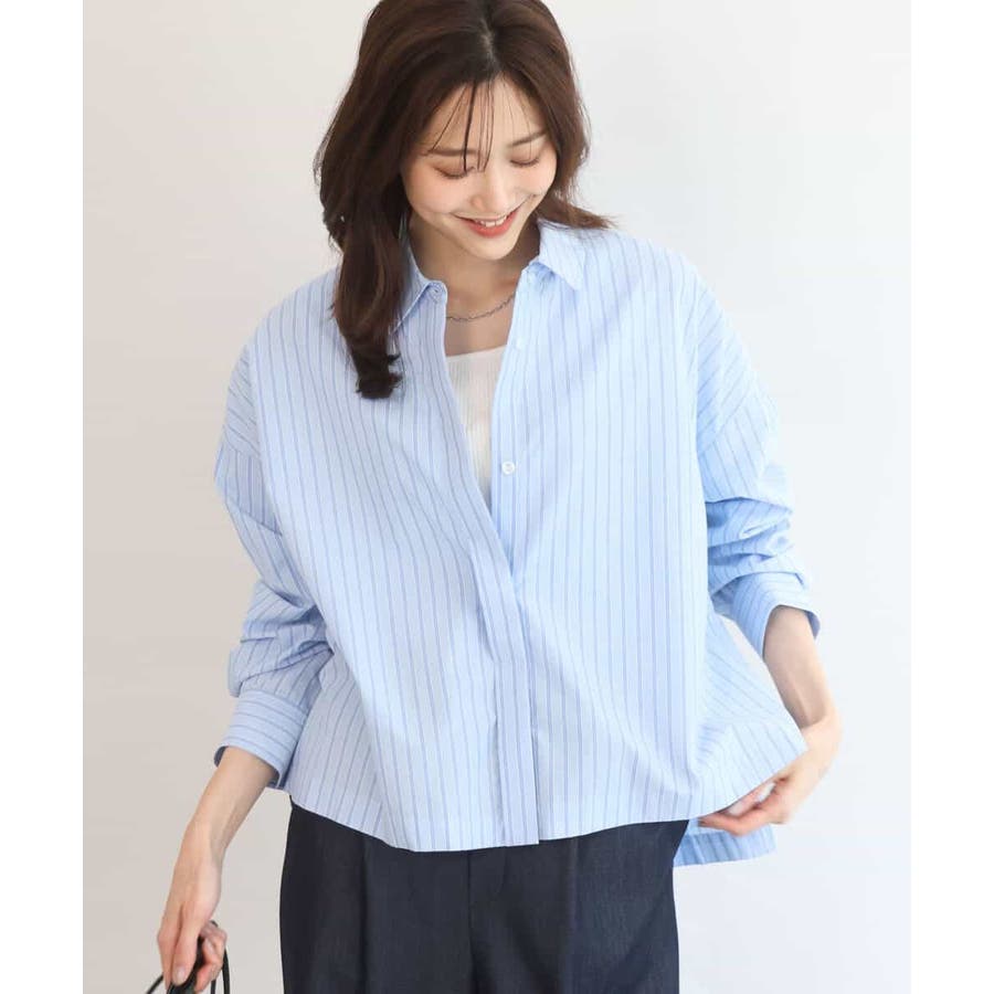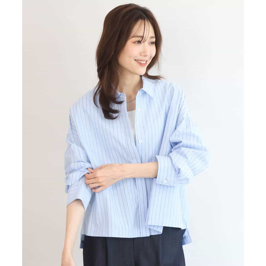 クロップドのコンパクト丈が合わせるボトムを選ばないストライプ柄シャツブラウス。シンプルなデザインは着丈に前後差を付け、こなれた印象に仕上げました。
