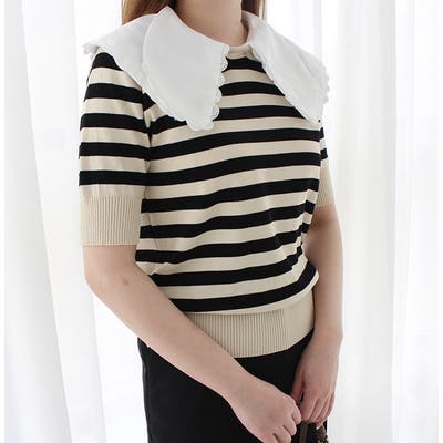 ダブルフリルセーラーカラーニットトップス レディース トップス ニット スプリングニット サマーニット 付け襟 ビッグカラー ブラック ボーダー ベージュ 春コーデ 夏コーデ きれいめ カジュアル 大人カジュアル シンプル かわいい トレンド らくちん ママ 韓国ファッション 2022SS 10代 20代 30代 40代 50代 60代 MODEROBE モードローブ