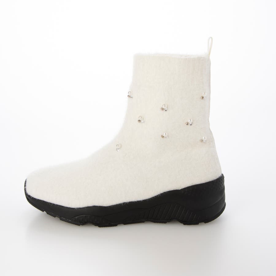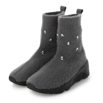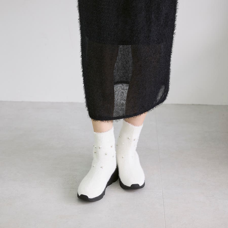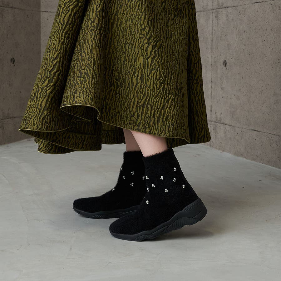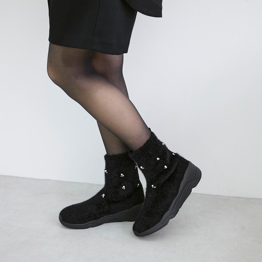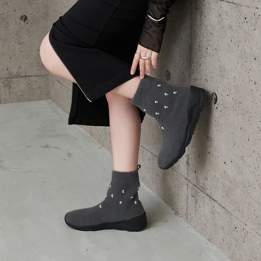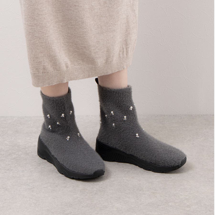 上品なビジューパーツが目を惹くニットブーツ。