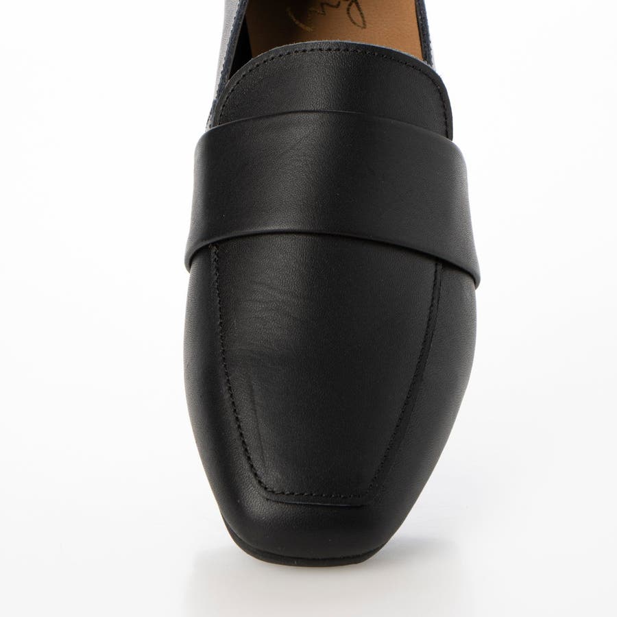ゆったりとしたスクエアトゥに、甲深めカットラインで足をしっかり包み込んでくれます。