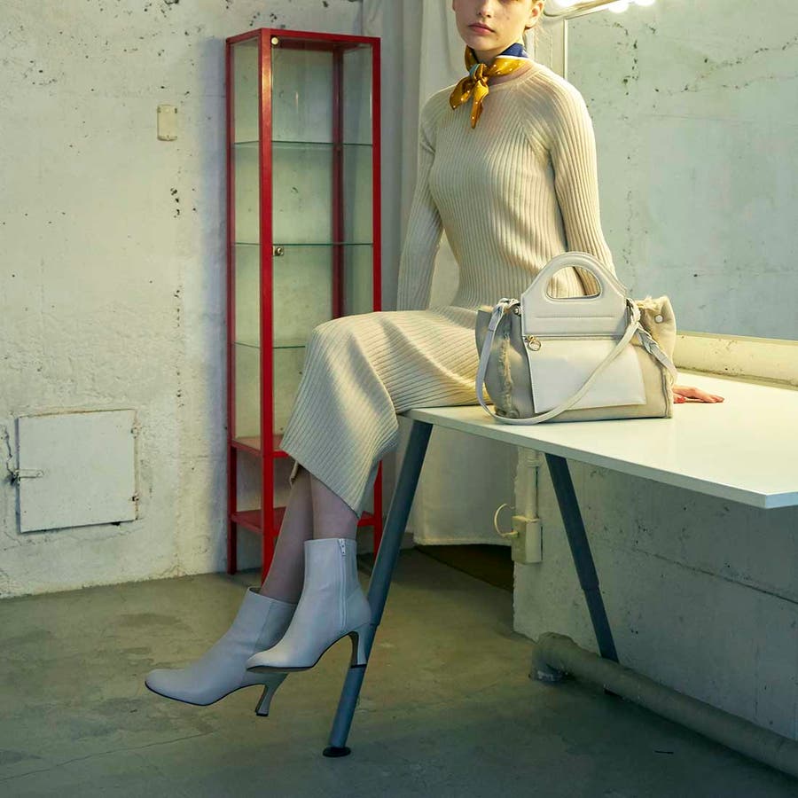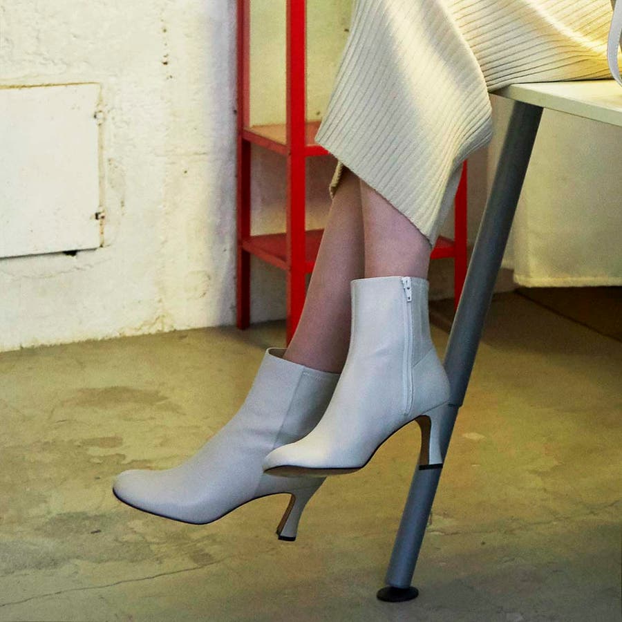 シャープなスクエアトゥと華奢で個性的なヒールが大人っぽさを演出。
