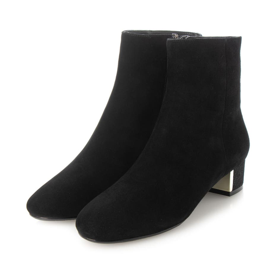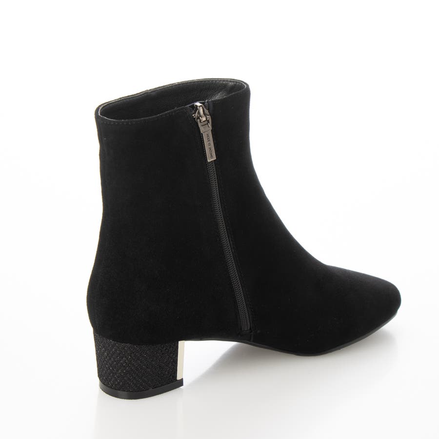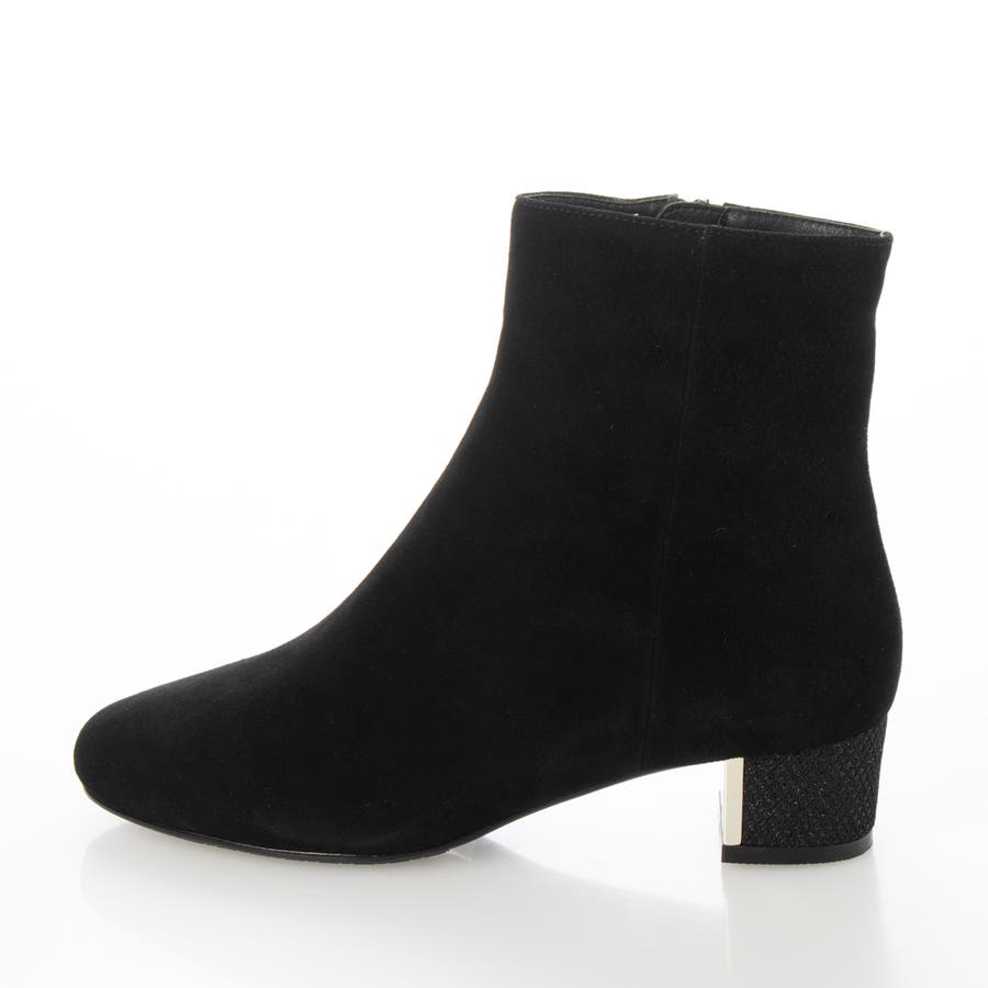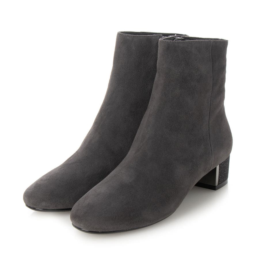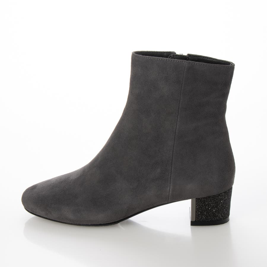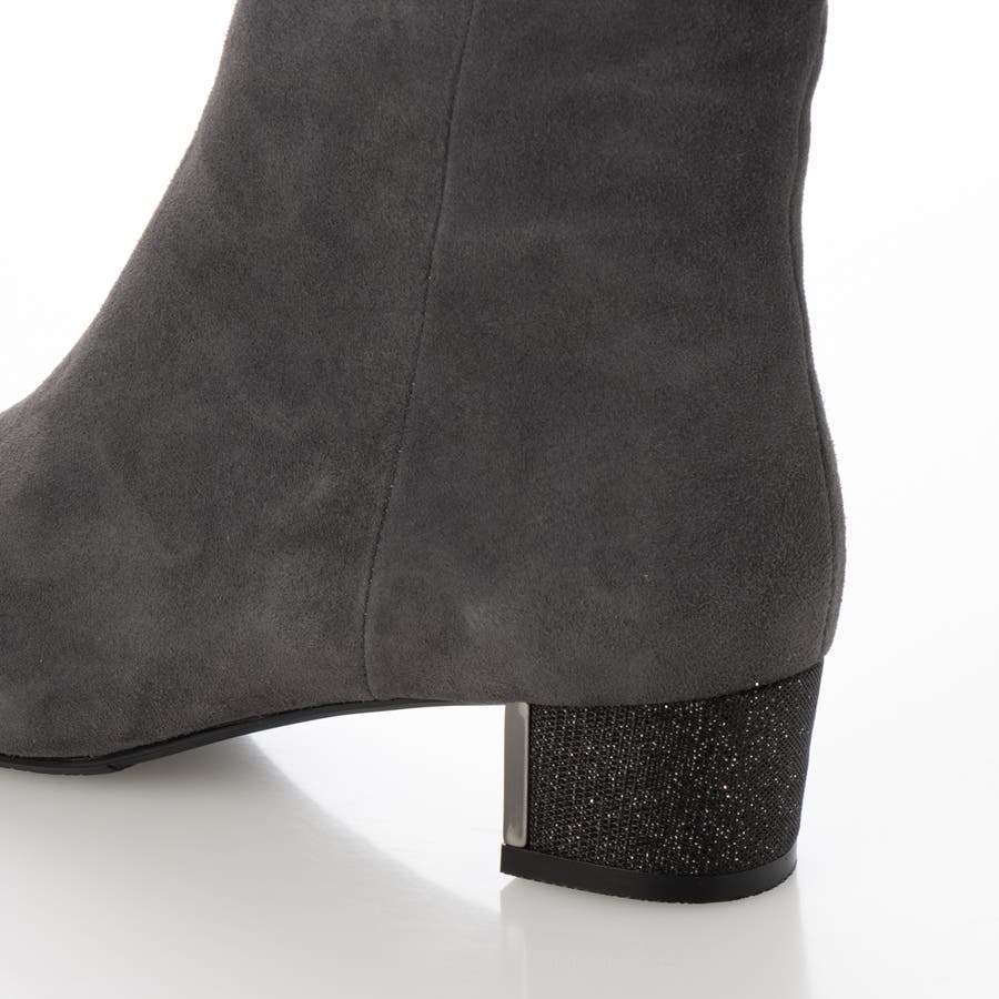 シープスエードのアッパーにグリッターヒールをあしらったショートブーツ。