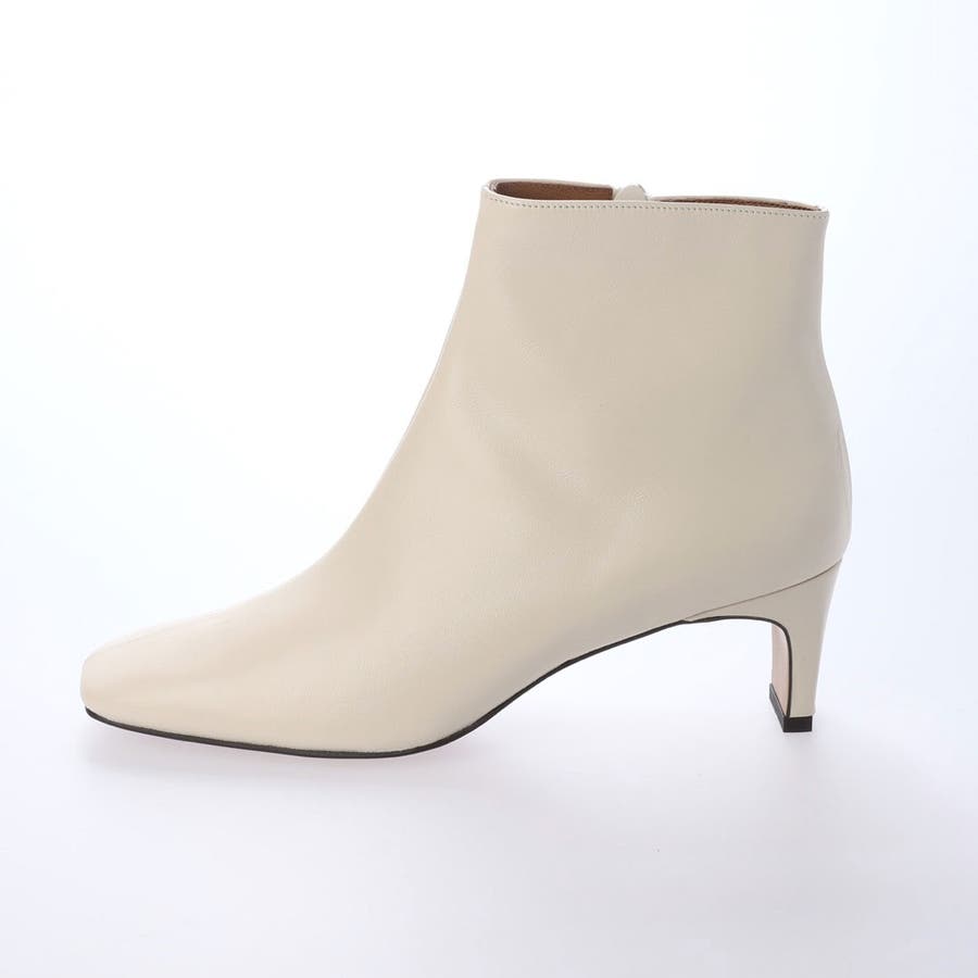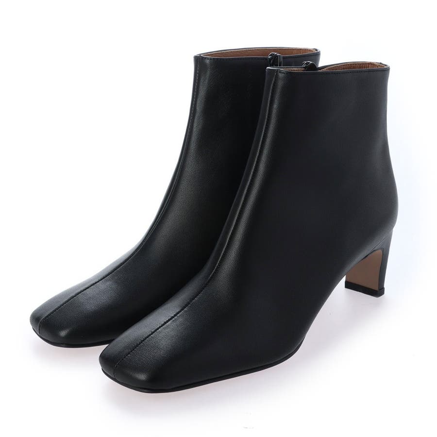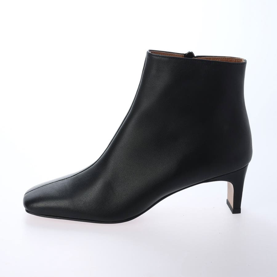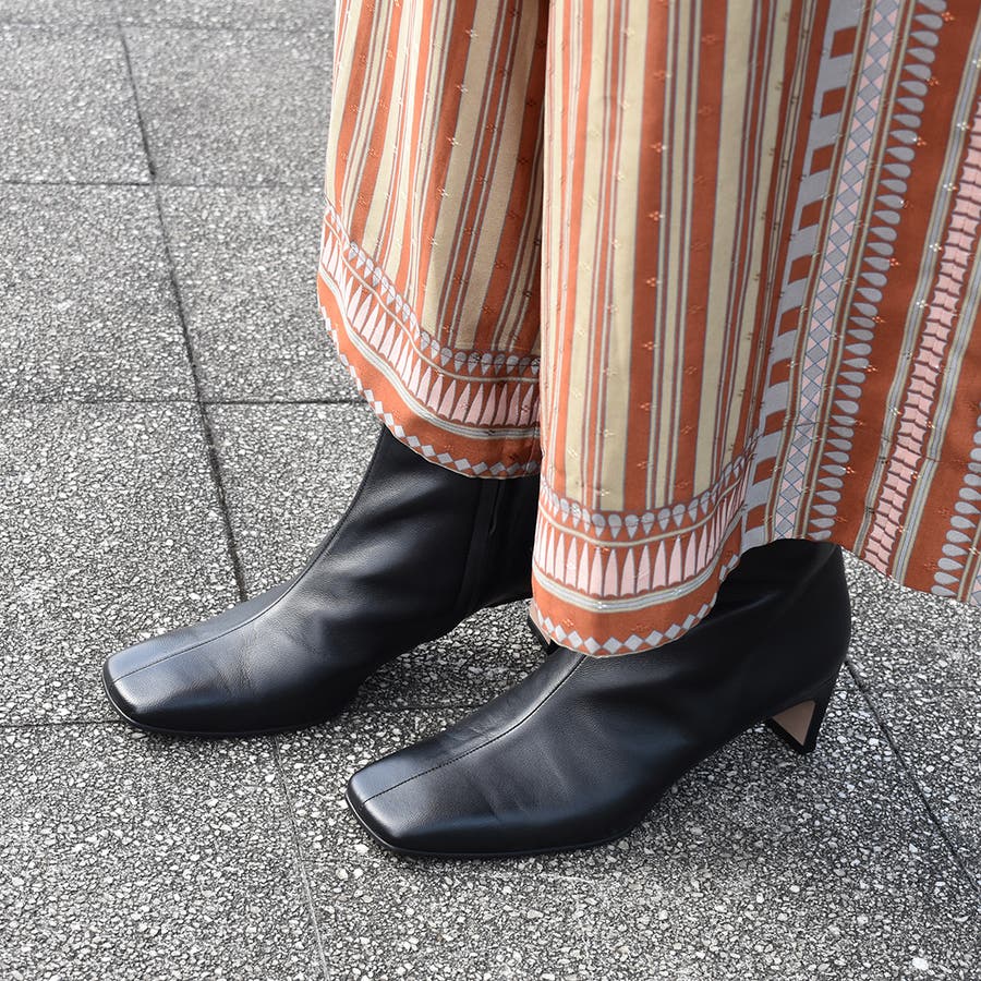 すっきりした幅広スクエアトゥと、幅広でも見た目華奢なヒールでよりモードな雰囲気のショートブーツ。