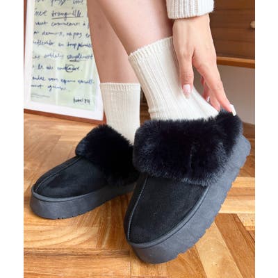 ・ボリューミーなファー使いが目を惹く、履き心地抜群なフェイクムートンスリッポン。