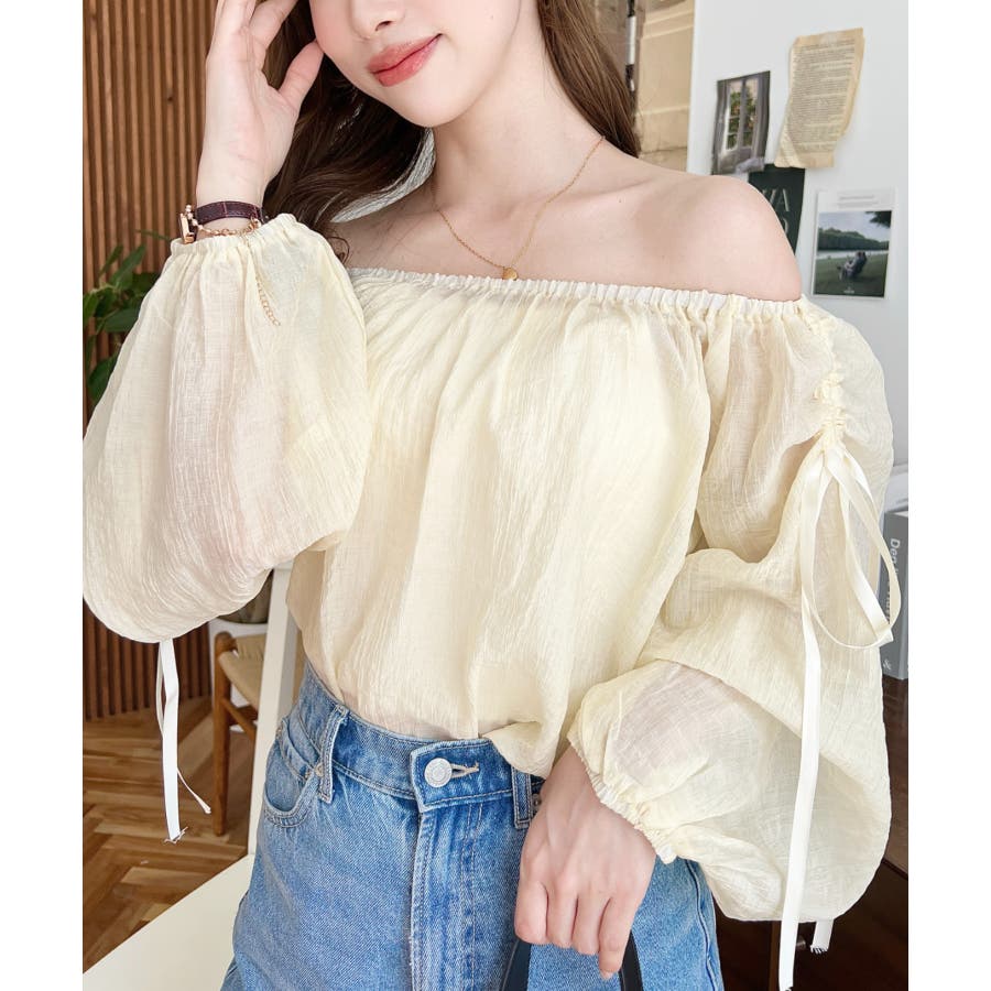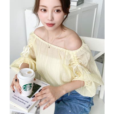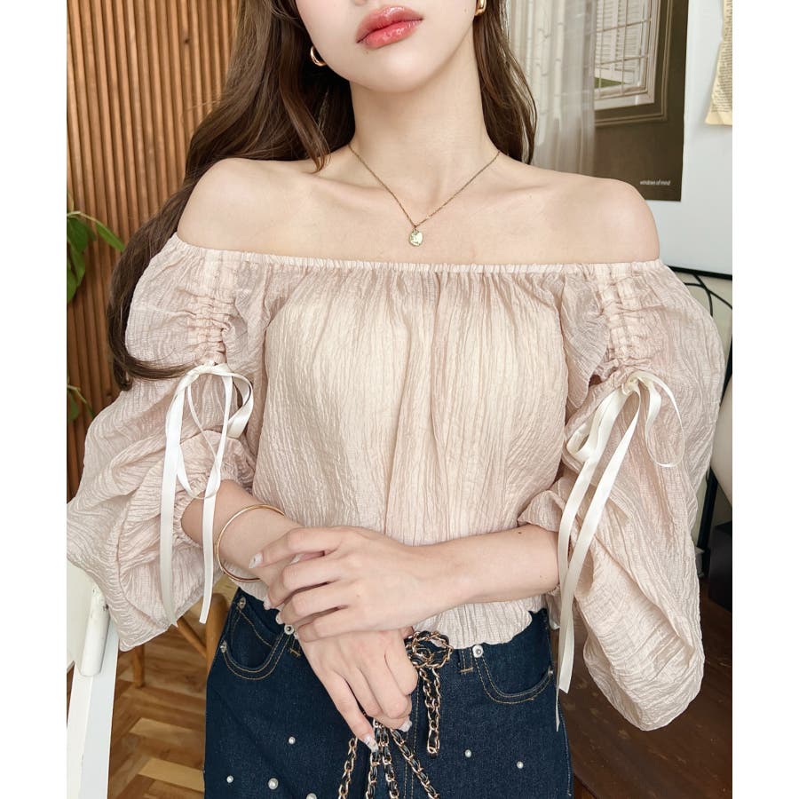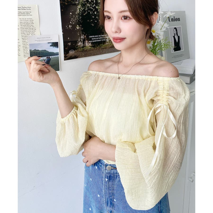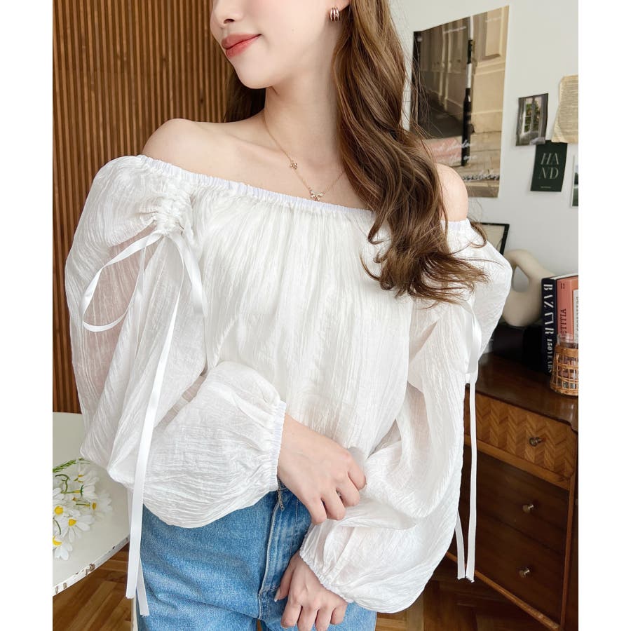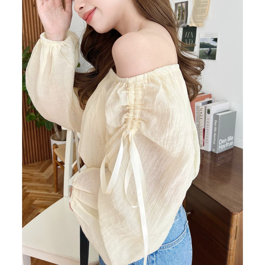 ショルダーシャーリングリボンオフショルブラウス