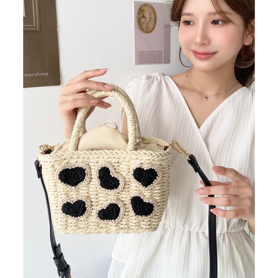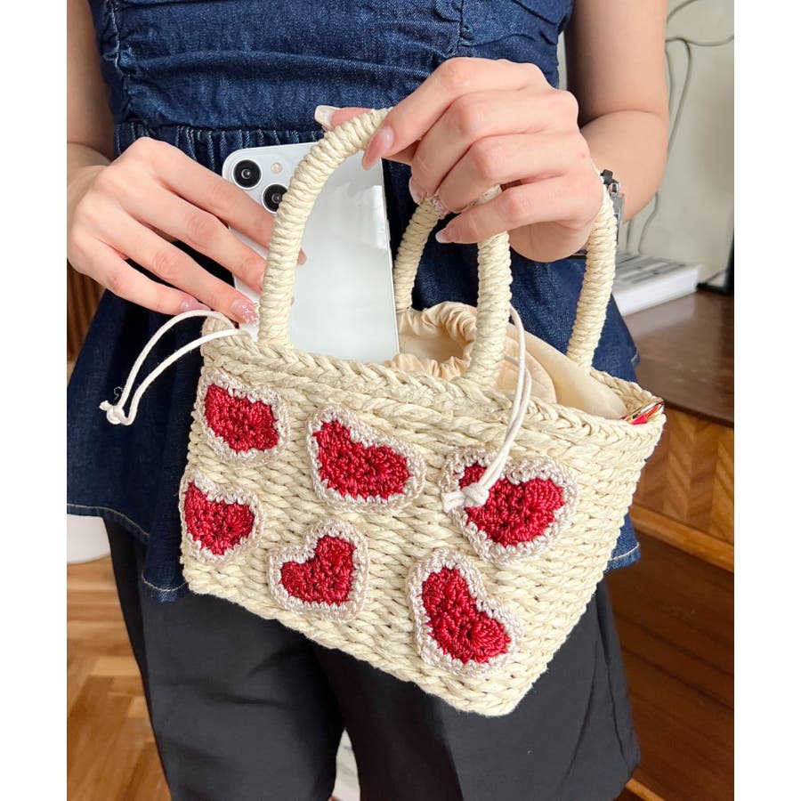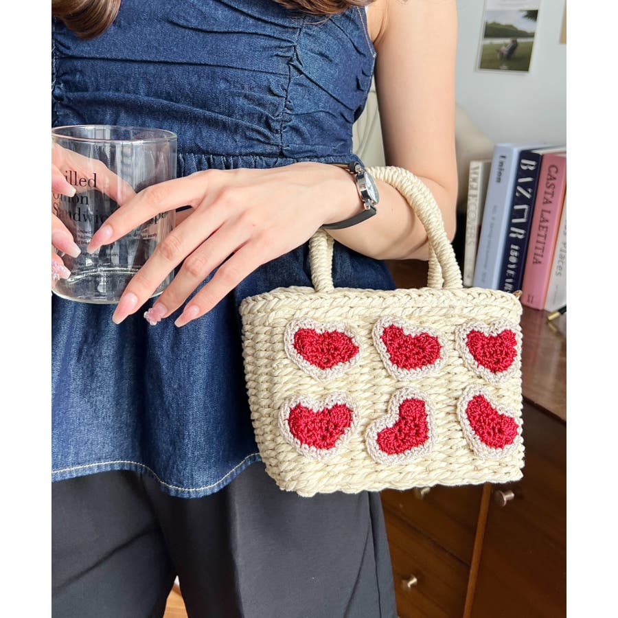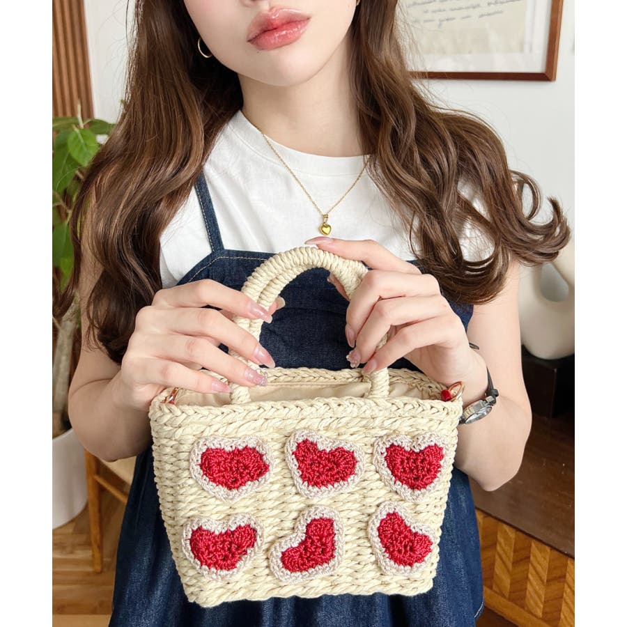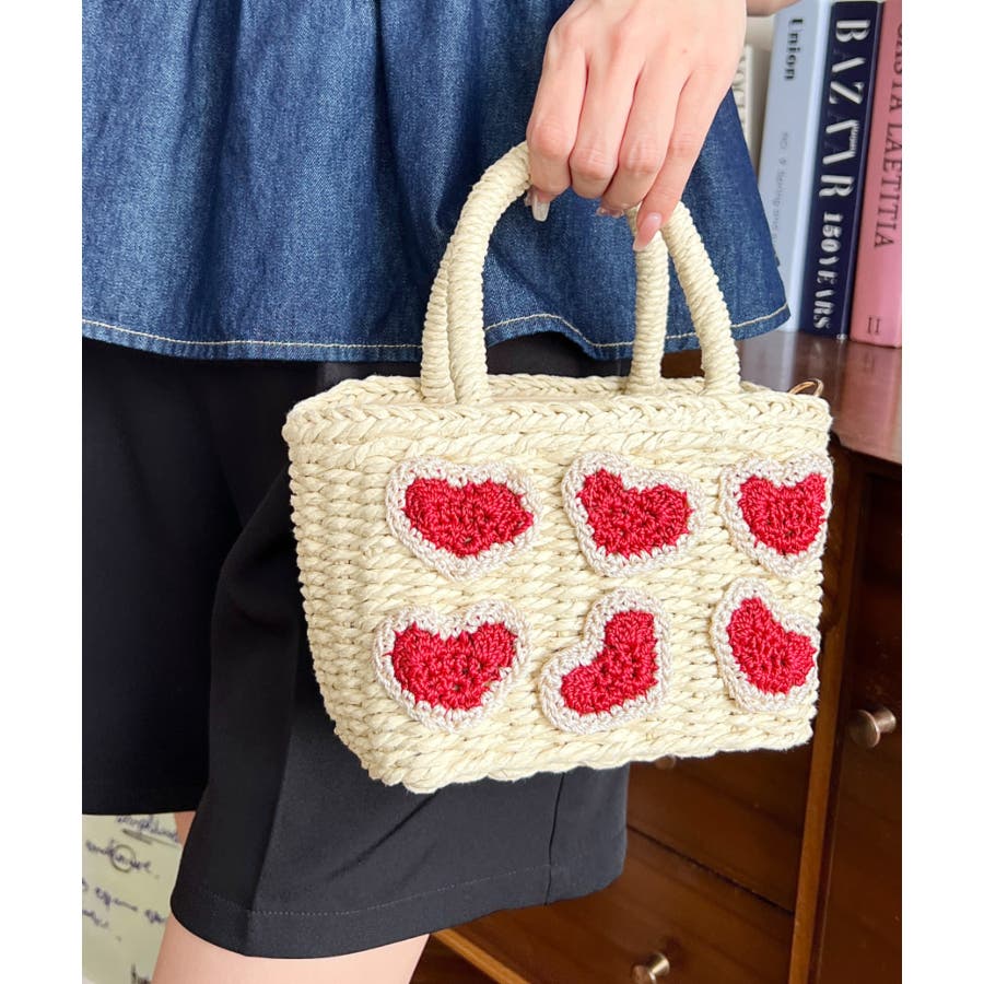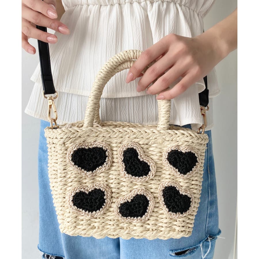 ・ペーパー素材を使用したトートバッグ。表部分のハートデザインがポイント。シンプルになりがちな夏のスタイリングにかわいい女性ぽっさに仕上げてくれるひと品です。